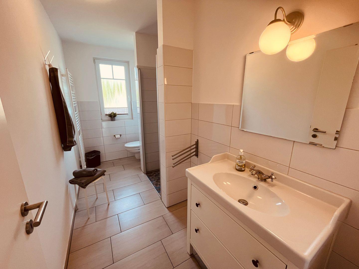bodengleicher Dusche.Die Terrasse ist mit Gartenmöbeln und einem Sonnenschirm