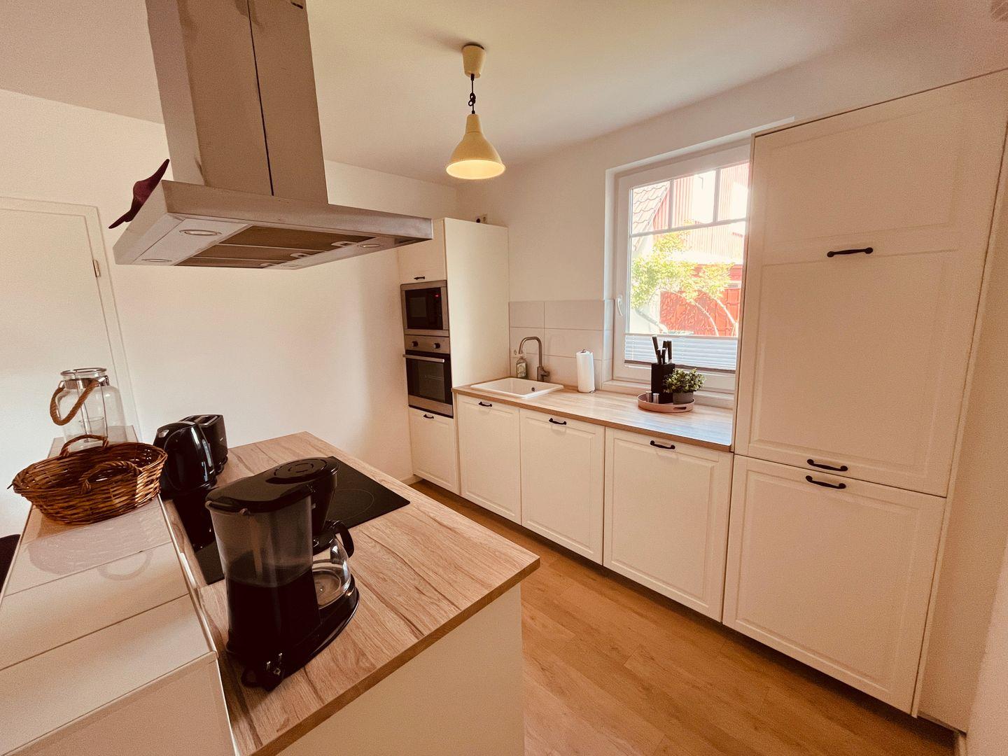angrenzenden voll ausgestatteten Küche mit Herd, Backofen, Kaffeemaschine etc.