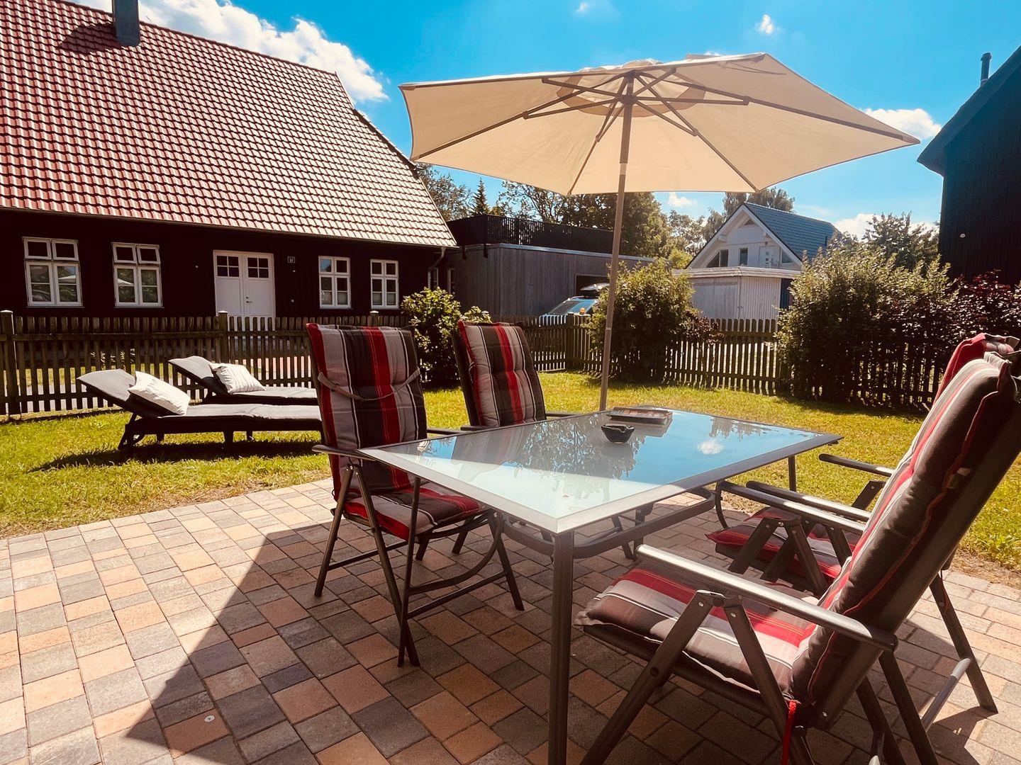 einem Bad mit Dusche. Die Terrasse ist mit Gartenmöbeln, einem Grill und einem