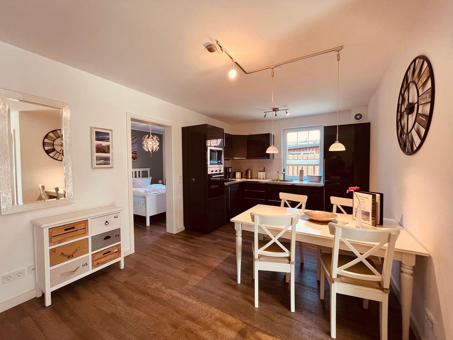 ausgestatteten Küche mit Herd, Backofen, Kaffeemaschine und Essecke, sowie zwei