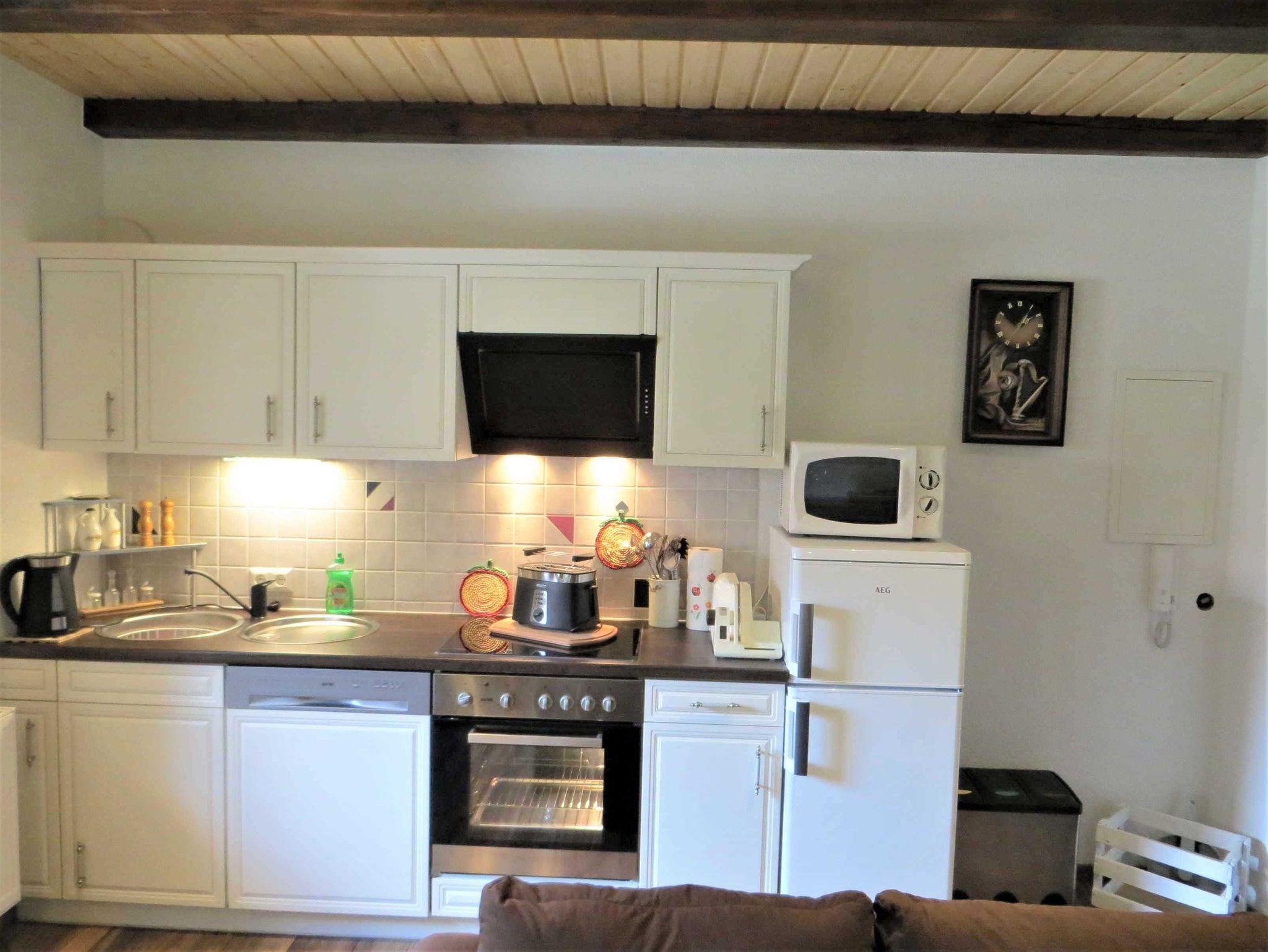 Die Ferienwohnung befindet sich in der unteren Etage des Objektes und ist mit nur einer kleinen Stufe begehbar. Sie bietet Ihnen ein Wohnzimmer mit einer Sitzecke, die für gemütliche Stunden sorgt. Eine integrierte und voll ausgestattete Einbauküche steht Ihnen für den Aufenthalt zur Verfügung. Das kleine Schlafzimmer ist mit 2 einzeln stehenden Betten und einem Babybeistellbett ausgestattet. Dusche und Schlafzimmer wurden erst vor kurzem renoviert und modernisiert. Die Erneuerung der Bilder ist in Arbeit.