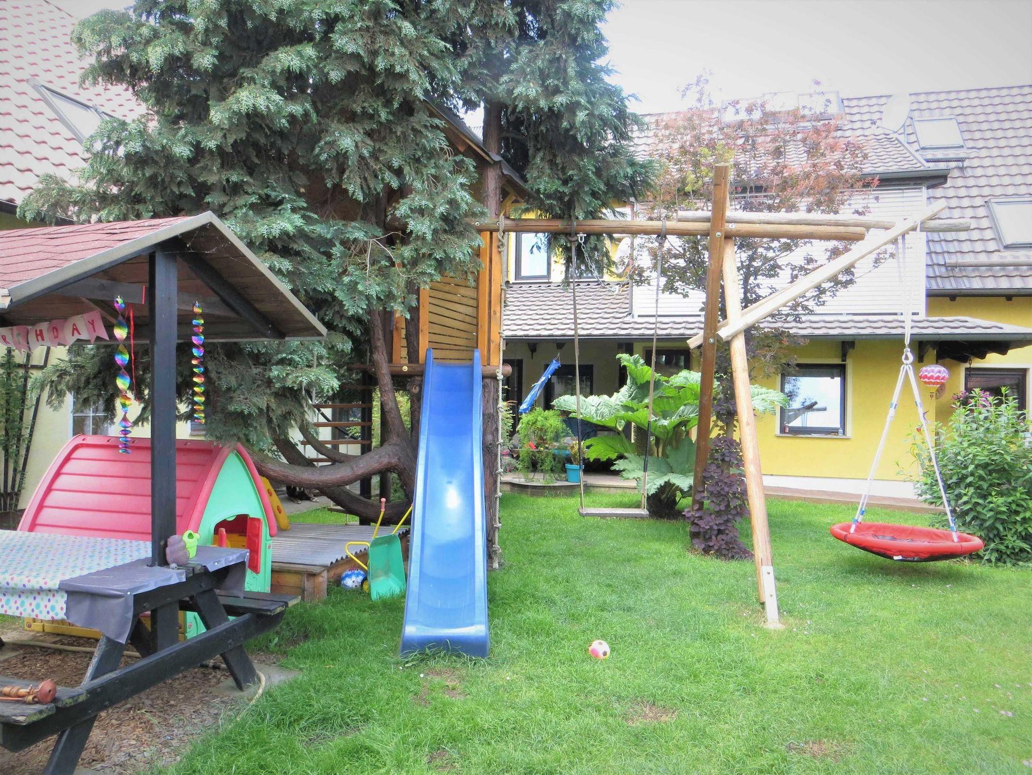 Im Haus der Gastgeber befinden sich zwei gemütlich eingerichtete Ferienwohnungen, die jeweils über eine eigene möblierte Terrasse verfügen. Auf dem umzäunten Grundstück können Gäste Ruhe und Privatsphäre genießen. Für Familien mit Kindern steht ein kleiner Spielplatz mit Rutsche, Schaukel und Spielhäuschen bereit. Die gepflegte Gartenanlage lädt zum Entspannen im Grünen ein. Parkmöglichkeiten sind für Gäste vorhanden. Durch die ruhige Lage inmitten der Oberlausitz ist die Unterkunft ein idealer Ausgangspunkt für Ausflüge in das Lausitzer Seenland und die umliegende Natur.