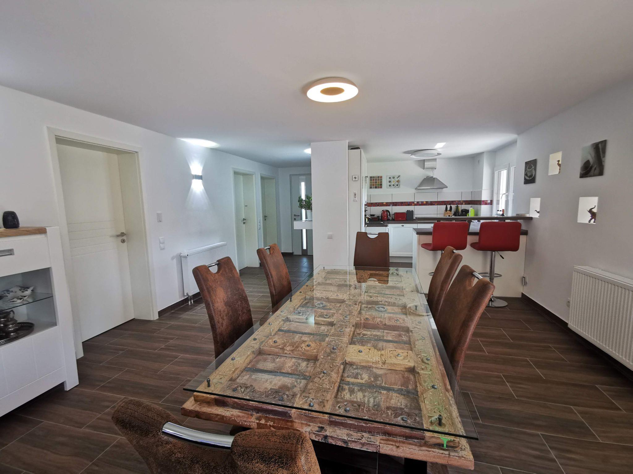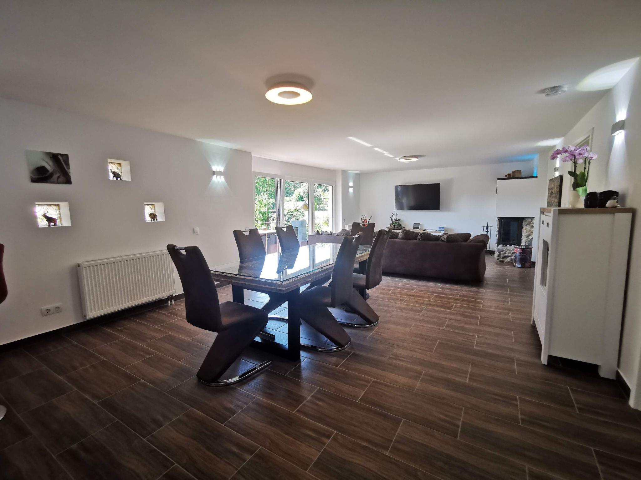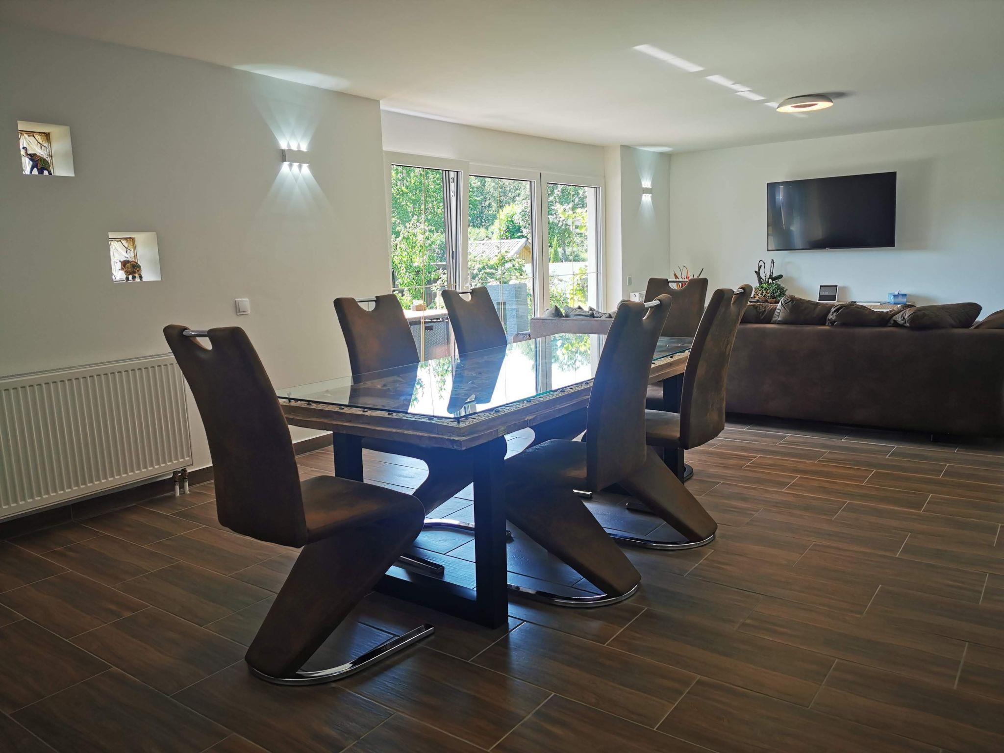 The living room offers a large, cosy sofa with seating for up to 6 people, a wood-burning stove (firewood is provided free of charge in winter) and a 55-inch UHD Smart TV. You can enjoy a glass of wine together with family or friends in front of the fireplace or end the evening with a film. A Netflix account is available on request for the duration of your stay. The dining area is furnished with a large glass table with six comfortable chairs. A high chair for children is available on request.