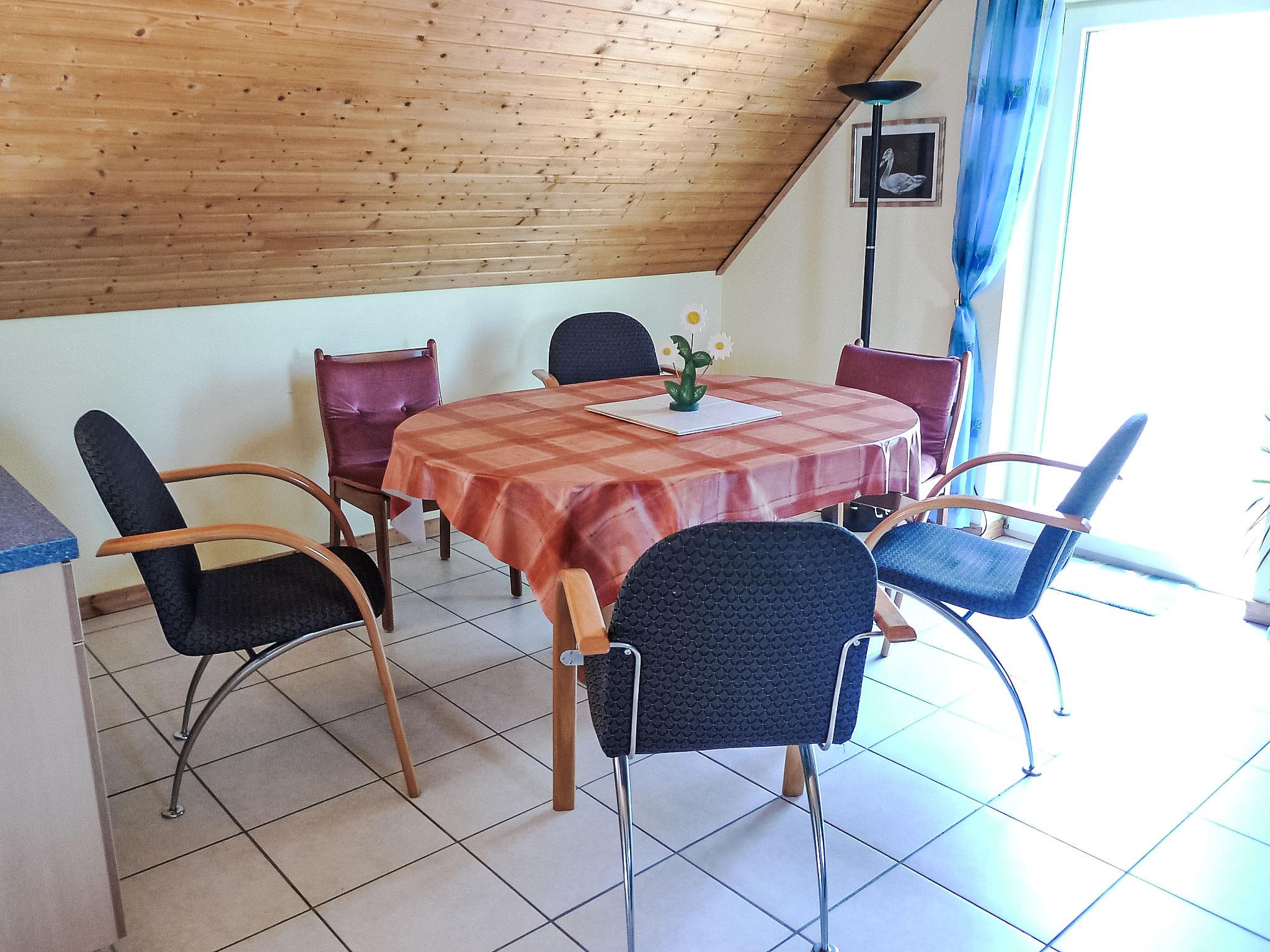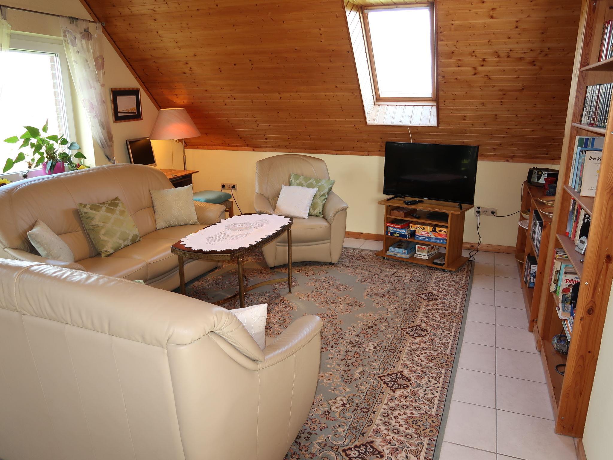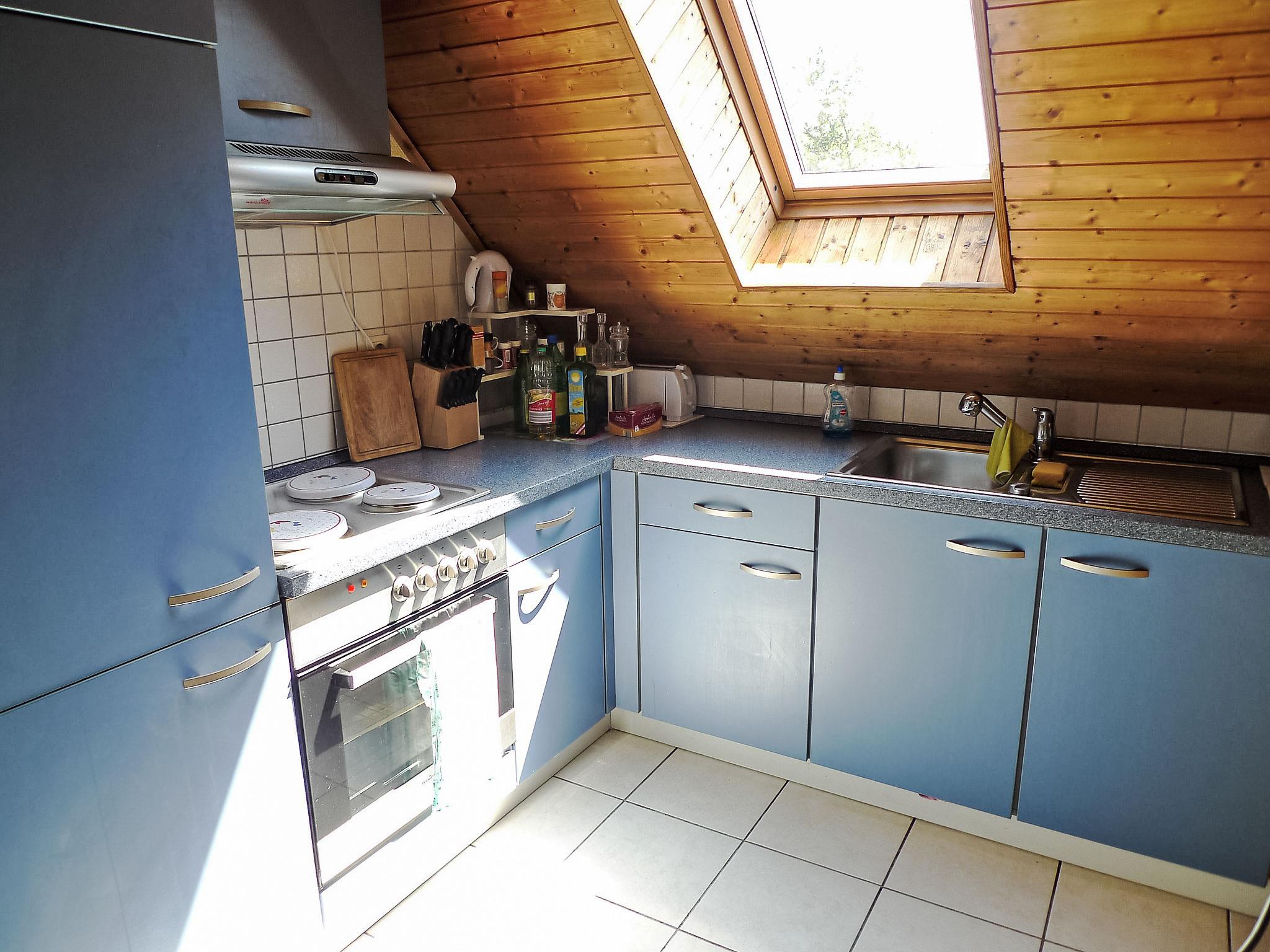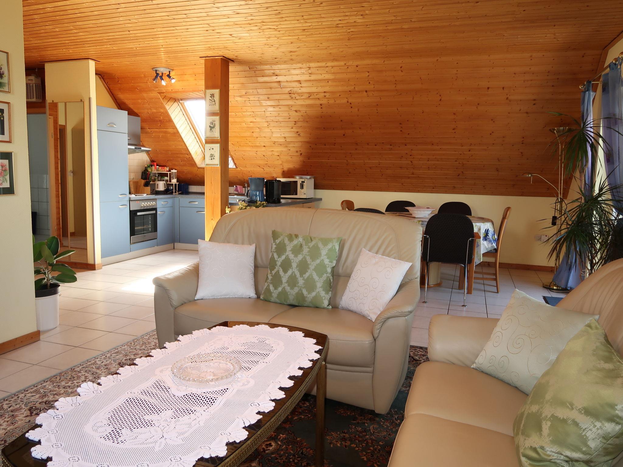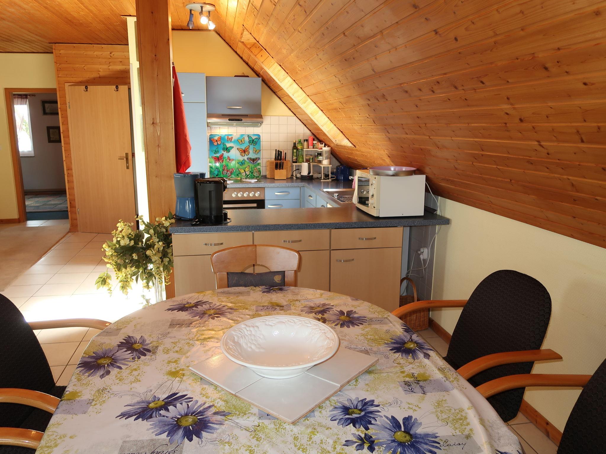 4-room apartment 120 m2 on 2 levels, on the upper floor. Cosy furnishings: living/dining room with satellite TV and hi-fi system. 1 double bedroom. Open kitchen (4 hot plates, oven, dishwasher, microwave, electric coffee machine). Shower/WC. Top floor: 2 rooms with sloping ceilings, each room with 2 beds. Terrace 25 m2. Terrace furniture, electric barbecue (portable). Beautiful view of the countryside. Facilities: washing machine, dryer, telephone. Internet (WiFi, free). Please note: non-smokers only. Maximum 2 pets/ dogs allowed. Smoke alarm, fire extinguisher. Roof terrace for sole use. DE40791