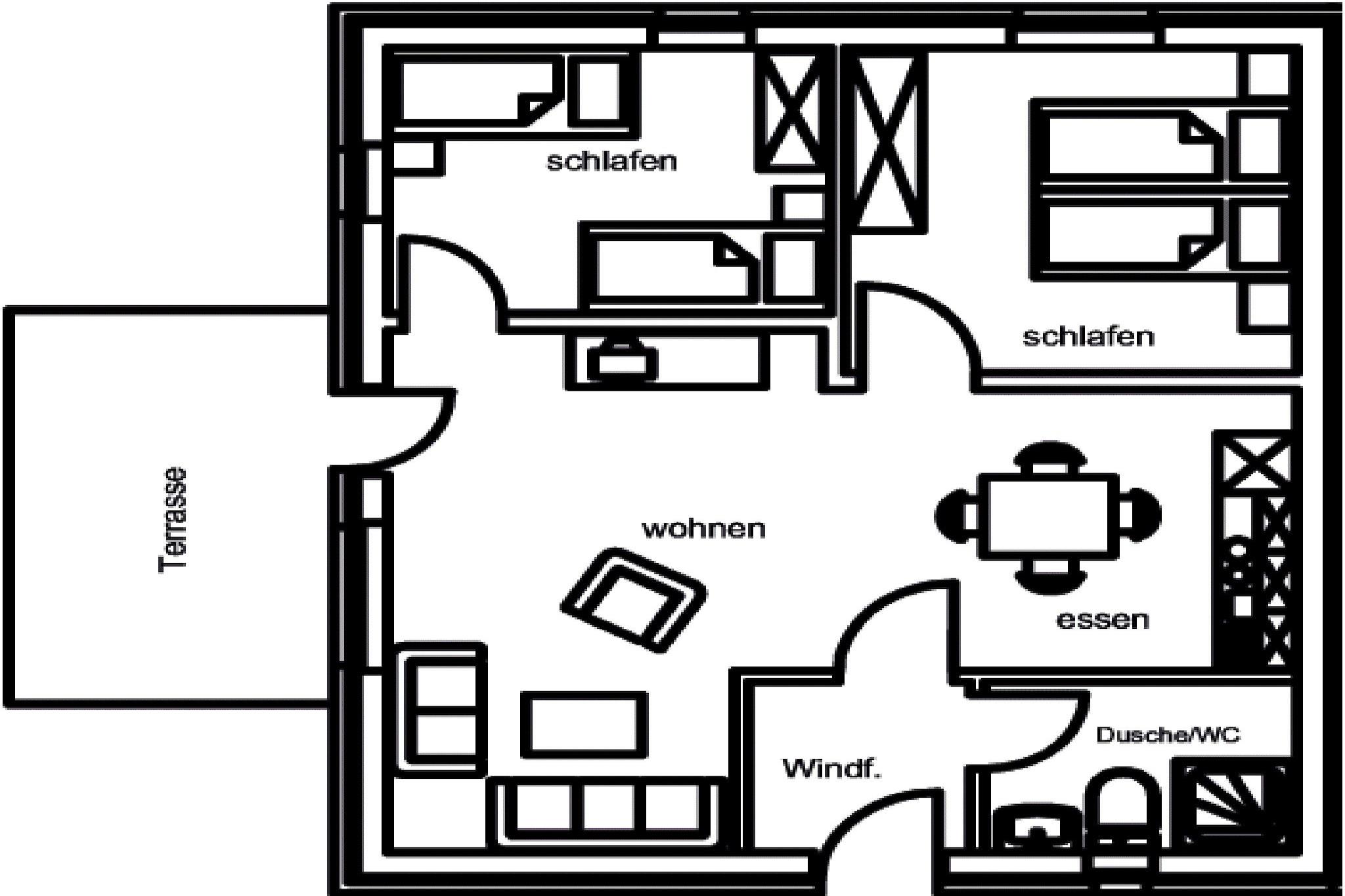 Stueetage: (entre, Stue(Fjernsyn(parabol)), Køkken(ovn), soveværelse(dobbeltseng eller 2 enkeltsenge Senge), soveværelse(2x enkeltseng), badeværelse(bruser, håndvask, toilet)) terrasse, havemøbler, swimmingpool(deles med andre gæster), barneseng, barnestol