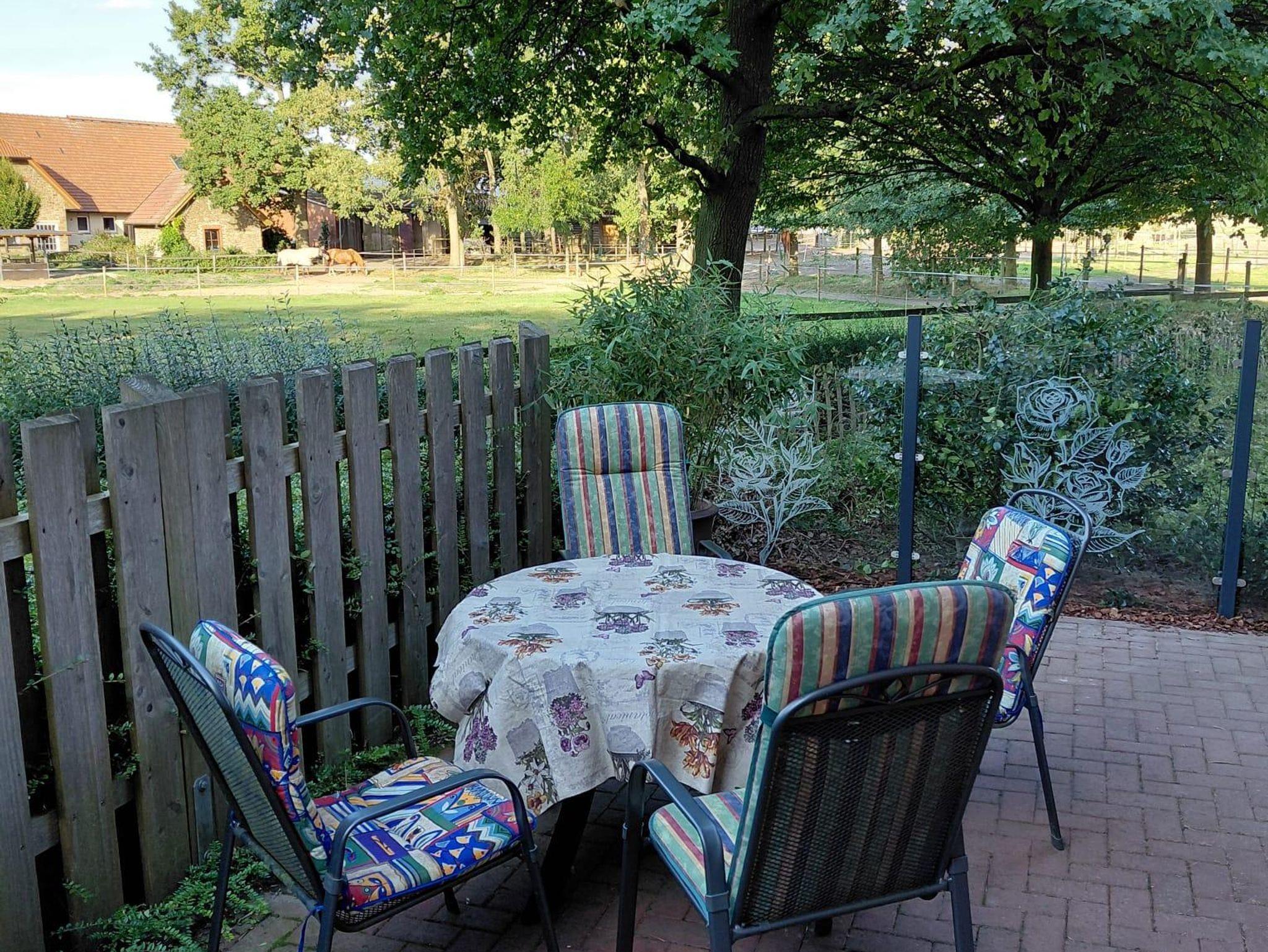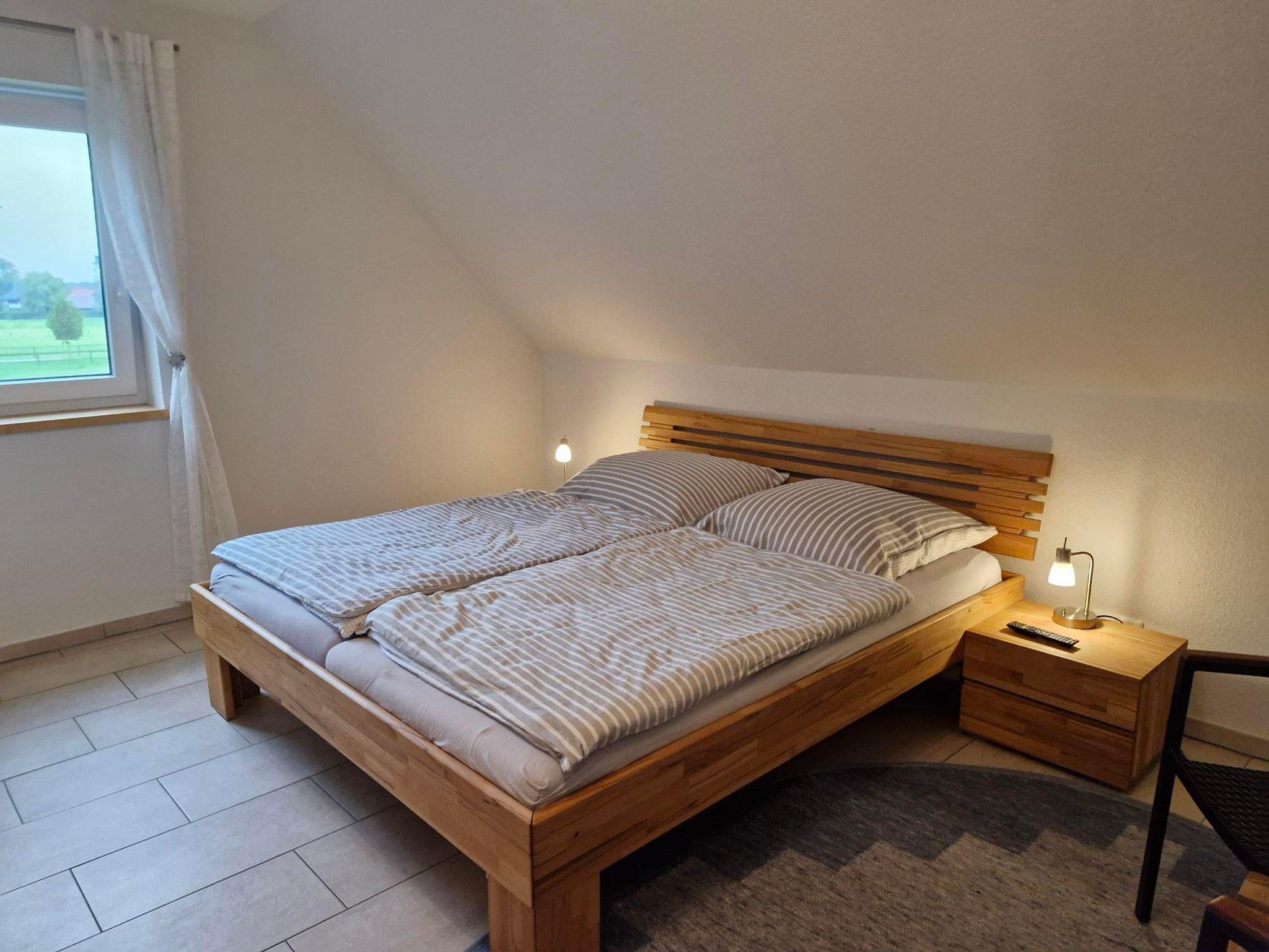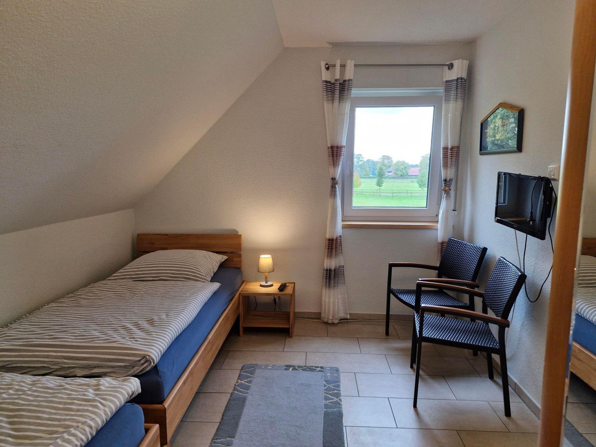 FeWo (66qm) angrenzend an Pferdeweiden und mit freiem Blick zum Wiehengebirge. Fahrradunterstand, Terrasse und separatem Eingang. Im Erdgeschoss befindet sich die vollständig eingerichtete Küche, ein Wohnzimmer mit Essbereich und Fernseher, sowie ein Gäste-WC. Im Obergeschoss befinden sich 2 Schlafzimmer (1 Schlafzimmer mit 2 Einzelbetten und 1 Schlafzimmer mit Doppelbett und Fernseher), sowie ein Badezimmer mit Dusche. Die Wohnung verfügt über: kostenlosem W-LAN, Fußbodenheizung, belebtes Wasser mit Grander-Technologie, größtenteils Climabalance-Bettwaren und einer Treppe mit fest installierter Kindersicherung. Die Fenster sind mit Fliegengitter versehen.