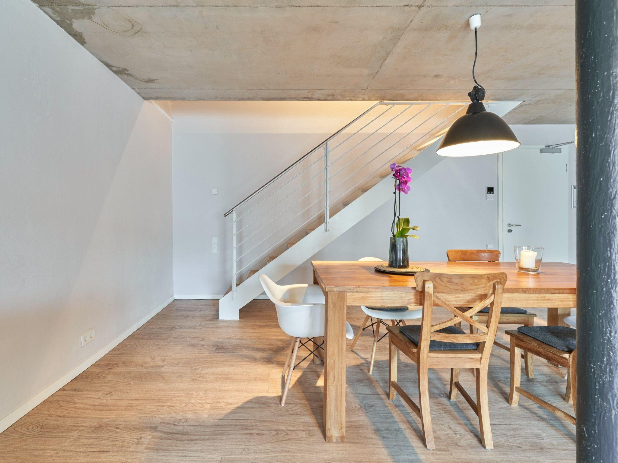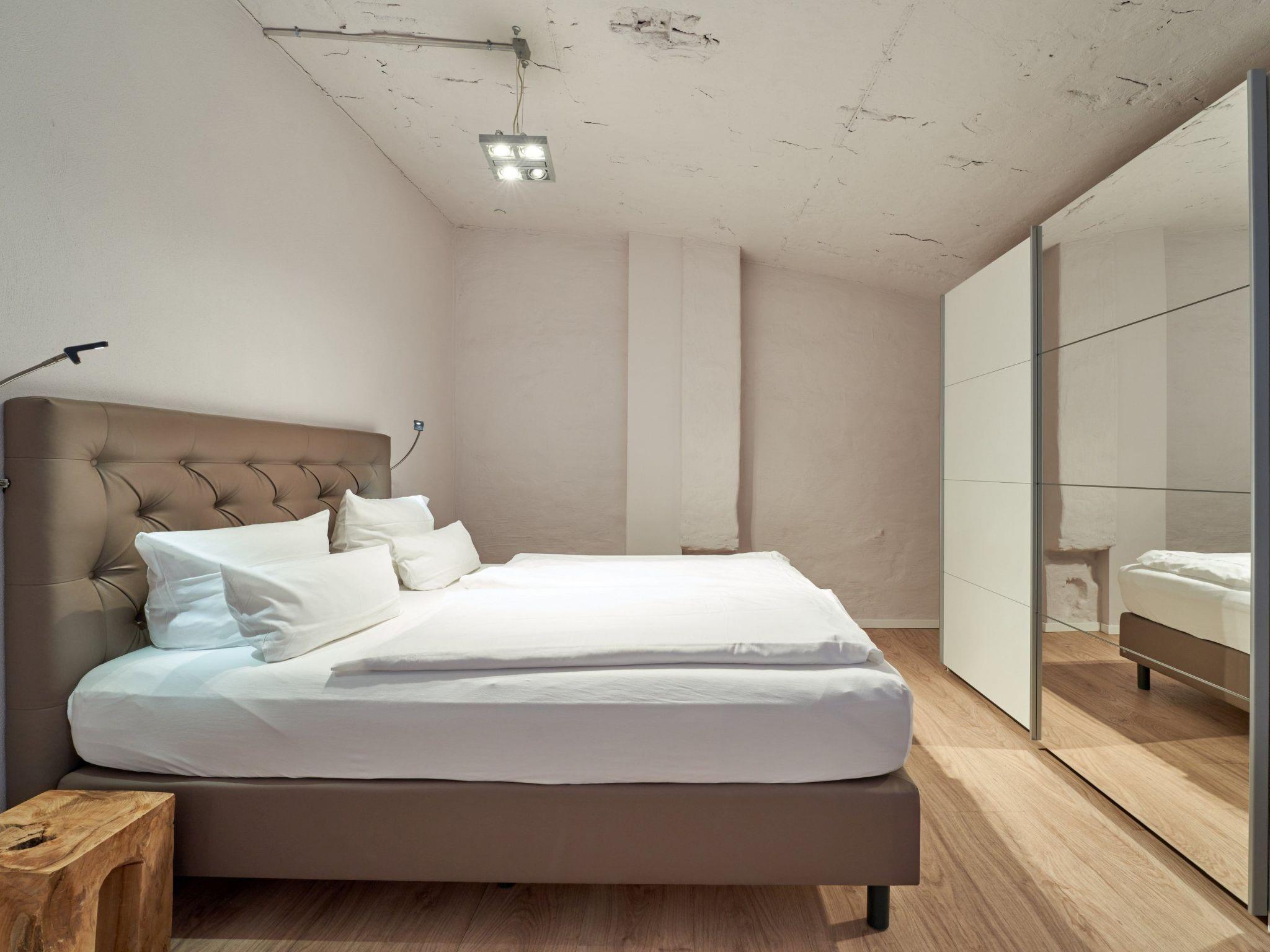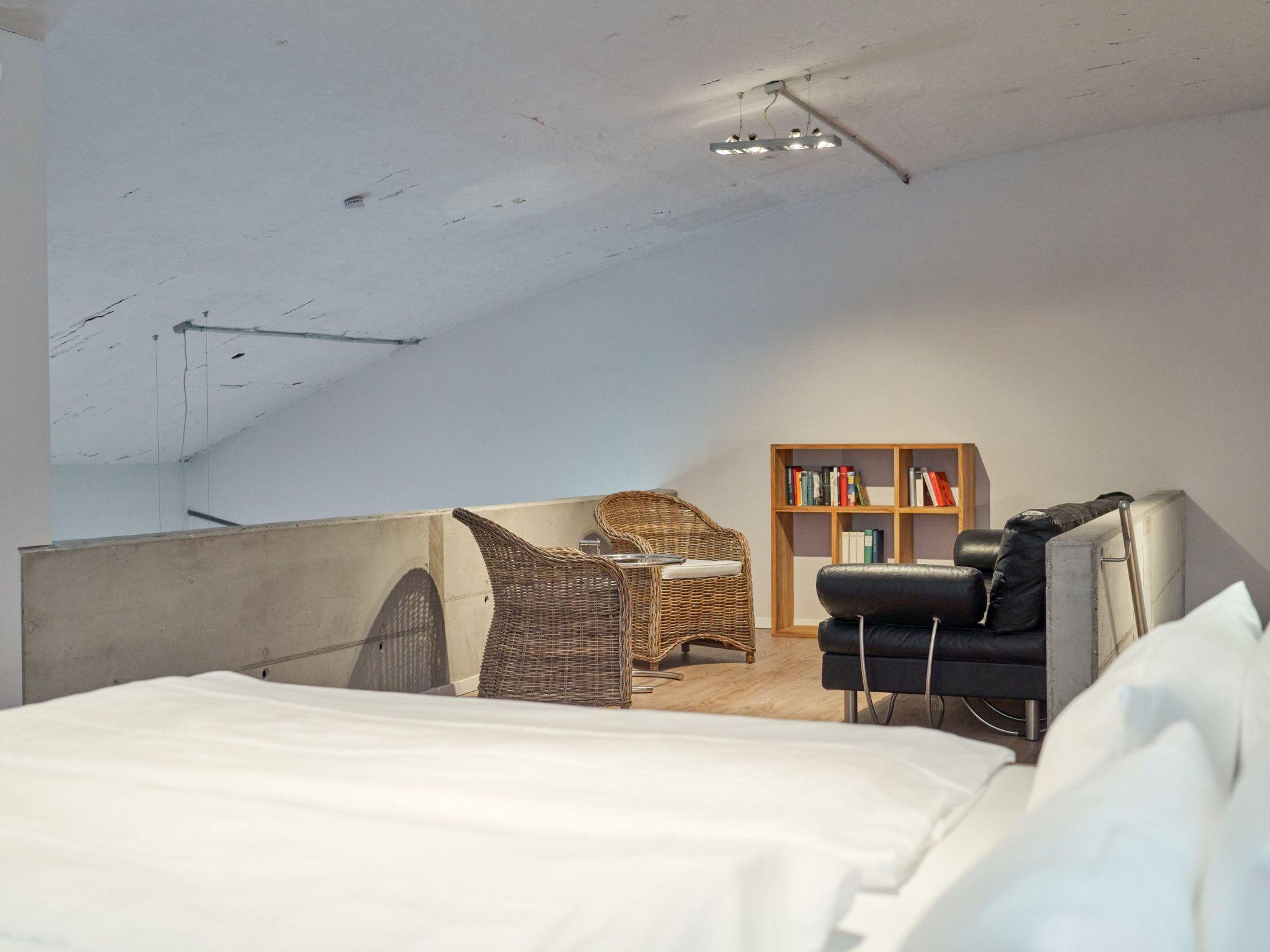 The maisonette apartment is on the upper floor of the former tannery and has a spacious layout (100m²). The generously equipped loft apartment is suitable for 4 people. Children’s travel beds and highchairs can be booked in advance. Italian sofas and armchairs in the living room invite you to relax. The big flatscreen TV with cable channels and a Blu-ray player provide ample entertainment. The stereo system has a Bluetooth connection for enjoying your own music. Wi-Fi is available in the apartment. This living room directly adjoins the kitchen-diner. The generous solid wooden dining table invites you to enjoy culinary experiences prepared in the fully-equipped kitchen. A toaster can also be provided. The two very big bedrooms are on the lower floor and the gallery, each with an extra-long (210cm), comfortable, high-quality box spring bed. The walk-in shower in the bathroom also has a rain showerhead. The washbasin has a large and well-illuminated mirror and wheelchairs can fit underneath. Hand and shower towels are provided.