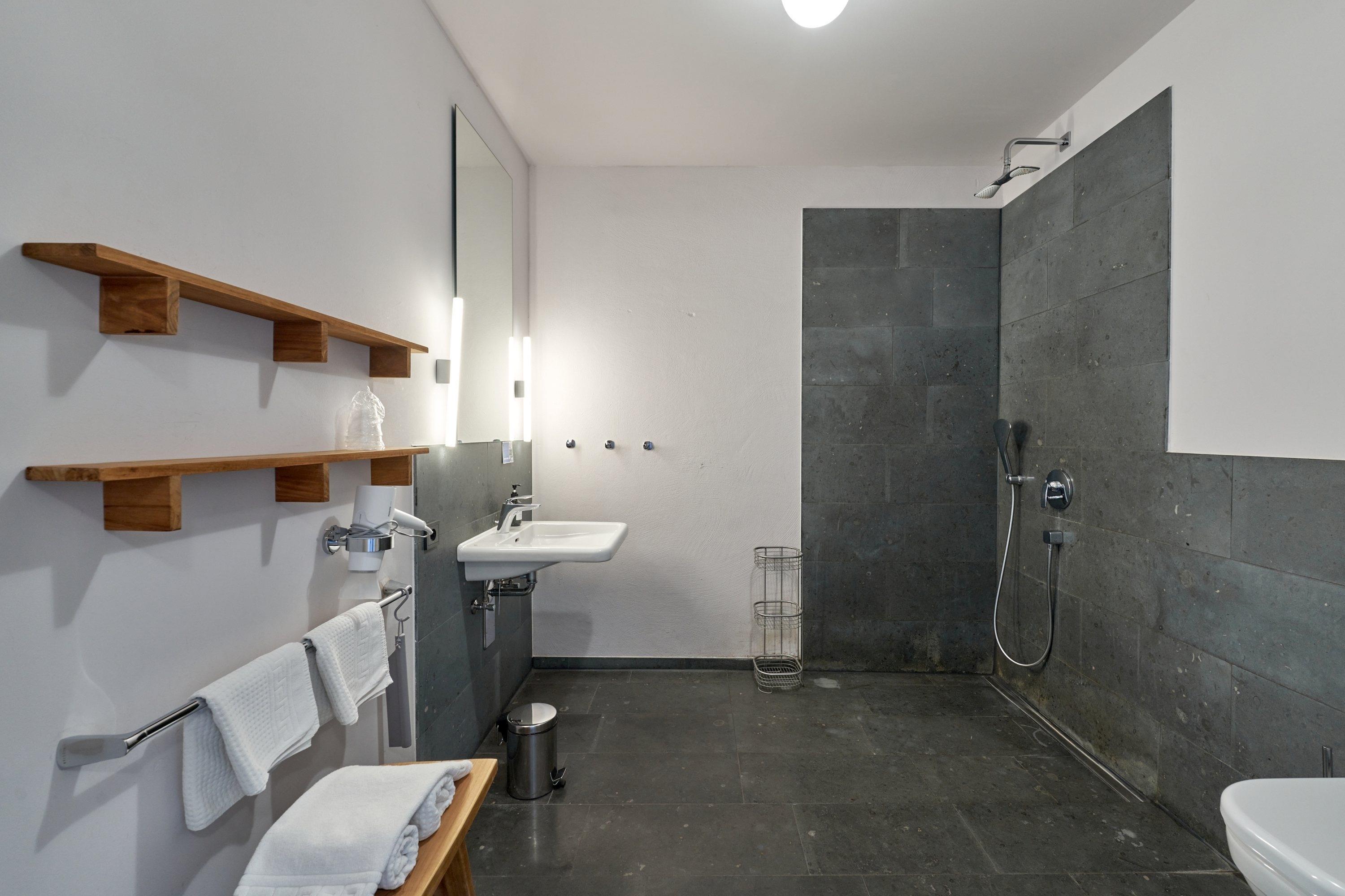 Die bodengleiche Dusche verfügt neben der Schlauchbrause auch über eine „Regenkopfdusche“. Das Waschbecken ist mit einem gut ausgeleuchteten, großformatigen Spiegel versehen. Das es für Rollstuhlfahrer unterfahrbar ist, ist für uns selbstverständlich. Zur Ausstattung des Bades gehört auch ein Fön. Hand- und Duschtücher liegen für Sie bereit.