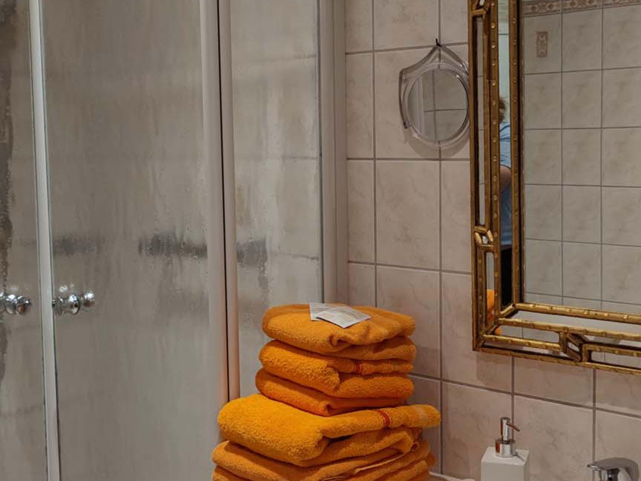 Im Badezimmer befindet sich eine Dusche, WC, Handtücher, Waschbecken mit Spiegel/Kosmetikspiegel, Handtuchtrockner und einen Föhn.