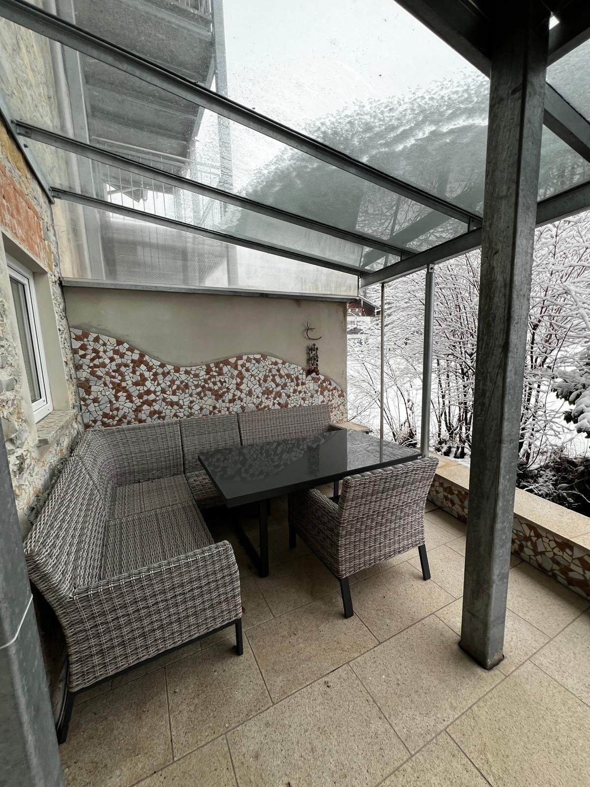 Die große überdachte Terrasse nach Süd-Ost Ausrichtung, lädt zum gemütlichen Verweilen ein. Lassen Sie Ihren Blick über die angrenzenden Wiese zu den wunderschönen Bergen schweifen.