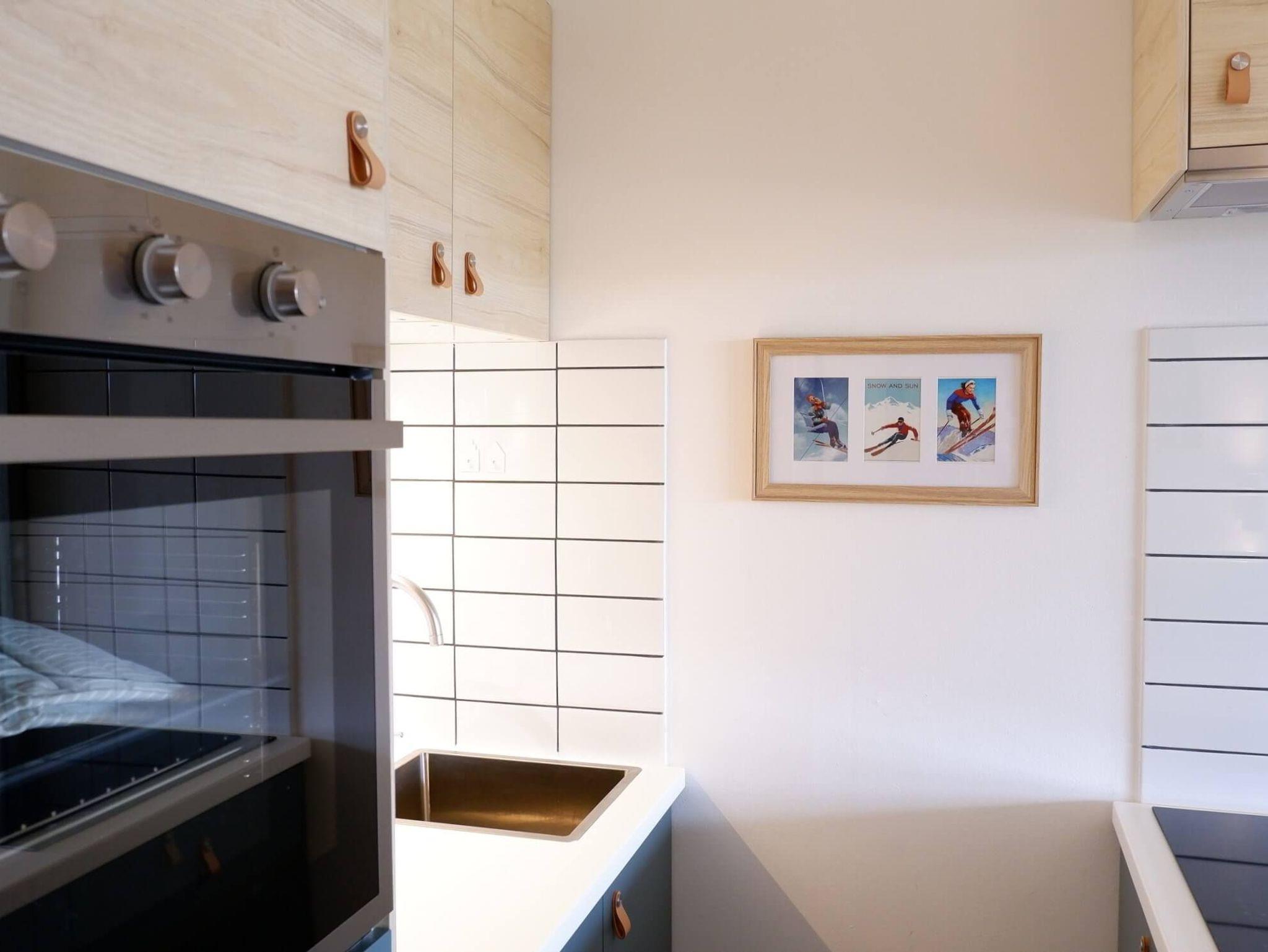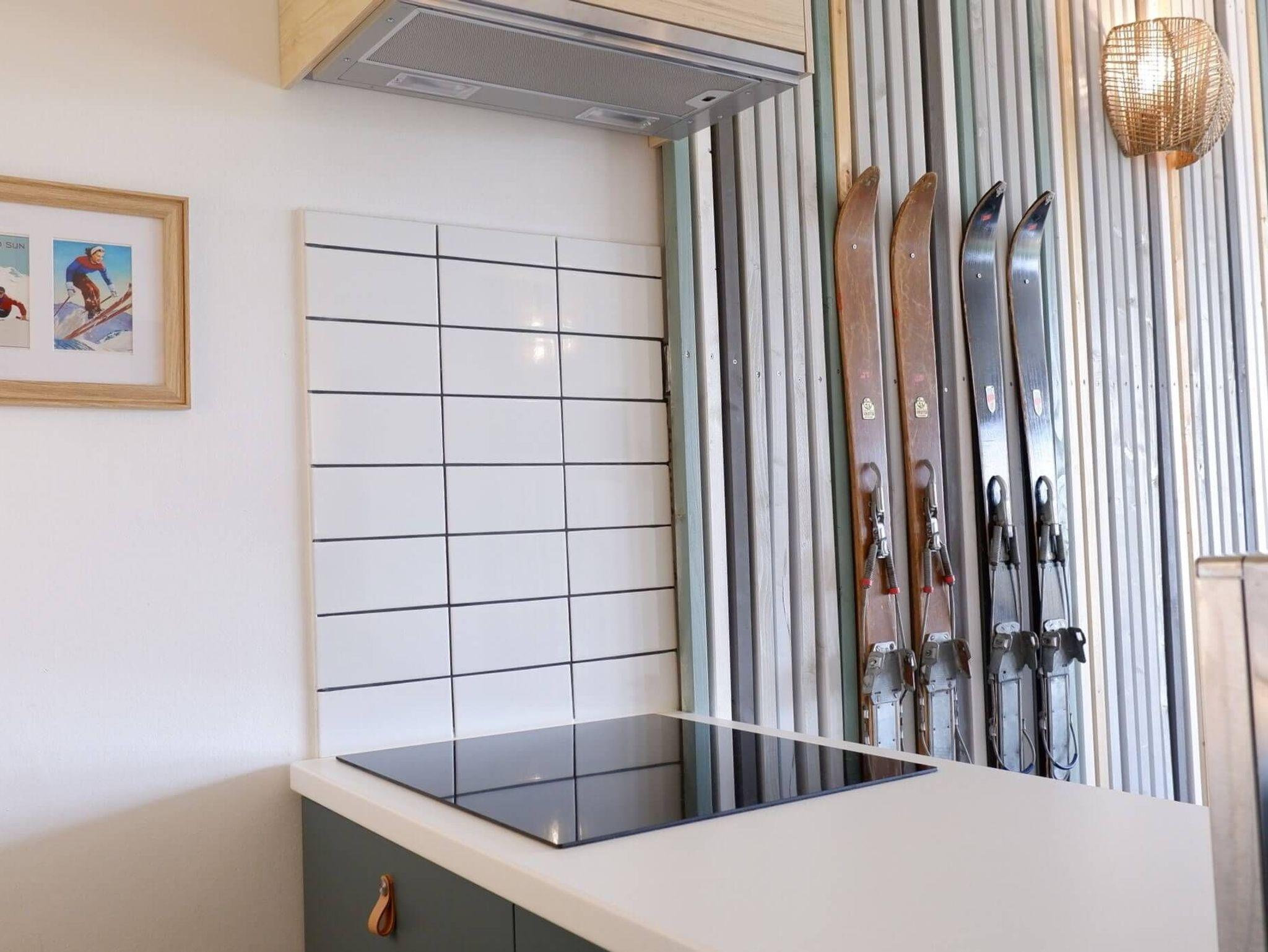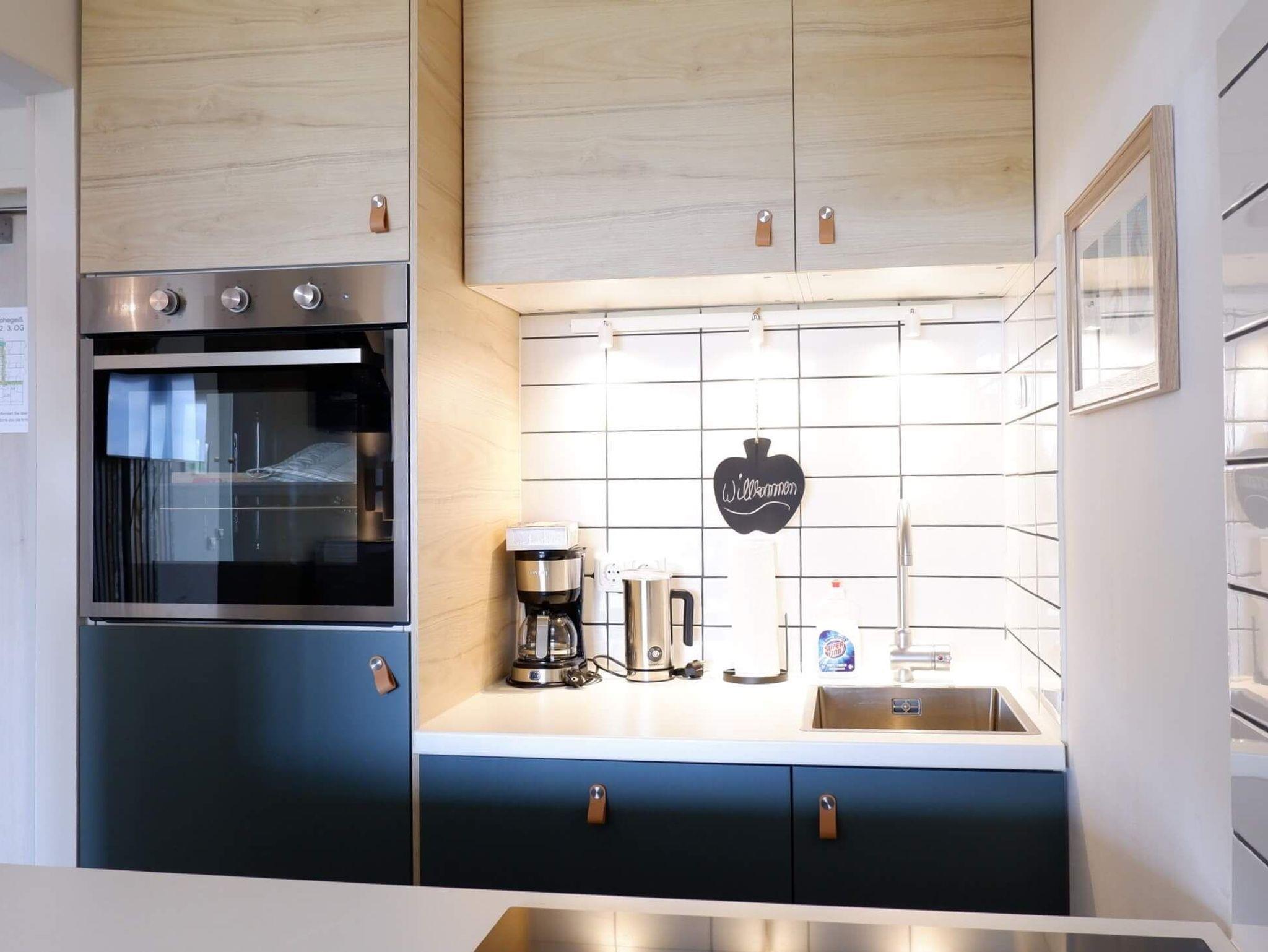 Eine neue und voll ausgestattete Küche mit Backofen, 4 Platten-Induktionsherd, Dunstabzug, Geschirrspüler, Kühlschrank mit Gefrierfach, Mikrowelle, Kaffeemaschine, Mixer, Wasserkocher und Toaster.