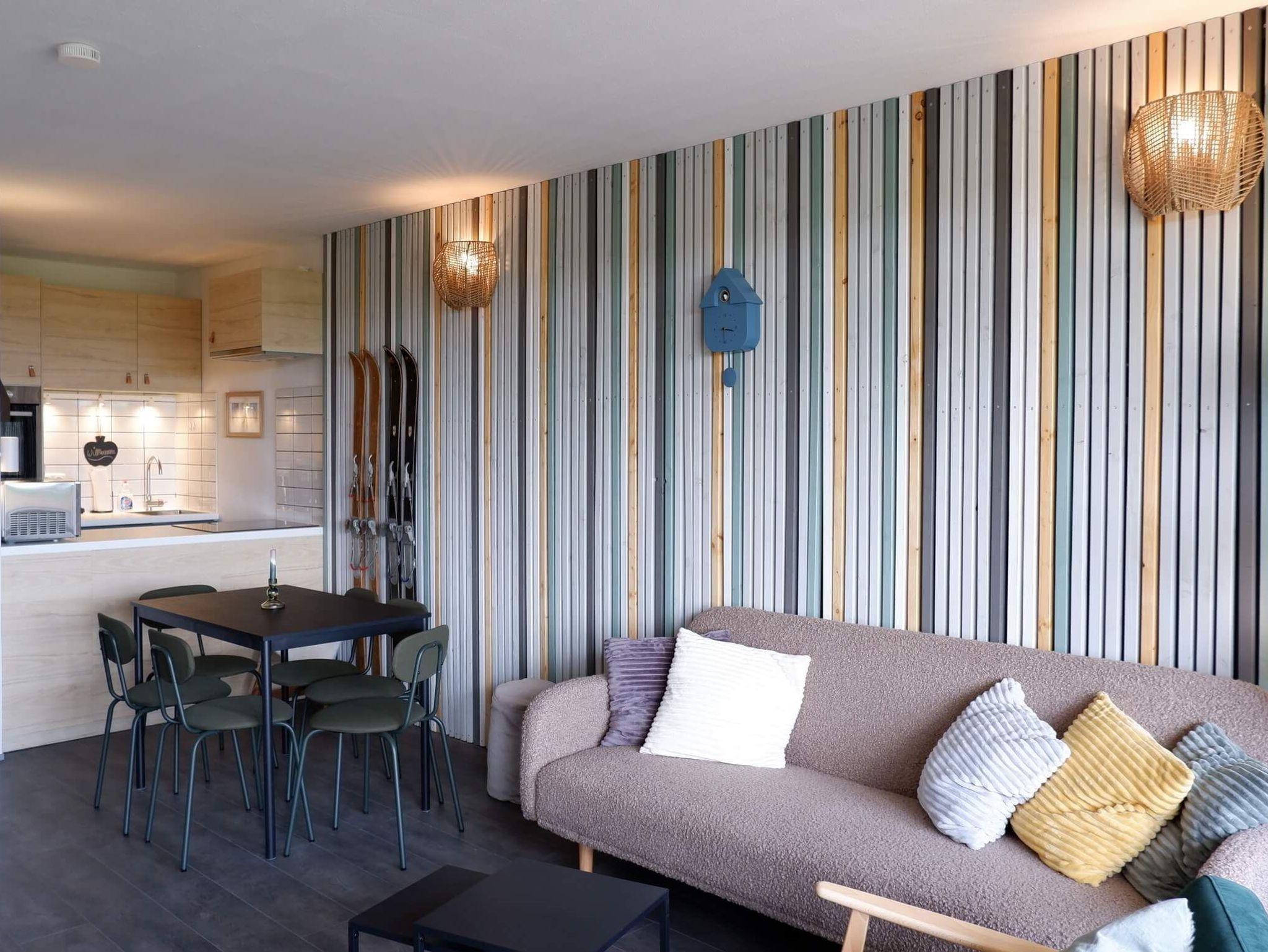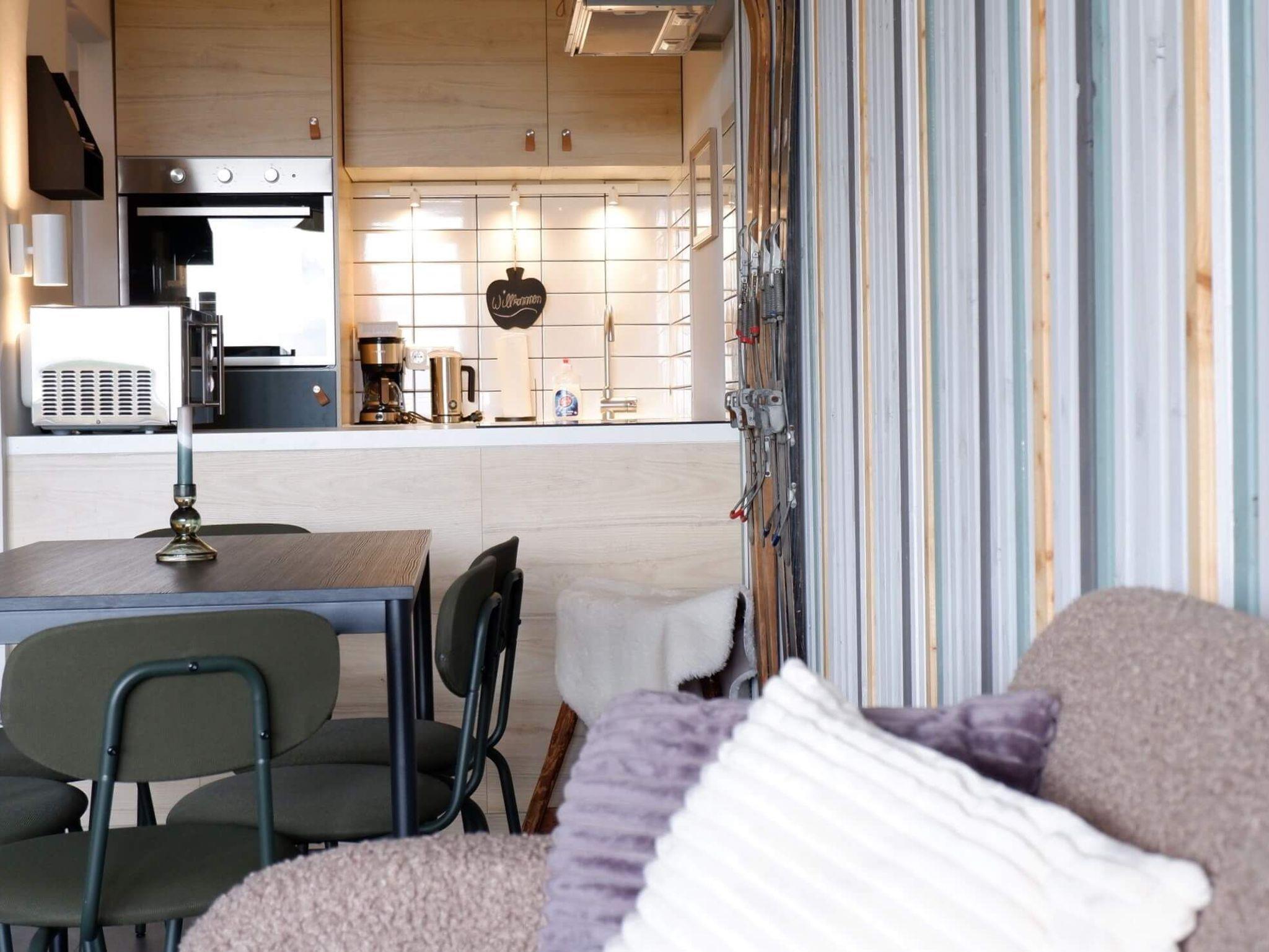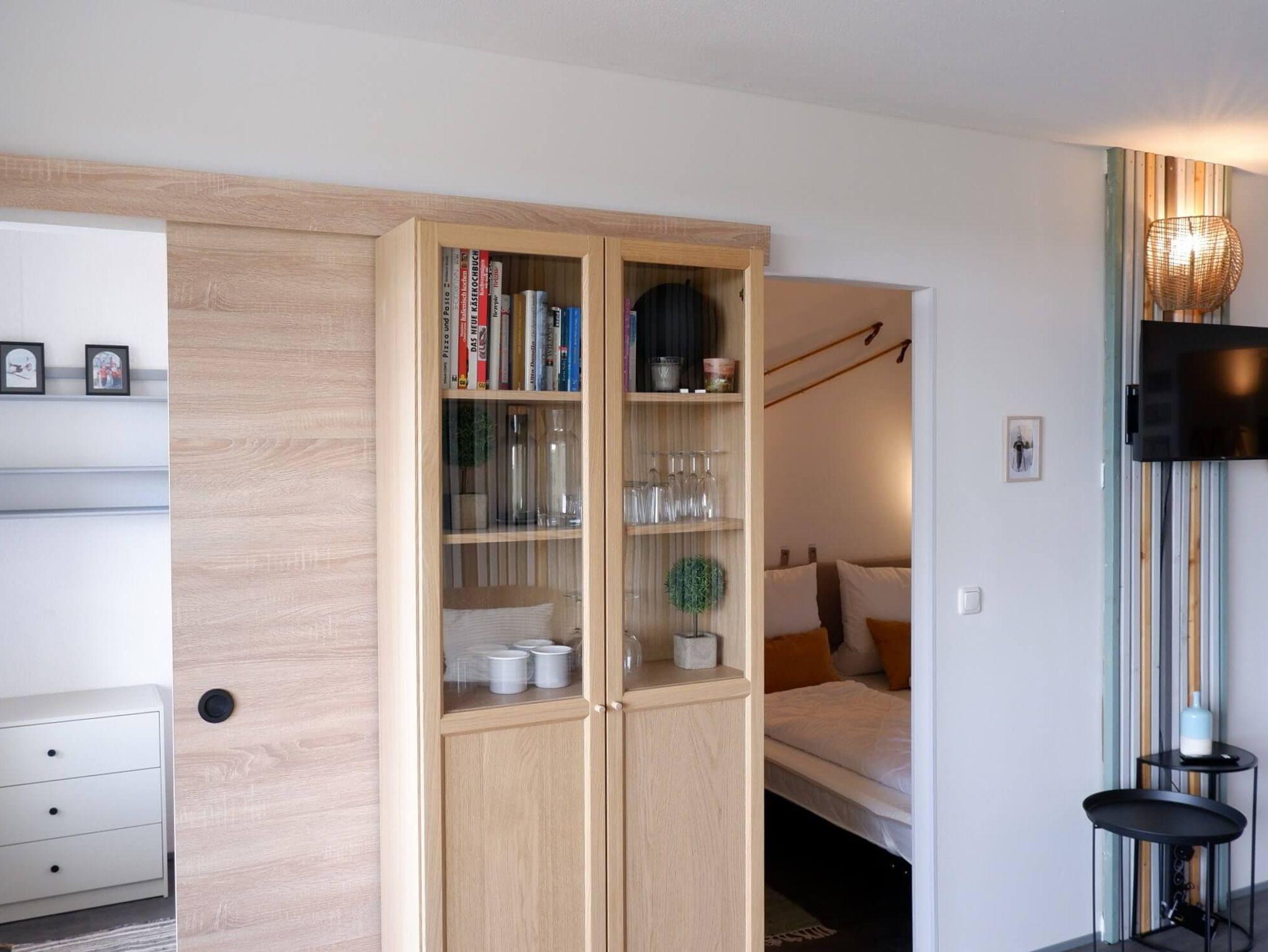 Einen modernen Wohn- Essbereich mit Smart-TV und WLAN, mit abgeteiltem Doppelbett und Einbauschrank.