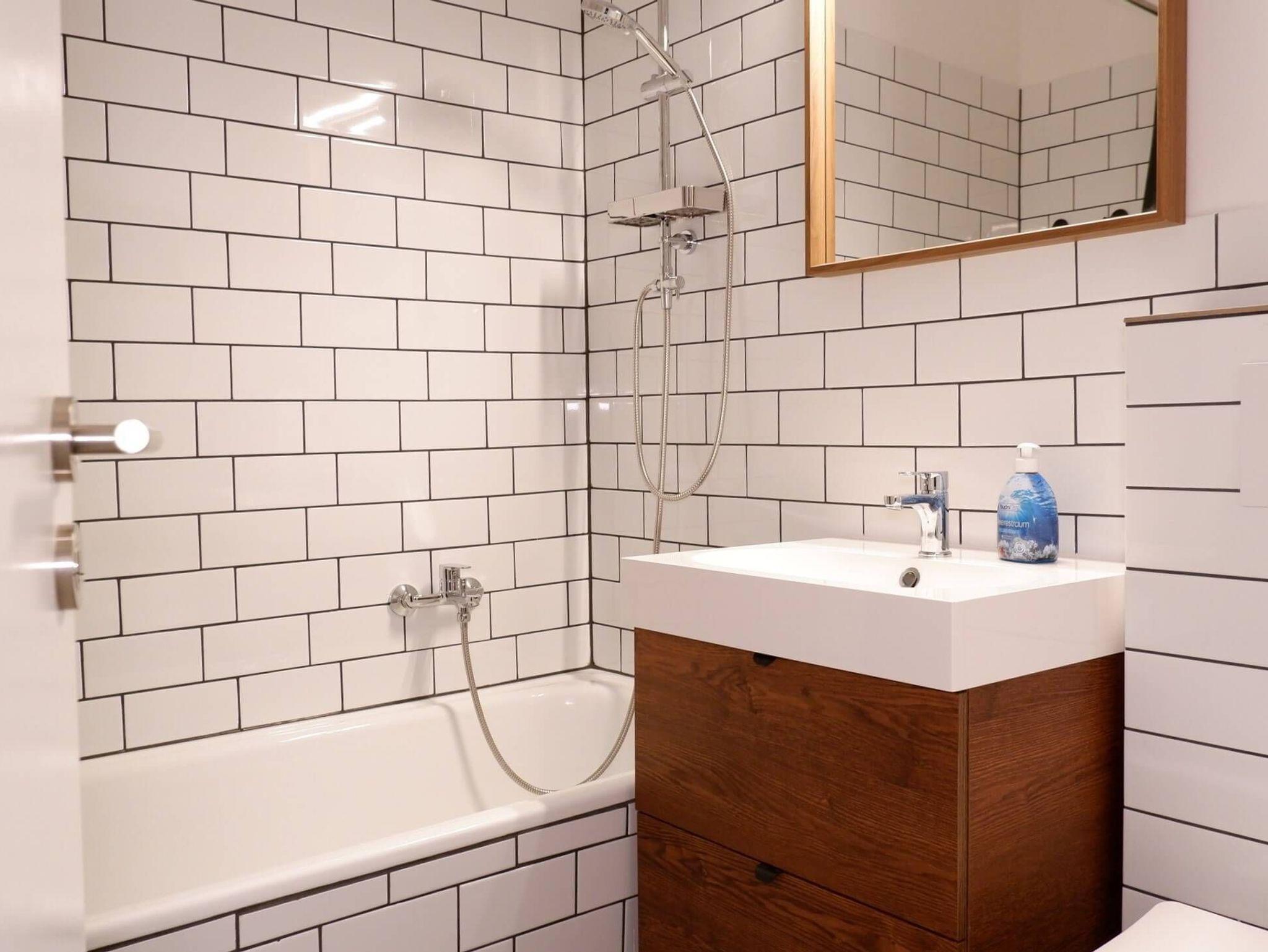 Ein modernes Badezimmer mit Badewanne inkl. Regendusche, Handtuchheizkörper und Fön.