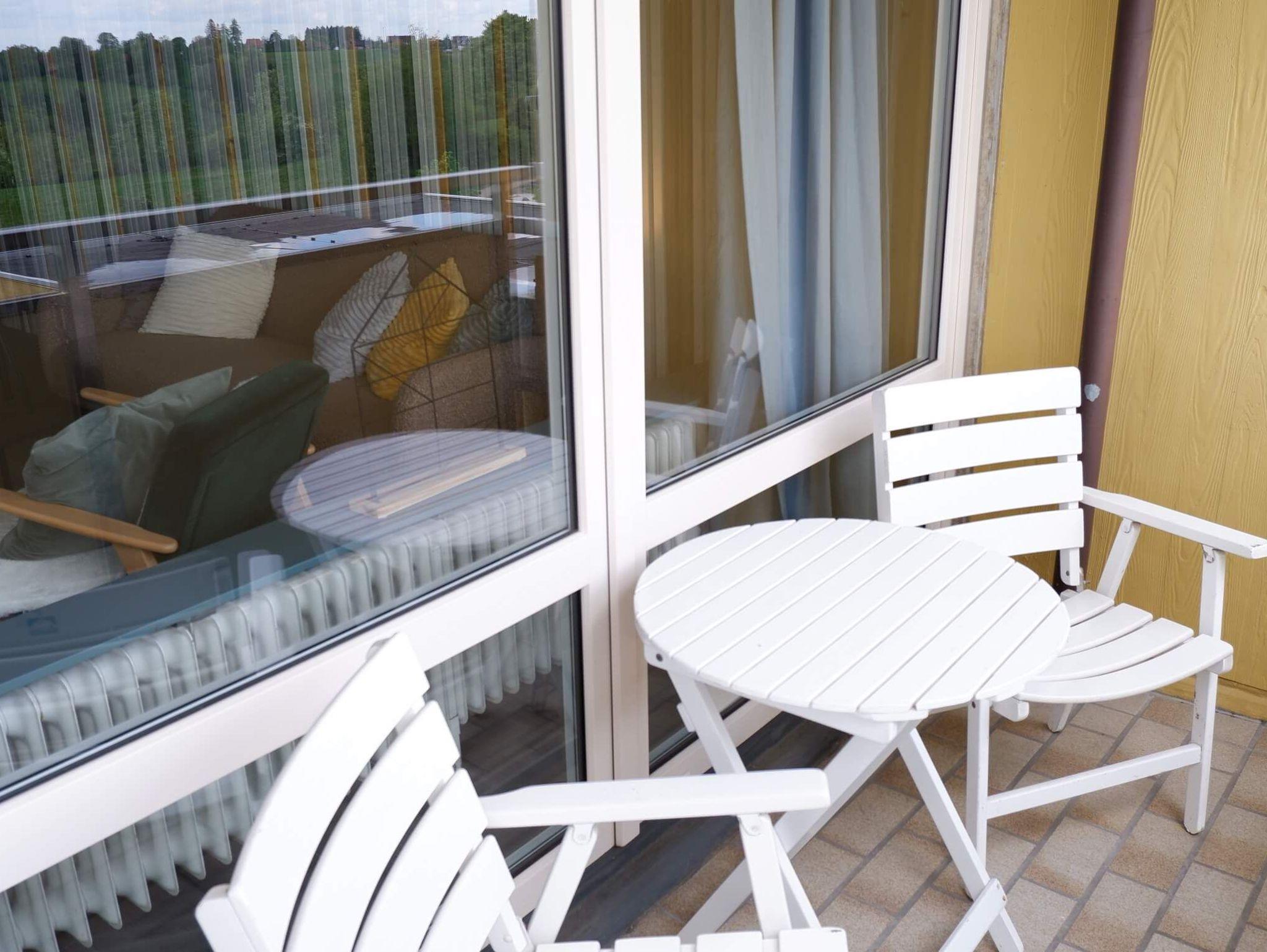 Südbalkon mit Tisch und Stühlen, sowie Sonnenschirm