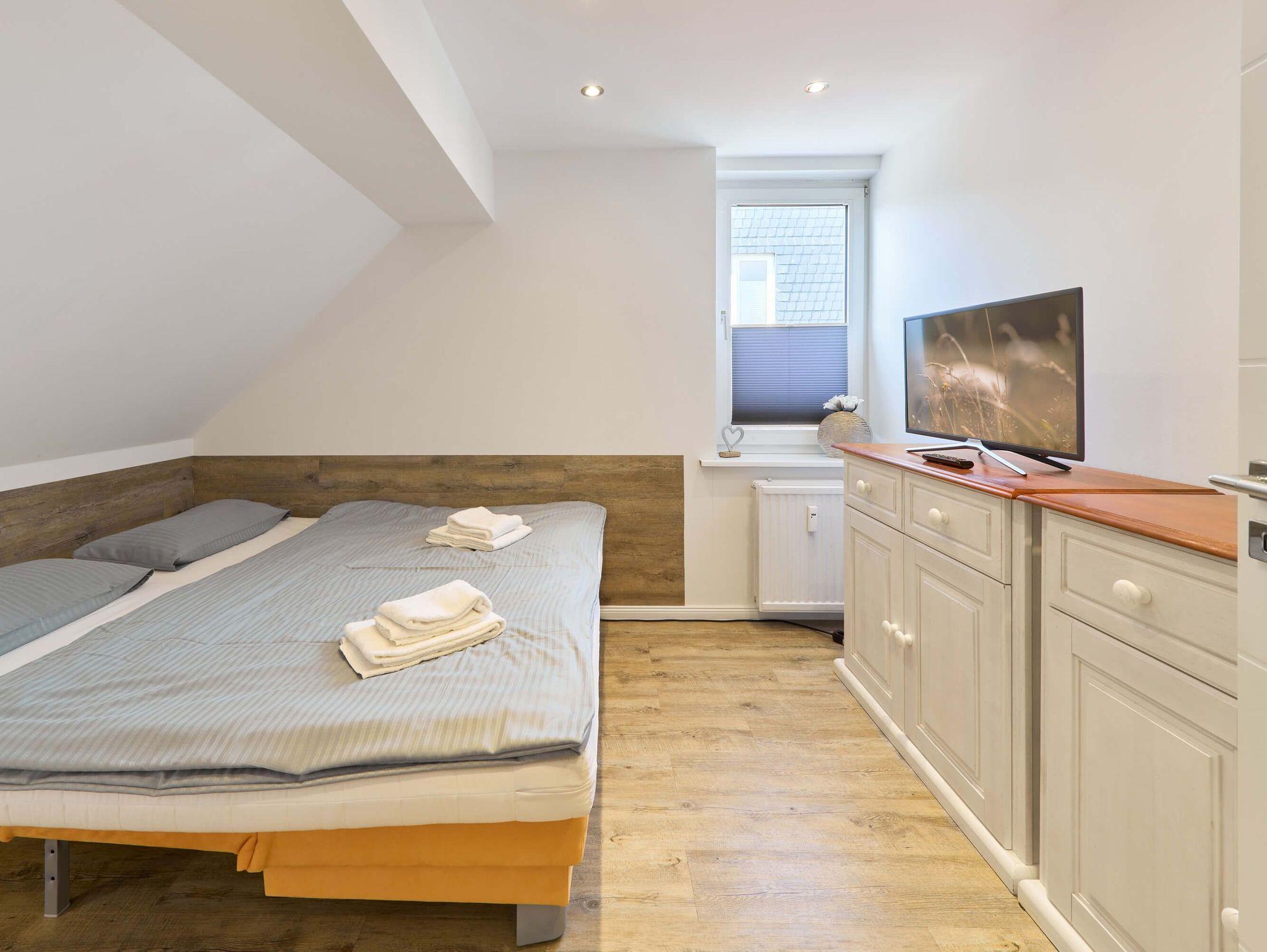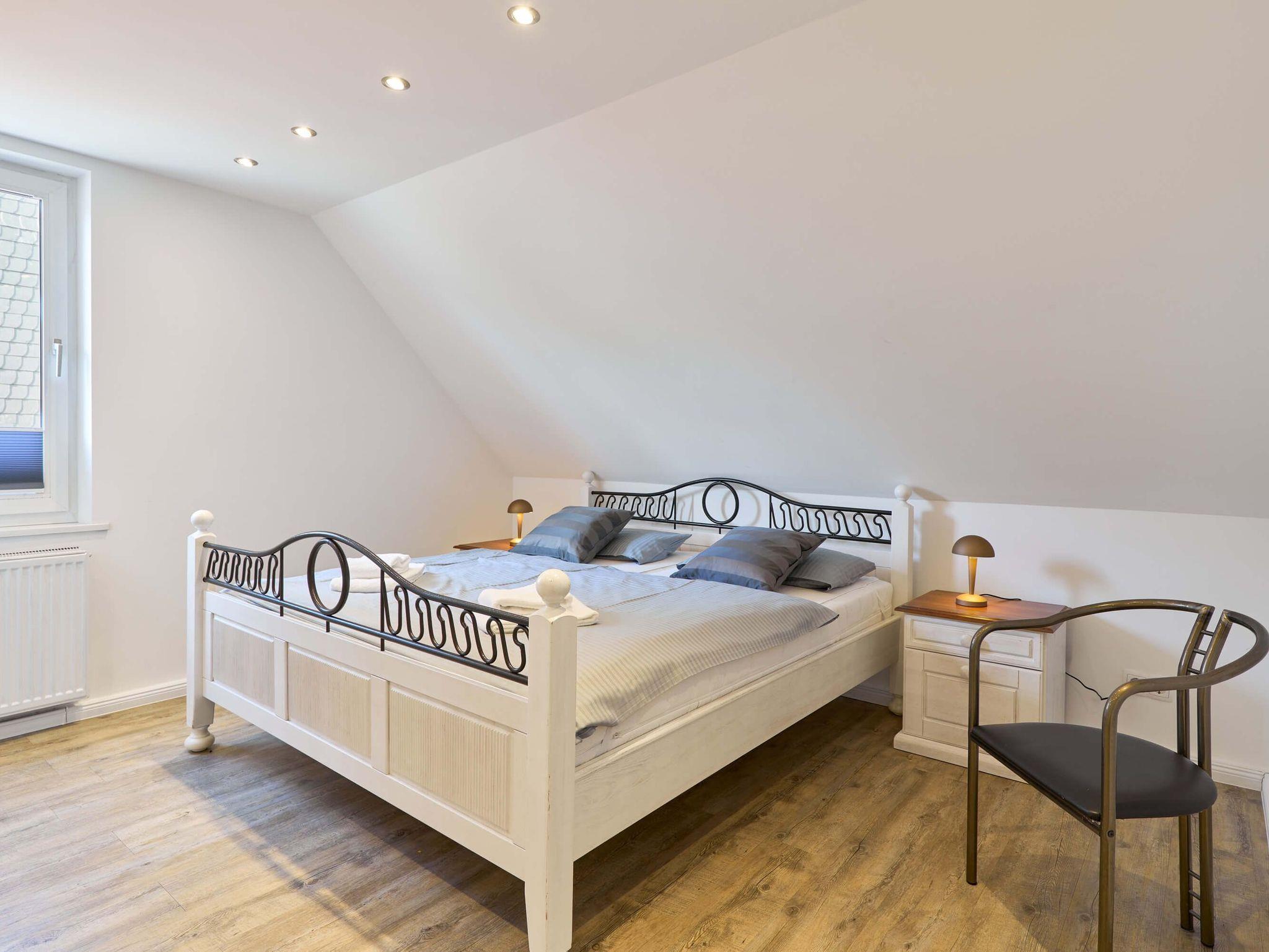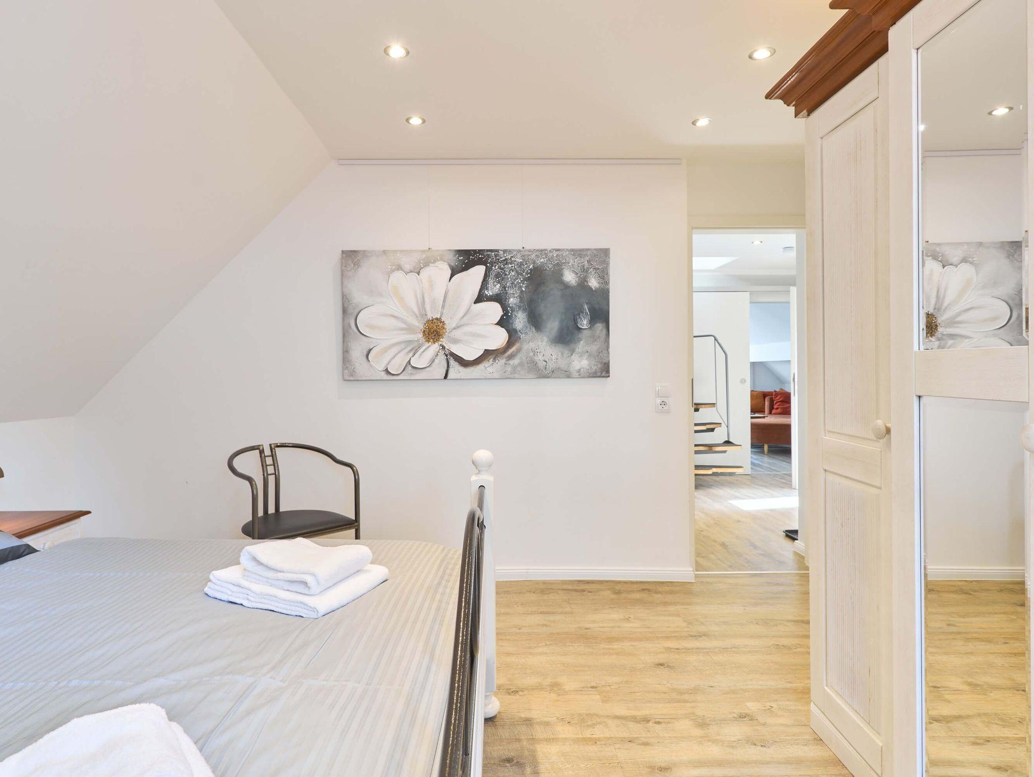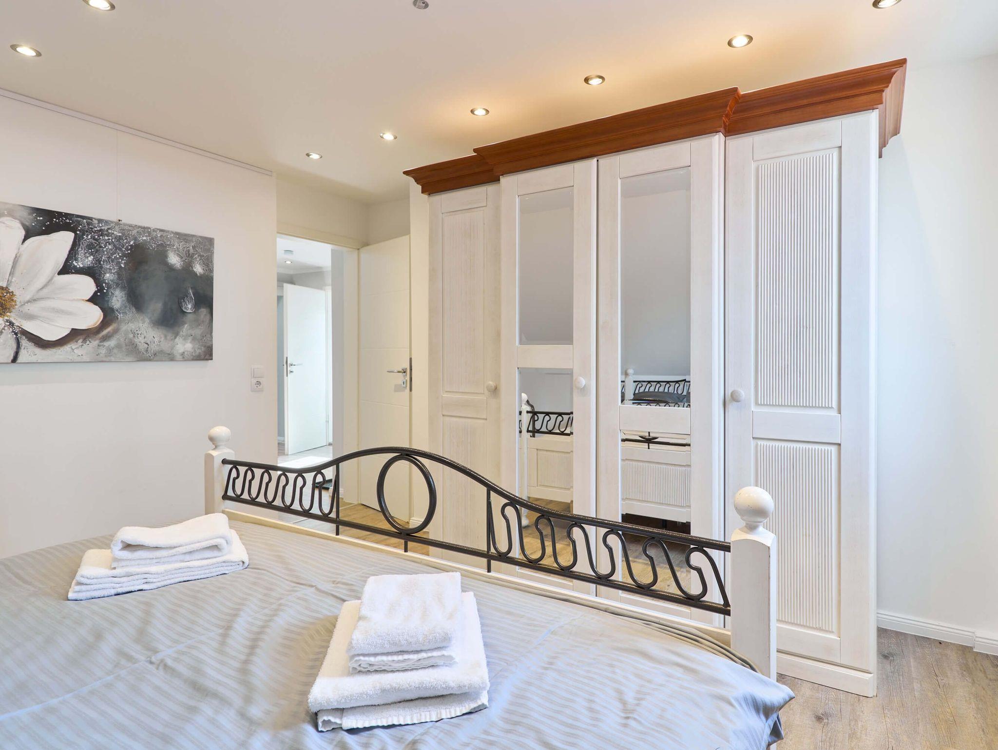 In den zwei separaten Schlafzimmern können Sie ausschlafen, um gut gelaunt in Ihren Urlaub zu starten. Den Schlafloft im Dachgeschoss erreichen Sie über die Raumspartreppe im Flur. Des Weiteren finden Sie auch einen großen Kleiderschrank und eine Kommode in der geräumigen Ferienwohnung, sodass es auch genügend Platz für Ihre Urlaubsgarderobe gibt.