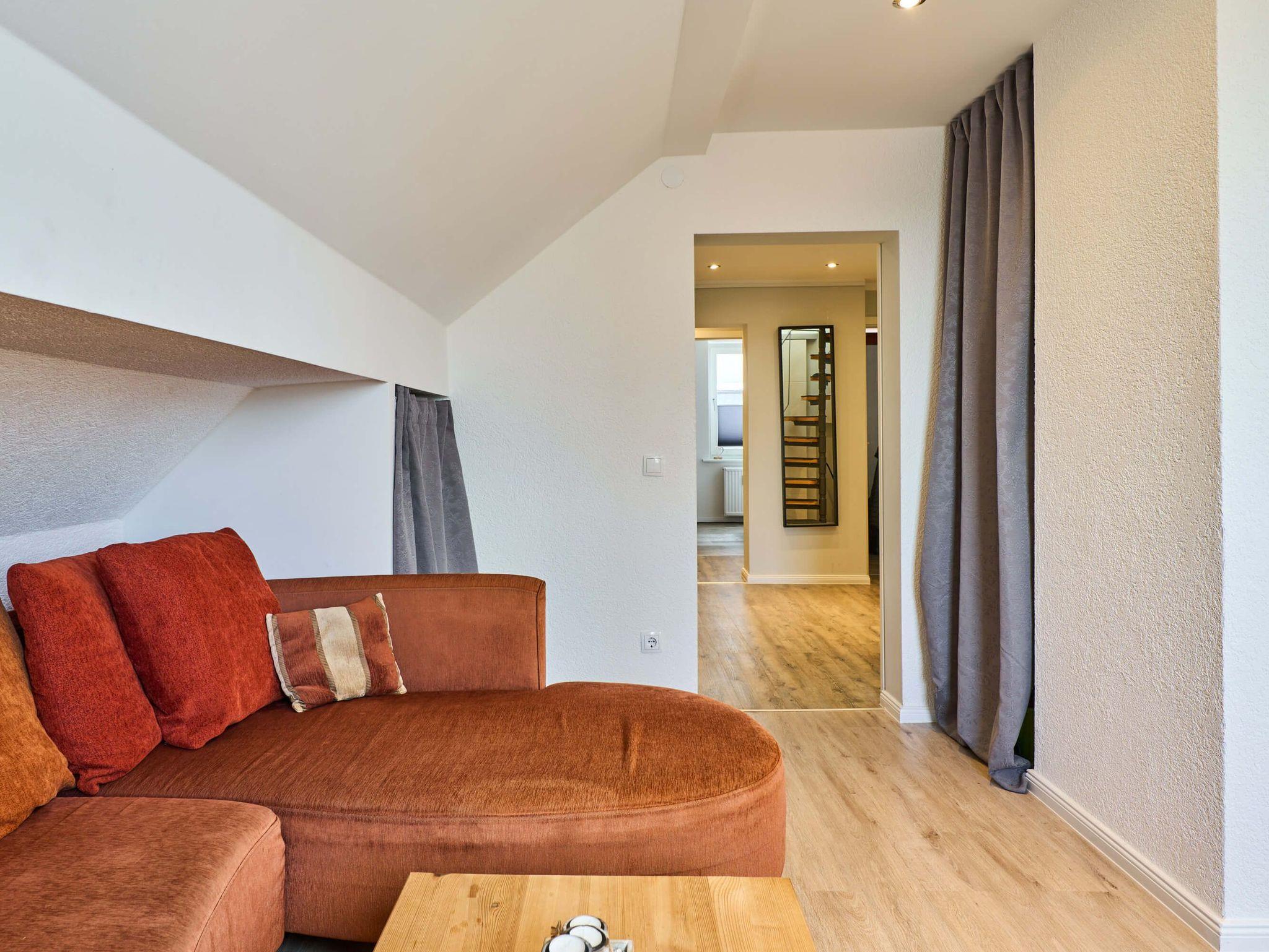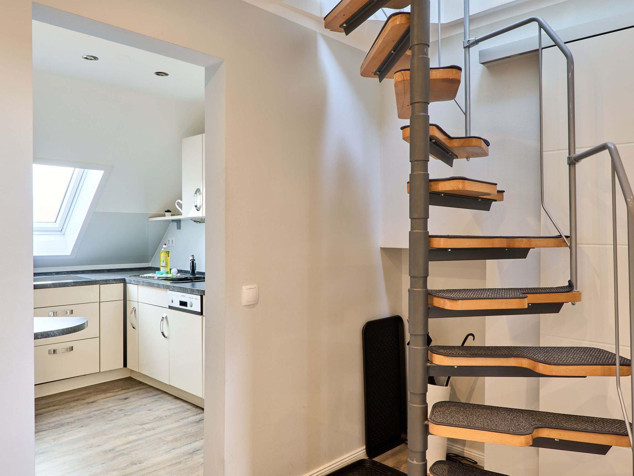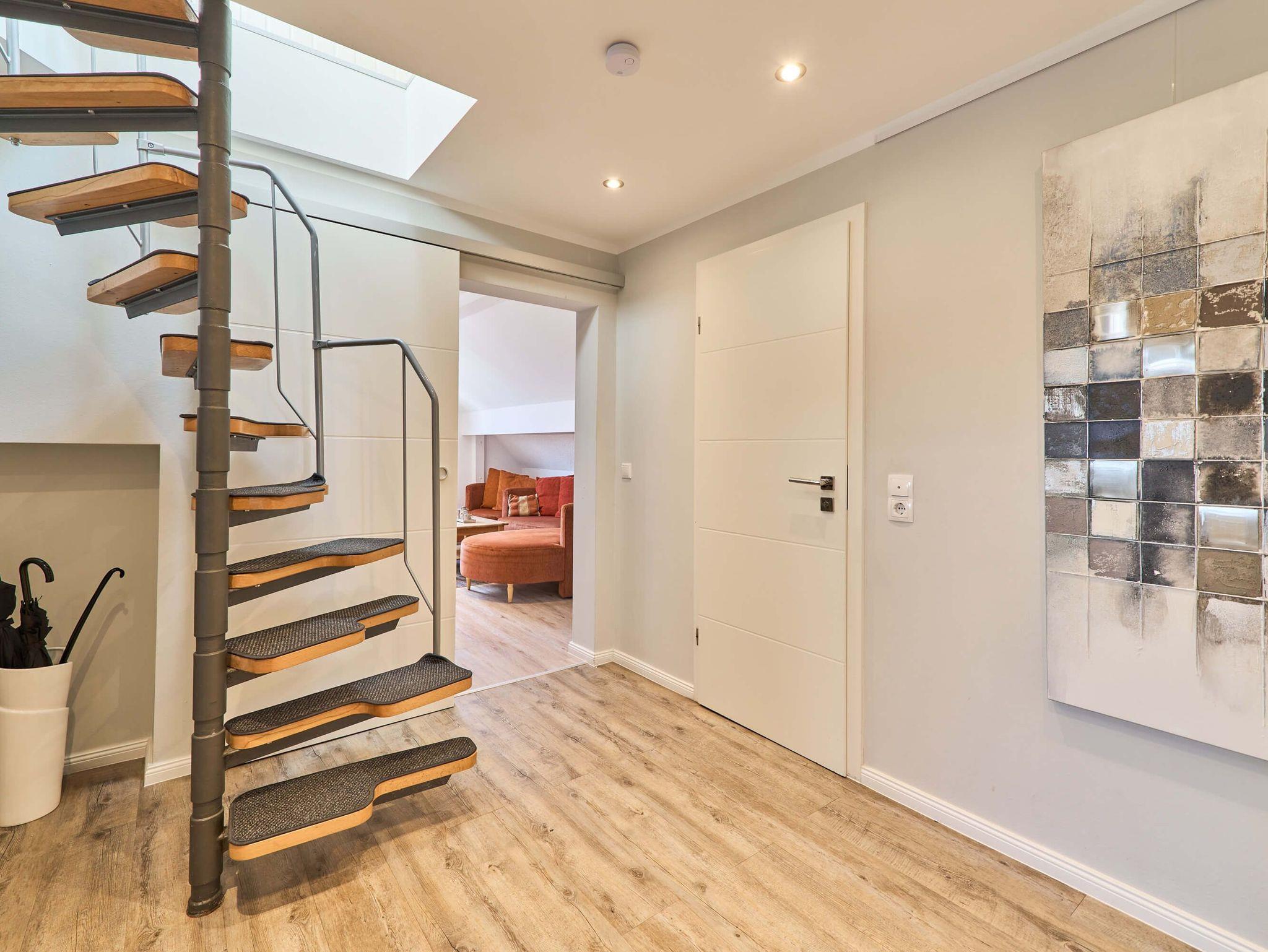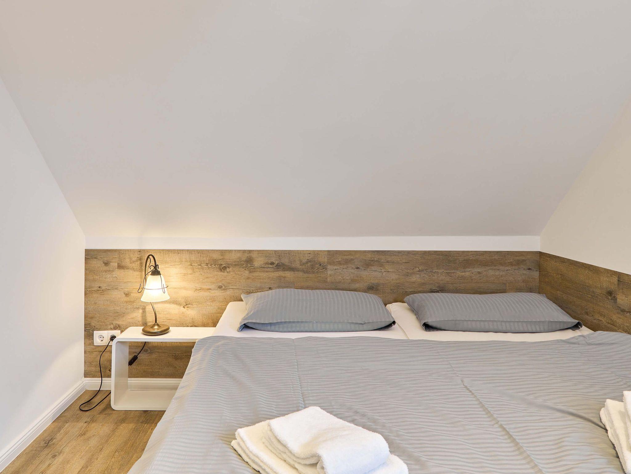 In den zwei separaten Schlafzimmern können Sie ausschlafen, um gut gelaunt in Ihren Urlaub zu starten. Den Schlafloft im Dachgeschoss erreichen Sie über die Raumspartreppe im Flur. Des Weiteren finden Sie auch einen großen Kleiderschrank und eine Kommode in der geräumigen Ferienwohnung, sodass es auch genügend Platz für Ihre Urlaubsgarderobe gibt.