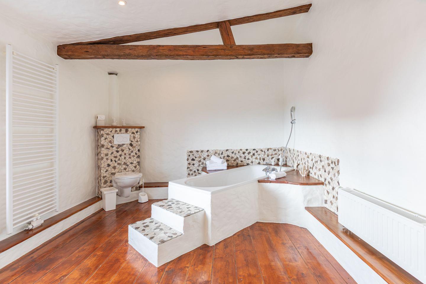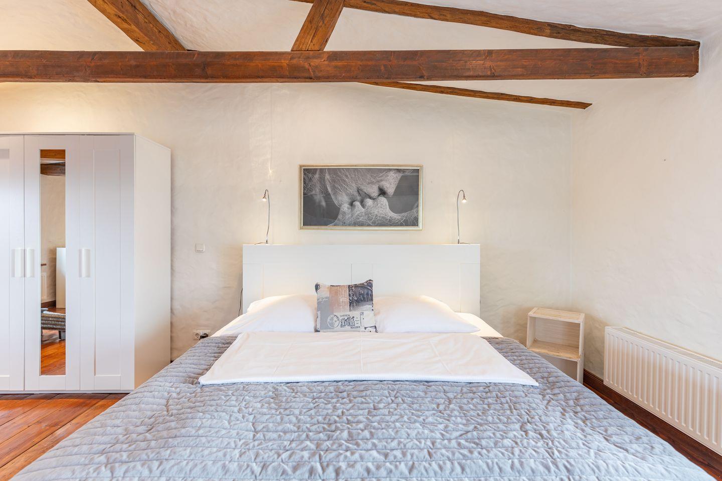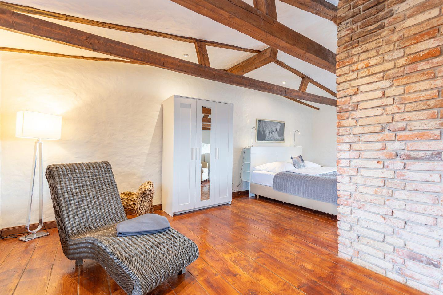 Die stilvoll eingerichtete Ferienwohnung ist 120 qm groß und bietet ein geräumiges Wohnzimmer mit Flachbild-TV (SAT). Die Küche mit dem großen Esstisch ist mit einem Herd (Ceranfeld), Backofen, Geschirrspülmaschine und Kühlschrank ausgestattet. Das Apartment verfügt im Erdgeschoss über ein Schlafzimmer mit einem Doppelbett (180 × 200) und ein Duschbad. Das großzügige, offene Obergeschoss bietet Ihnen einen gemütlichen Rückzugsort mit Sofaecke und TV sowie einen kleinen Balkon. Auf einem Boxspringbett (180 x 200) können Sie es sich so richtig bequem machen. Das moderne Wannenbad sorgt für Ihr Wohlbehagen nach einem langen Tagesausflug. Zur Wohnung gehört ein schöner Garten mit Terrasse, Gartenmöbeln und einem Grill.