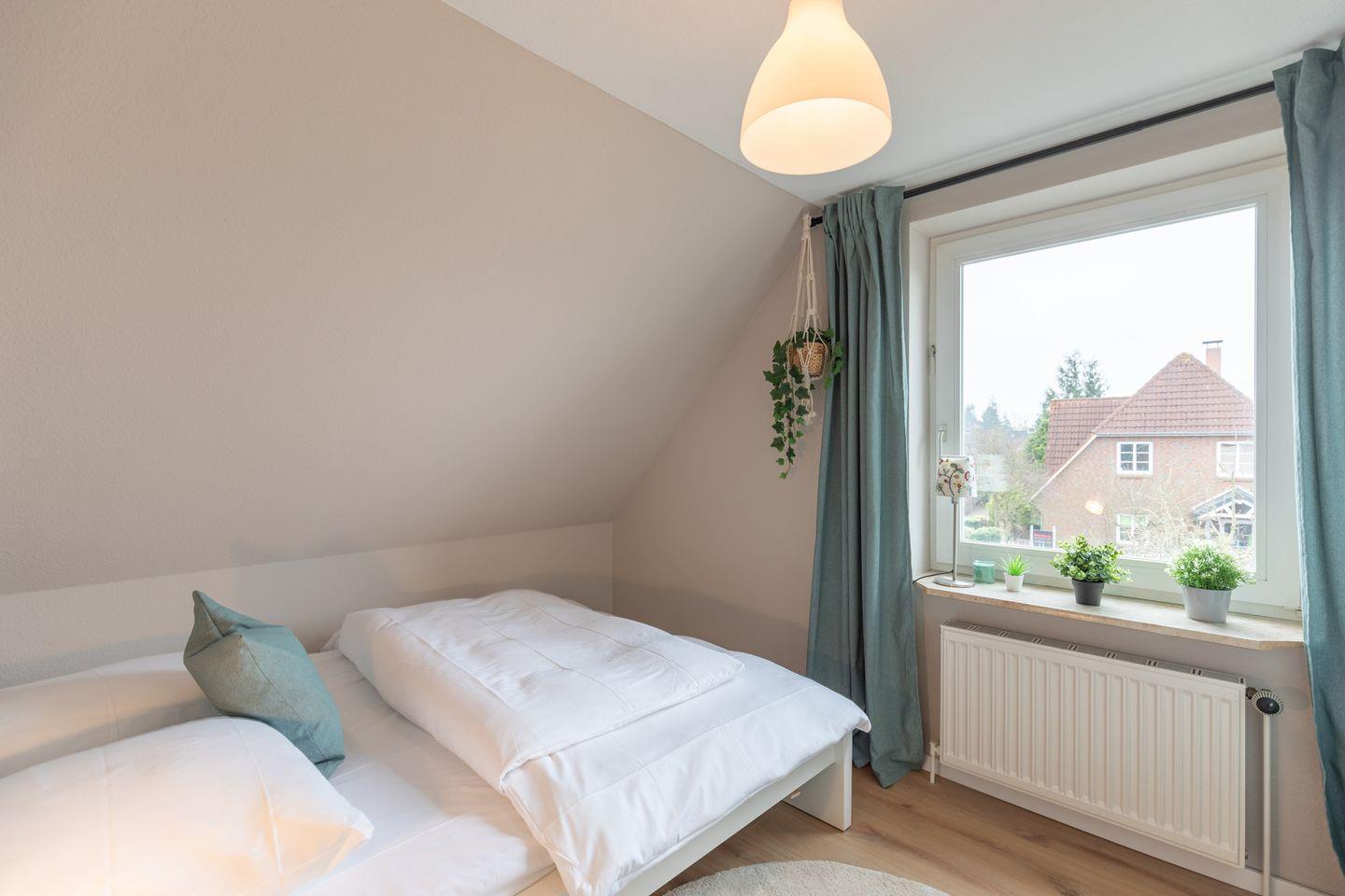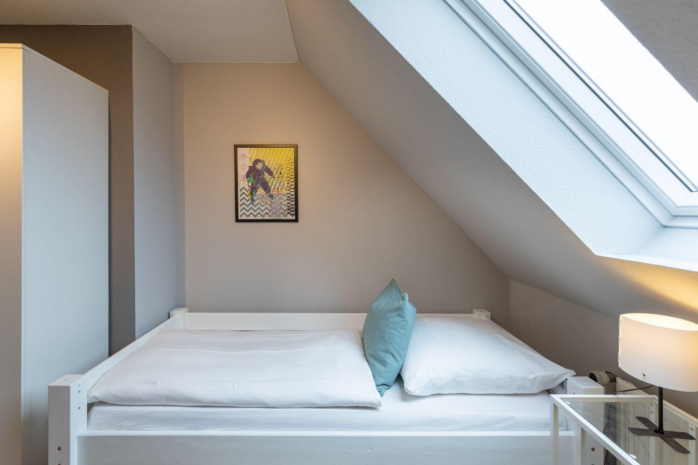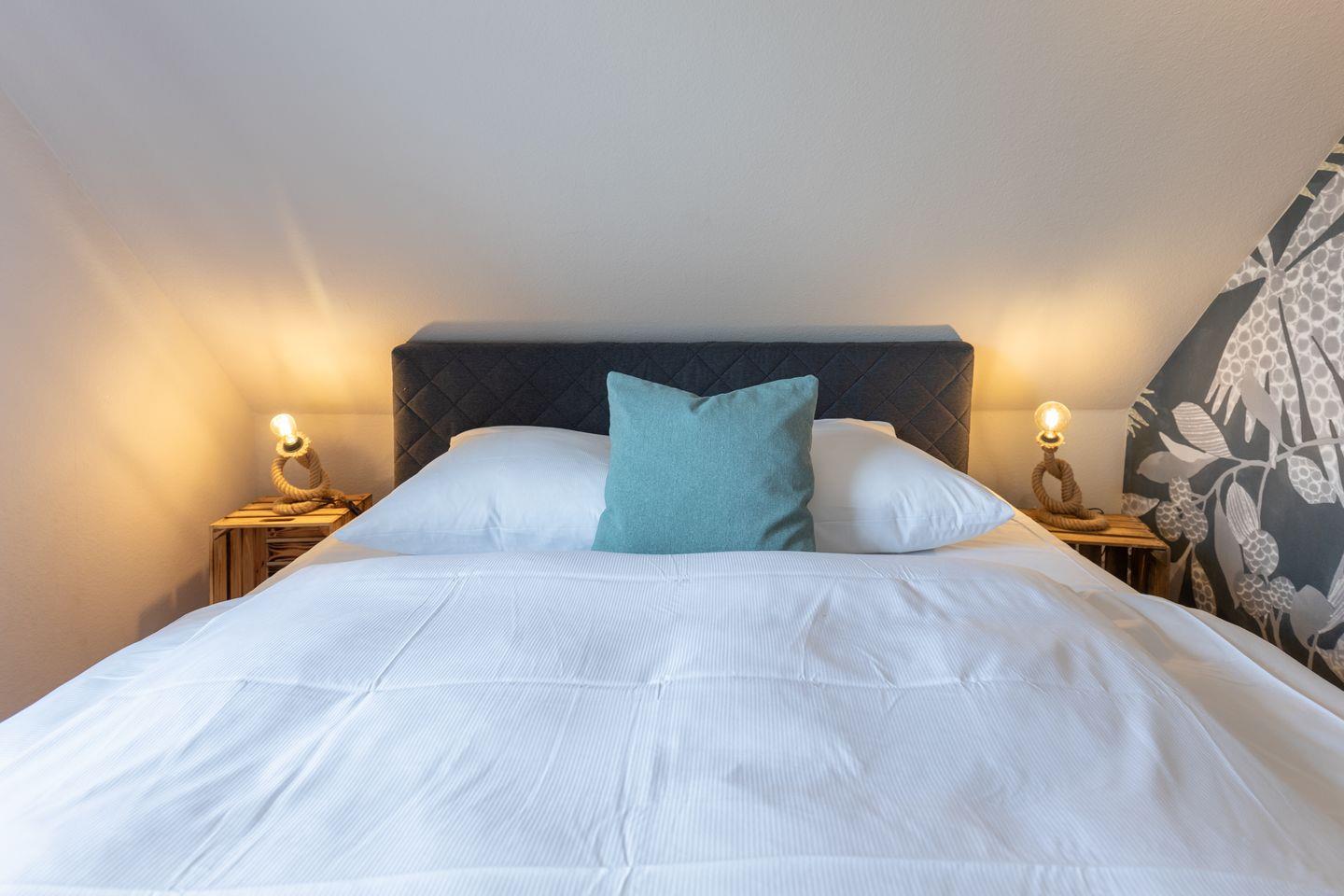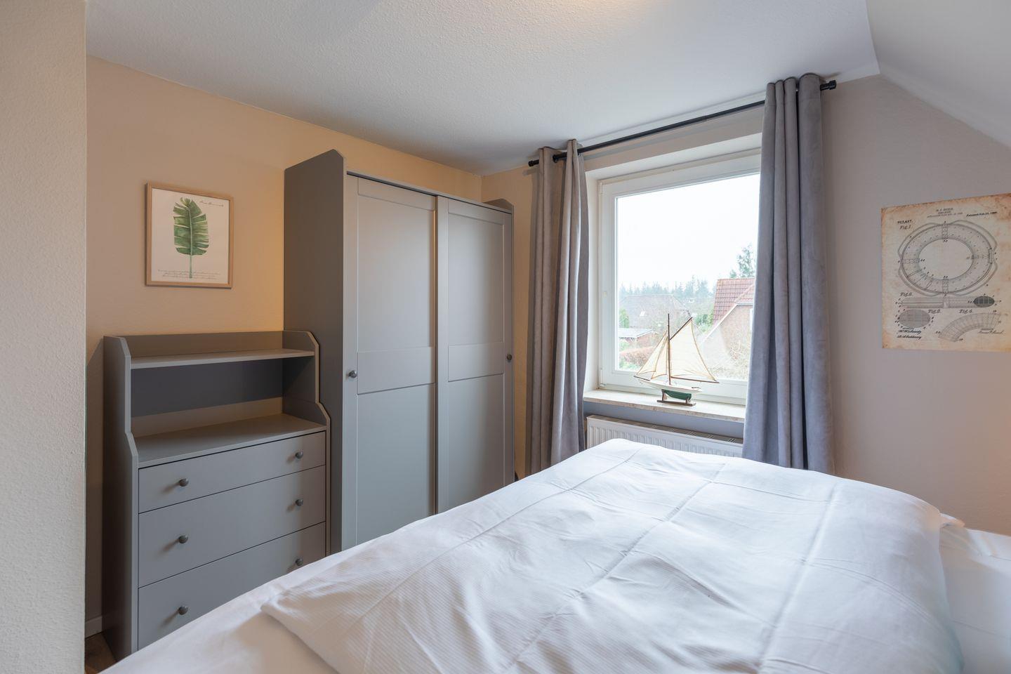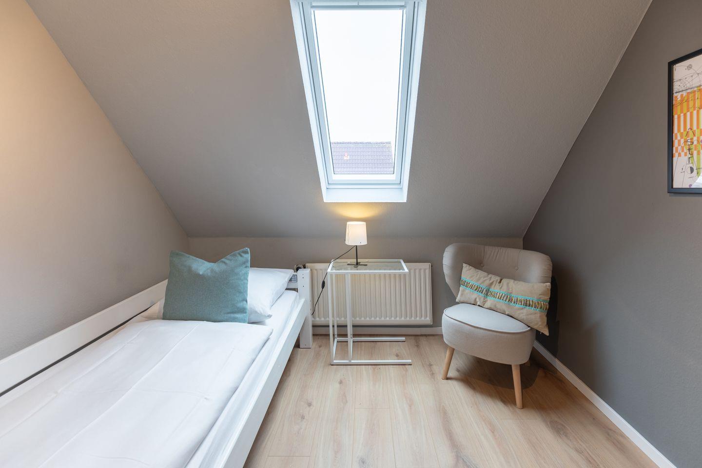 Über eine offene Treppe gelangen Sie ins Obergeschoss, wo sich die Schlafräume befinden. Ein Schlafzimmer verfügt über ein Boxspringbett (180 x 200 cm). Das zweite Schlafzimmer verfügt über ein Doppelbett in der Größe (160 x 200cm). Das dritte Schlafzimmer mit Einzelbett (90x 200cm) bietet zusätzlichen Platz.