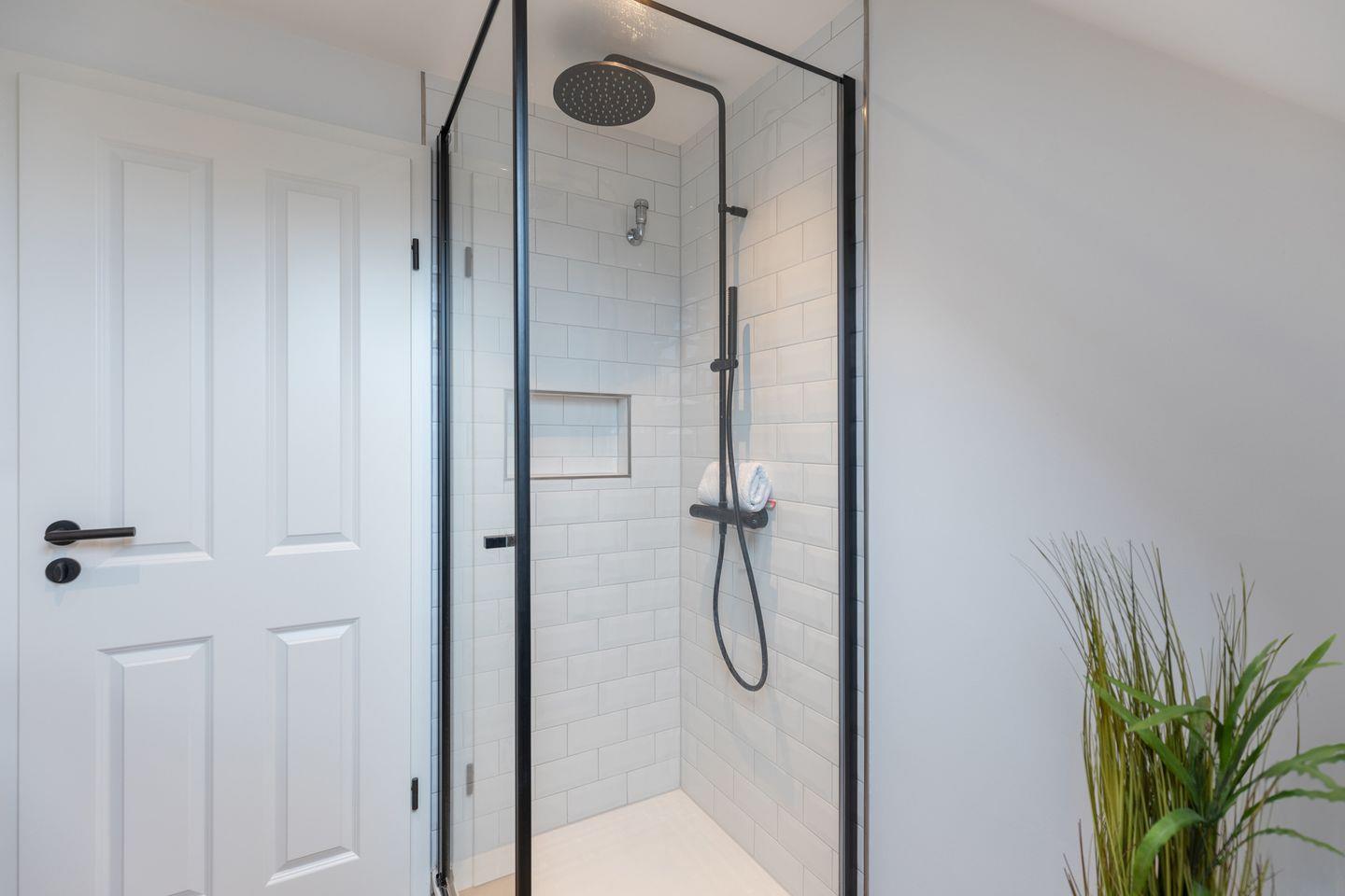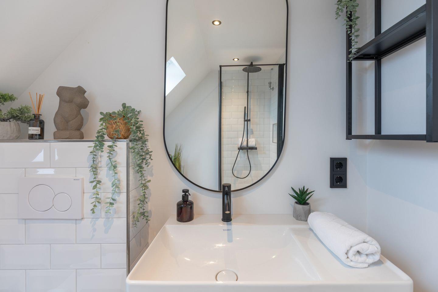 Das große, helle Bad mit Dusche sorgt für einen entspannten Start in den Tag.