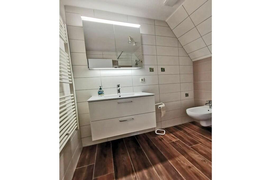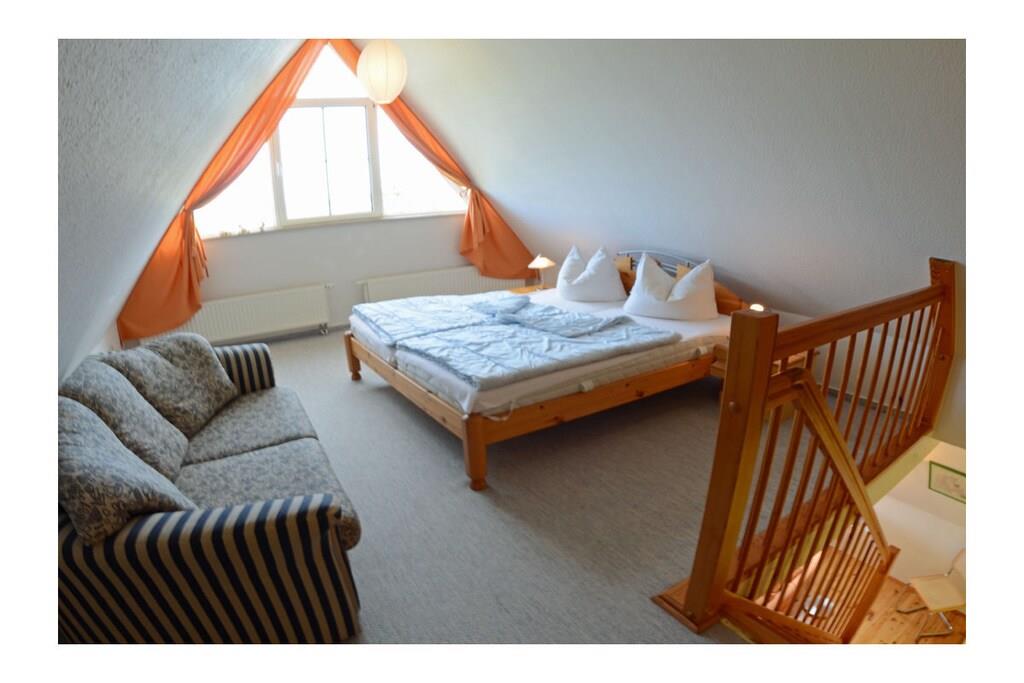 Die ca. 60 m² große Maisonette-Ferienwohnung für 3 Personen, befindet sich im ersten Obergeschoss und besteht aus einem großen Wohn-/ Essraum mit offener, voll ausgestatteter Küche (Kühlschrank mit kleinem Gefrierfach, Geschirrspüler, 4 Platten-Ceranherd, Backofen, Mikrowelle, Esstisch für 4 Personen), TV/ Sat (Flatscreen), Stereoanlage mit CD, großen Fensterfront mit Zugang zum gemütlichen Holzbalkon mit Sitzmöbeln. Abstellraum mit Waschmaschine, Wäscheständer und Bügeleisen. Bad mit Badewanne, WC und Waschbecken. Das separate Schlafzimmer im Dachgeschoss ist über eine Holztreppe erreichbar und hat ein Doppelbett mit 180 cm x 200 cm (offenes Fußende), sowie ein Schlafsofa mit einer Liegebreite von 140 cm und einen Kleiderschrank. Die Ferienwohnung ist sehr großzügig, hell und mit einem Holzfußboden und einem drehbaren Bar-Fernsehcenter ausgestattet.