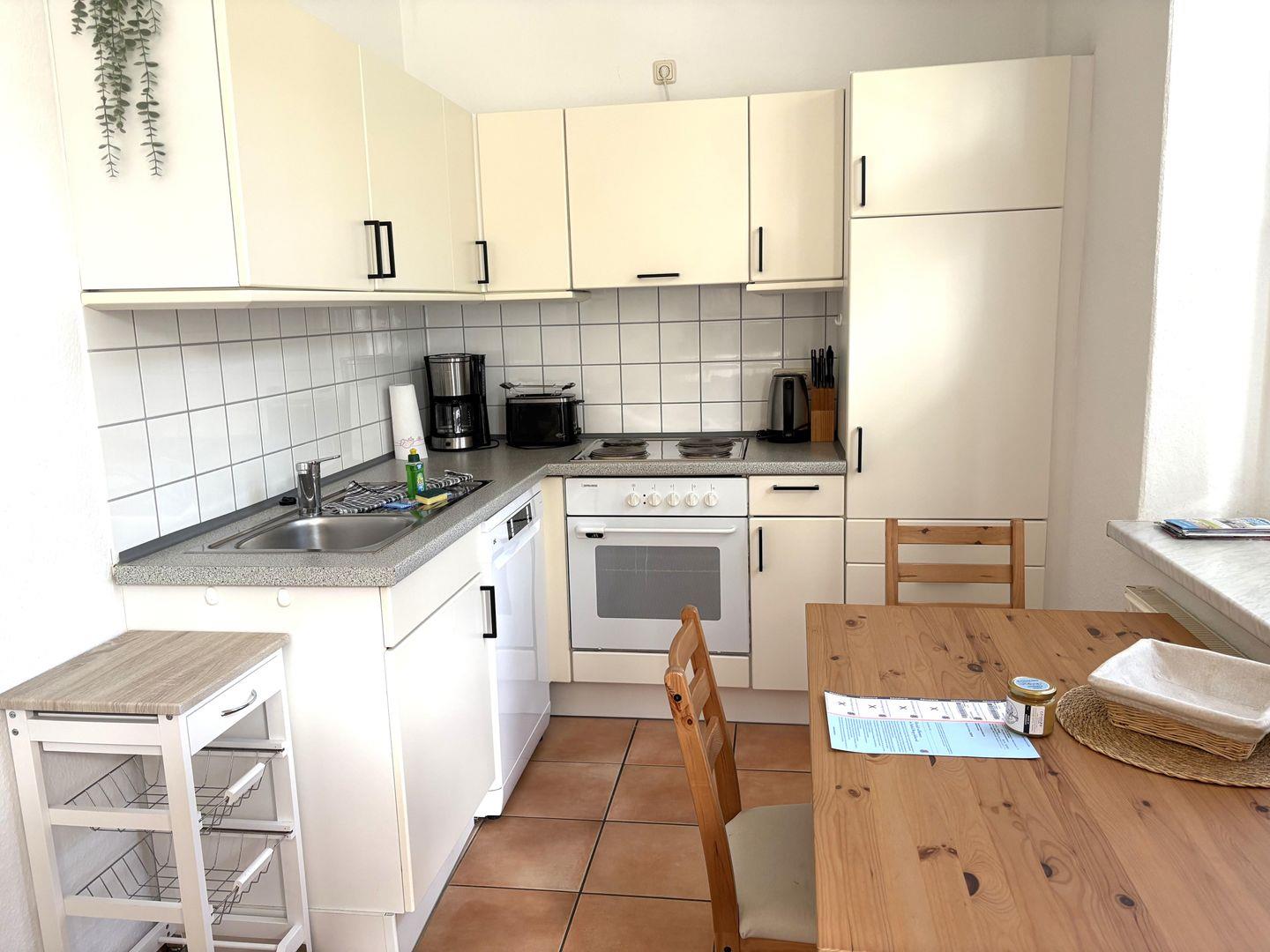 Die moderne und komfortabel eingerichtete Ferienwohnung besteht aus 1 Schlafzimmer mit Schreibtisch, 1 Wohnzimmer mit Schlafsofa, 1 voll ausgestatteten Küche (Kühlschrank, Backofen, Kaffeemaschine etc.) sowie 1 Badezimmer mit Badewanne und Haartrockner. Darüber hinaus verfügt die Ferienwohnung über einen Balkon, der zu einem Frühstück in der Sonne einlädt und einer kuratierten Auswahl von Gesellschaftsspielen, Büchern und DVDs als Schlecht-Wetter-Alternative.