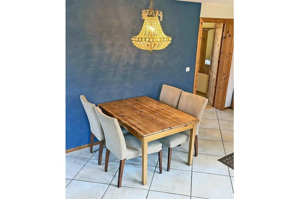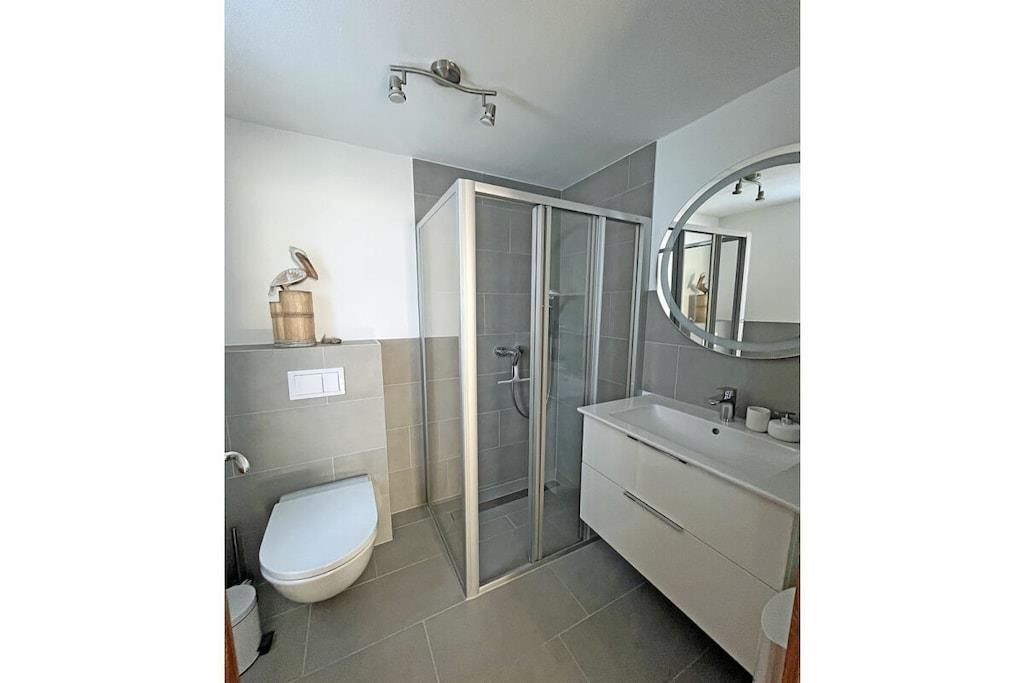 Ground floor: spacious living-dining area with comfortable sofas, satellite TV, radio, DVD player, internet, open-plan, fully equipped kitchen with 4-burner ceramic hob, oven, refrigerator with small freezer compartment, dishwasher, and various electrical appliances, bathroom with shower and toilet, 1st bedroom with double bed and wardrobe. Upper floor: 2nd bedroom with two single beds and a wardrobe. Outdoor area: Terrace with garden furniture, garden chairs, parasol, and barbecue.