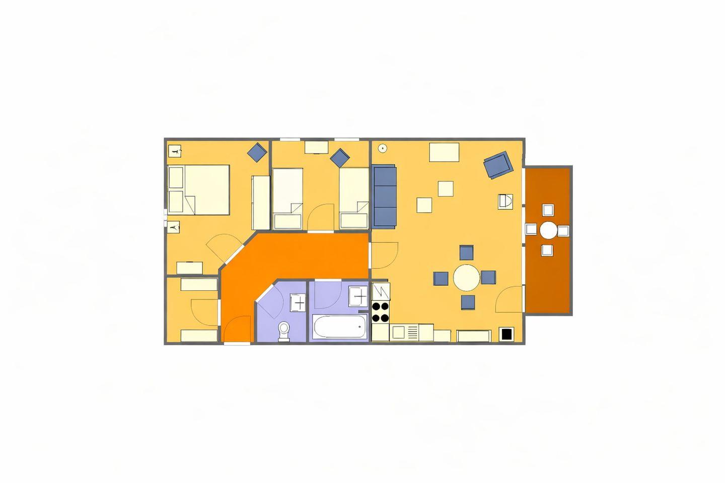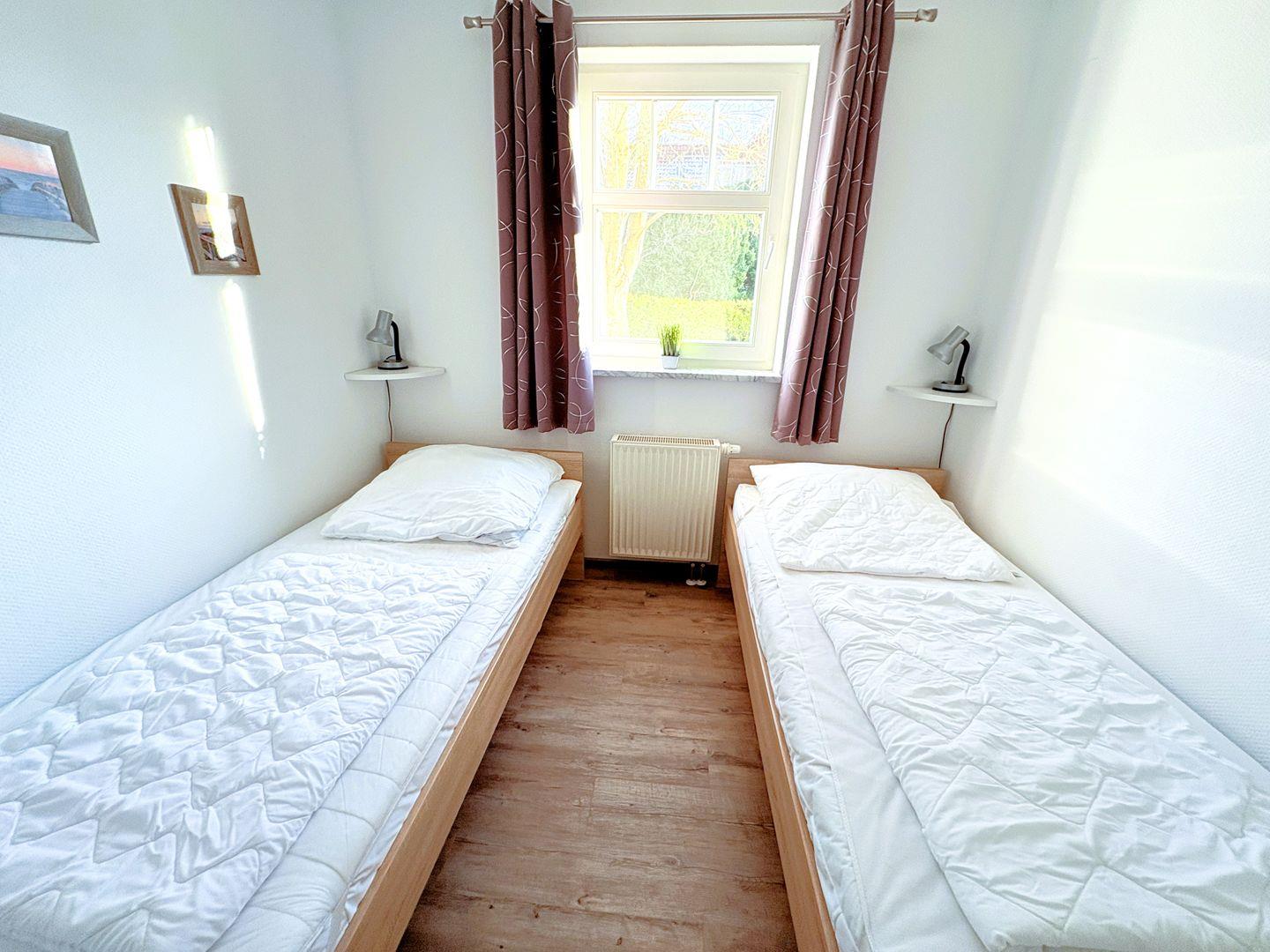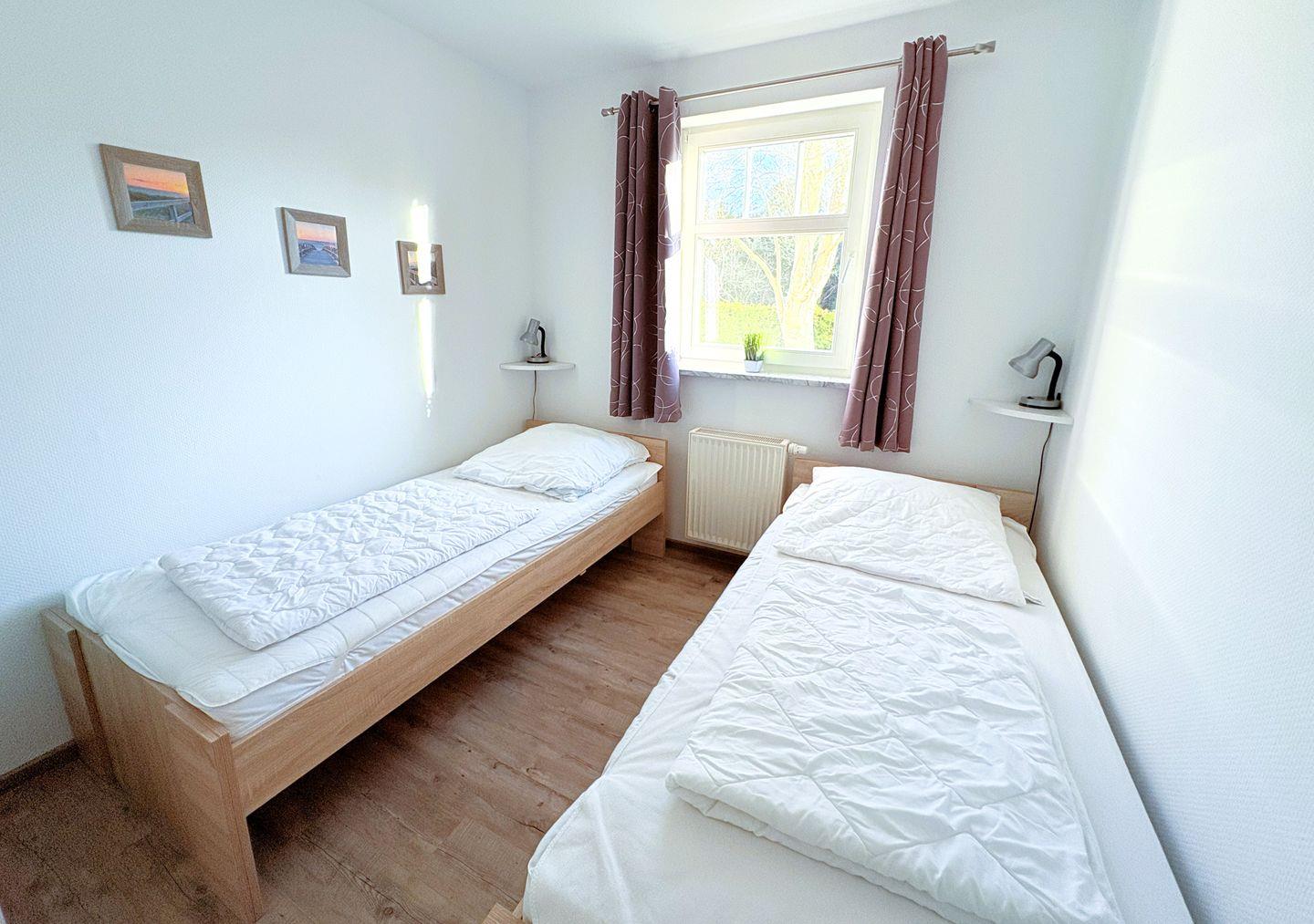 ein Schlafzimmer mit Doppelbett sowie ein weiteres Schlafzimmer mit zwei Einzelbetten. Zusätzlich steht im Wohnbereich eine ausziehbare Schlafcouch (1,25 × 2,00 m) zur Verfügung.