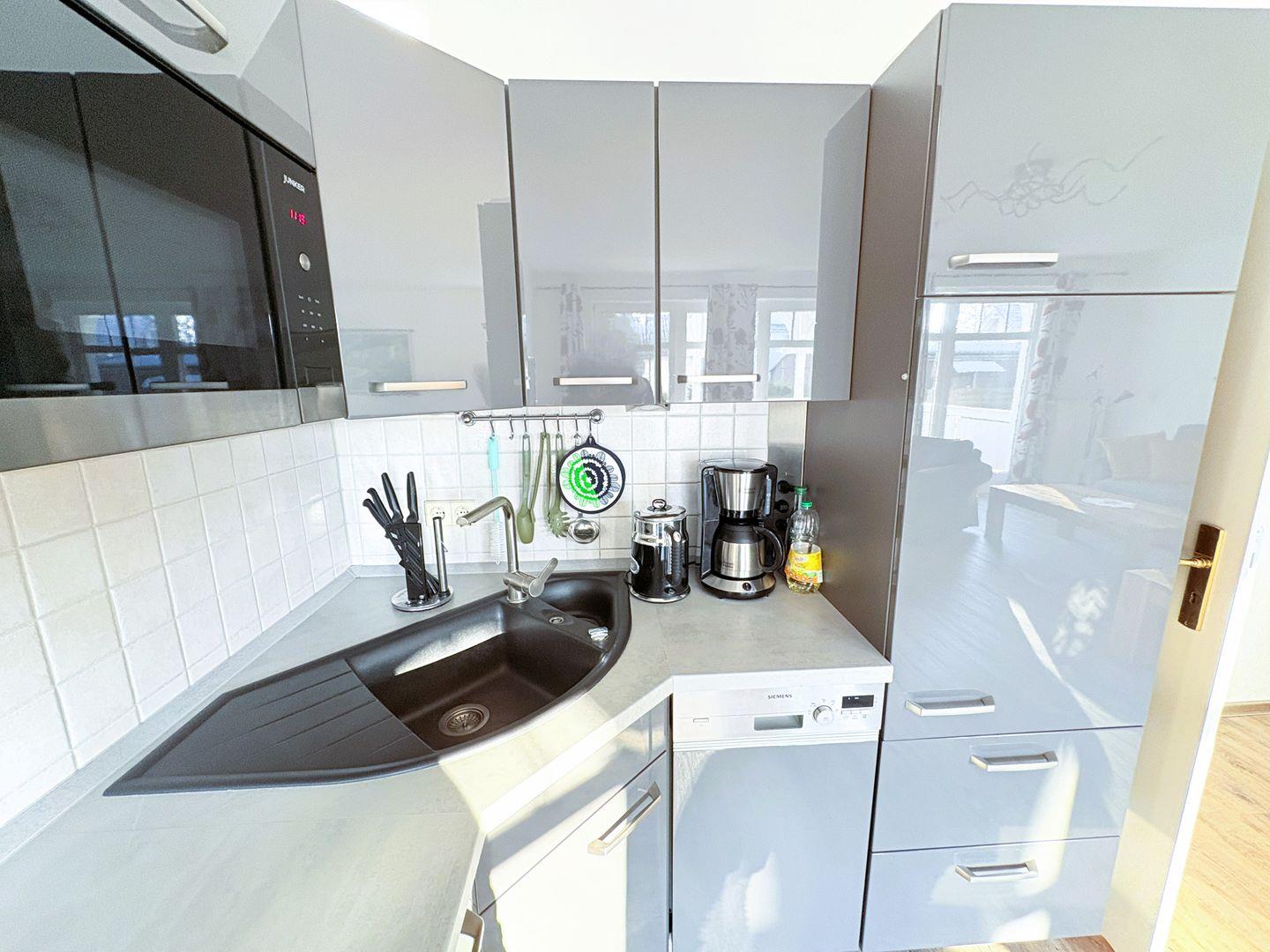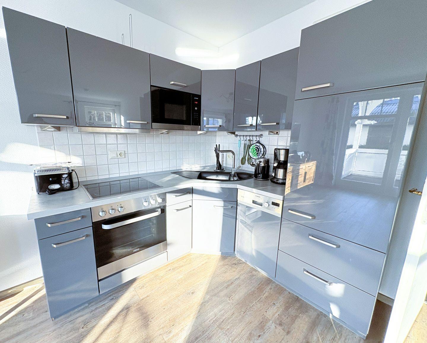 Die Küchenzeile ist gut ausgestattet und verfügt über Geschirrspüler, Backofen, Kühlschrank mit Gefrierfach, Kaffeemaschine und Toaster.