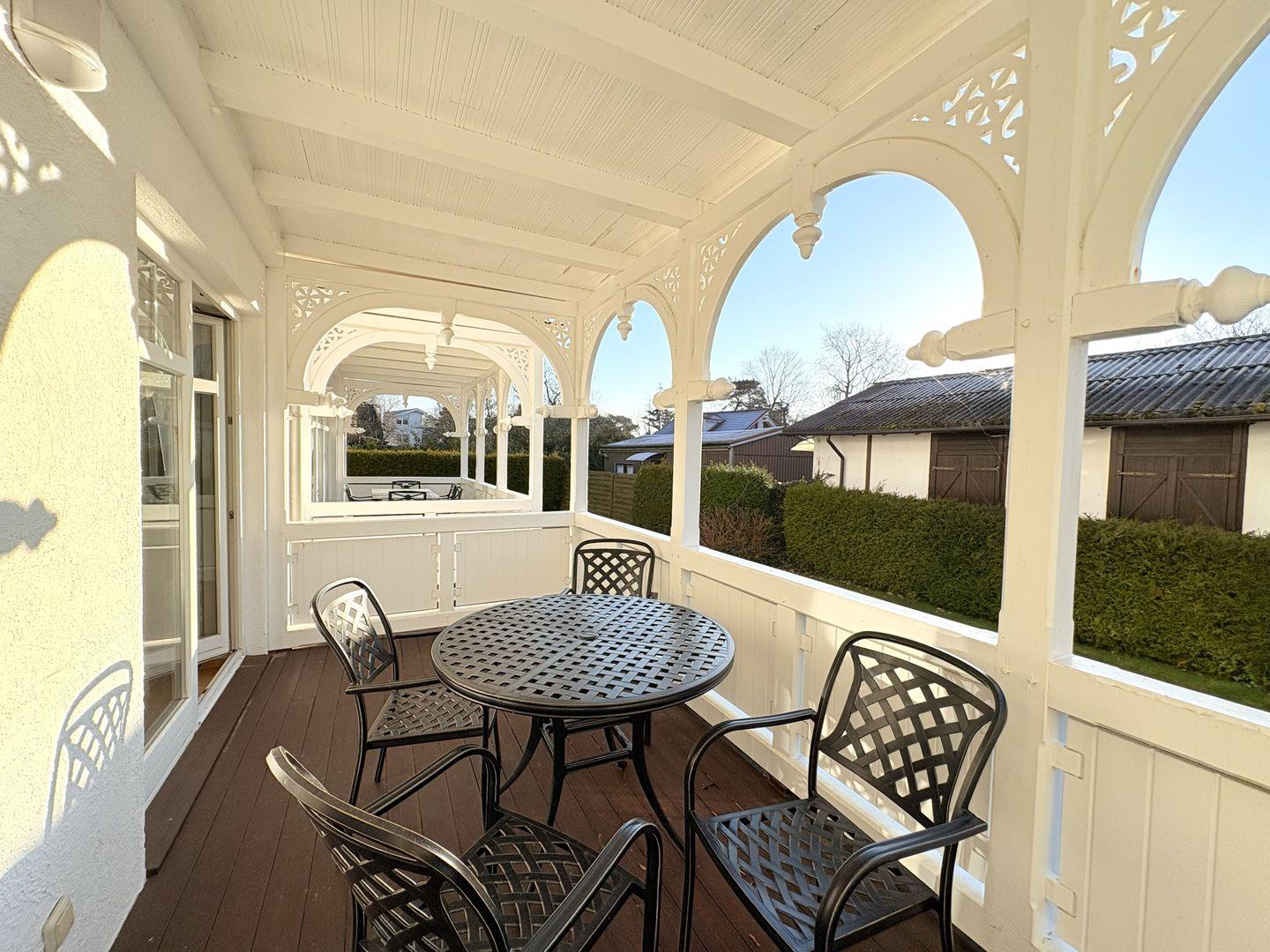- Überdachter Balkon mit Tisch und Stühlen