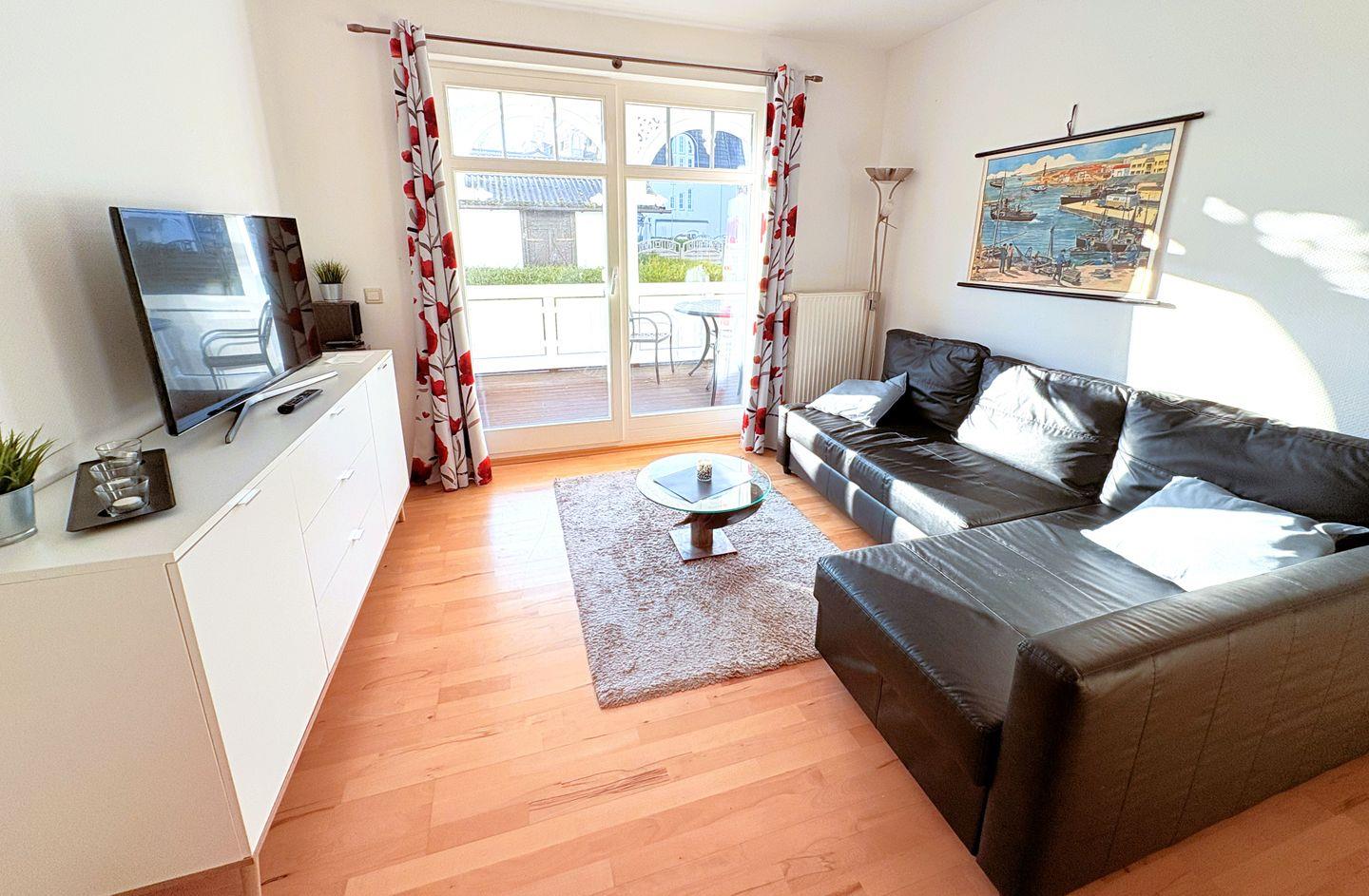 Moderne 2-Zimmer-Ferienwohnung im Erdgeschoss der Strandresidenz Juliusruh (Haus II), nur 150 m vom Strand Schaabe entfernt. Auf ca. 50 m² bietet sie Platz für bis zu 4 Personen und verfügt über Balkon, WLAN, Parkplatz sowie ein separates Schlafzimmer. Haustiere sind nicht erlaubt.