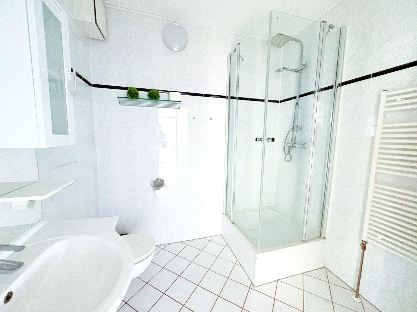Das Badezimmer verfügt über Dusche, Waschbecken, WC und Föhn.