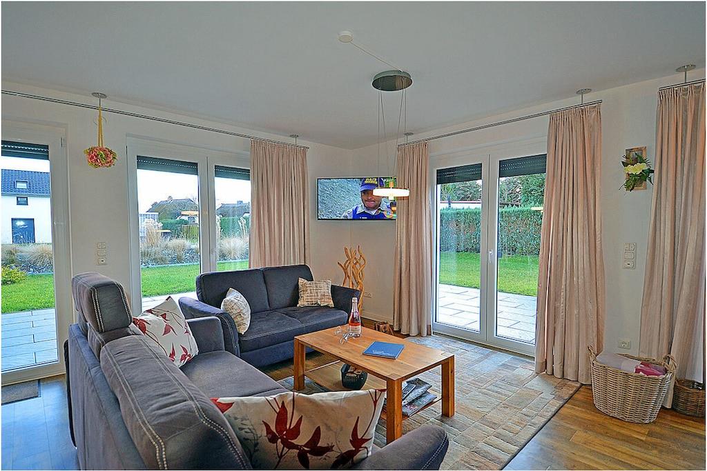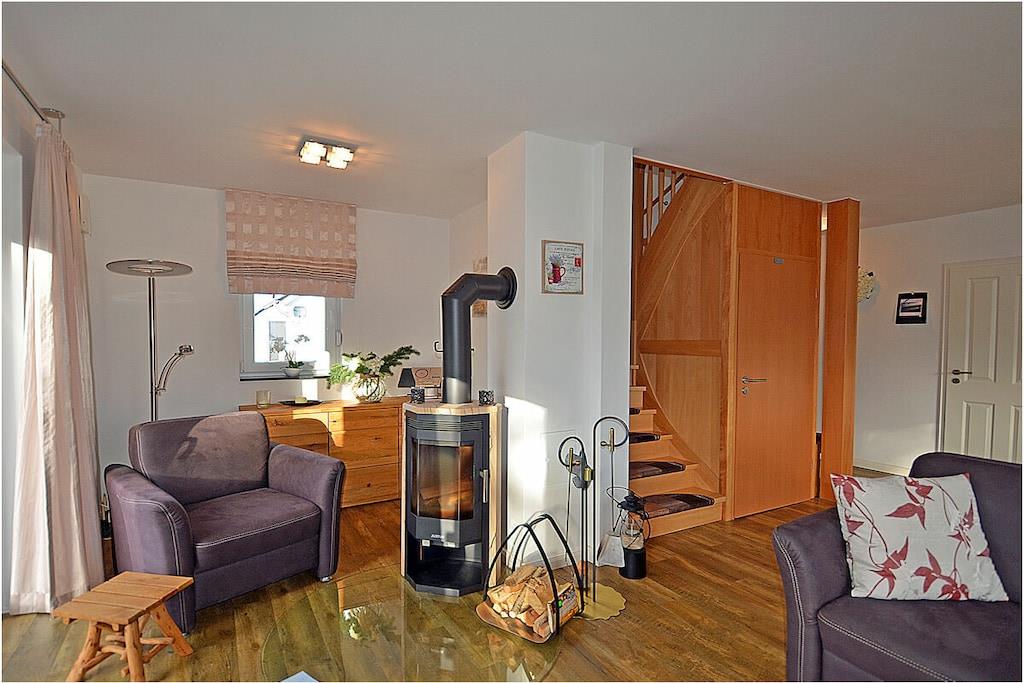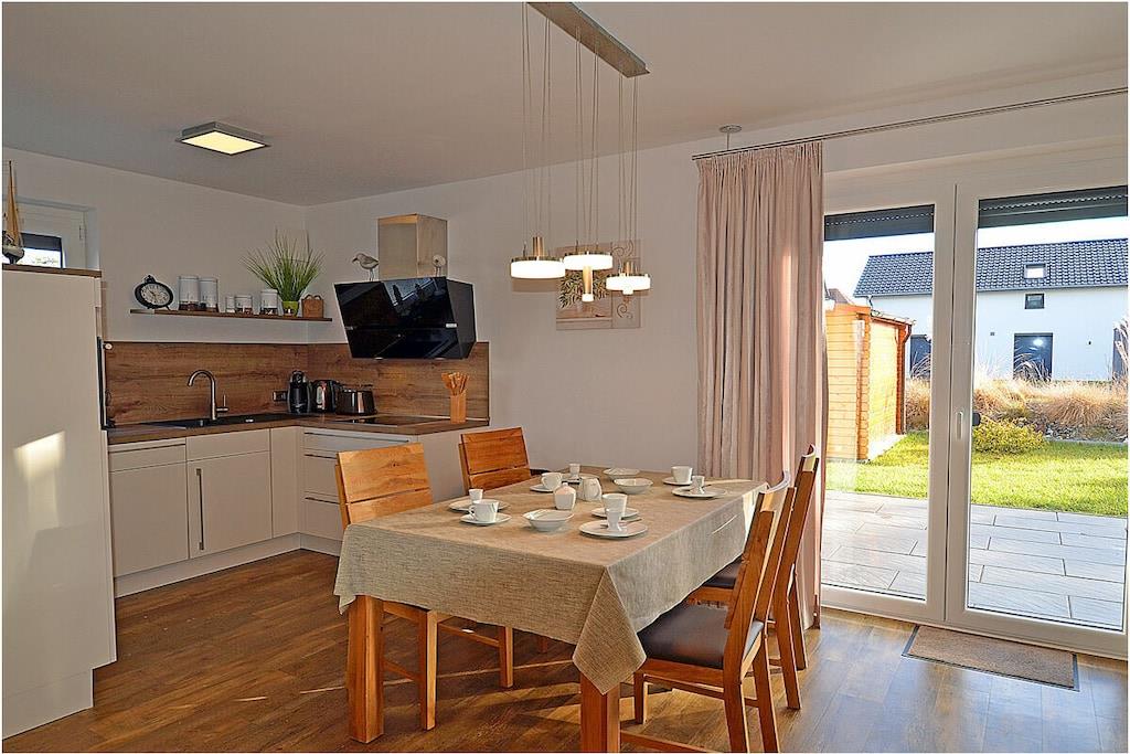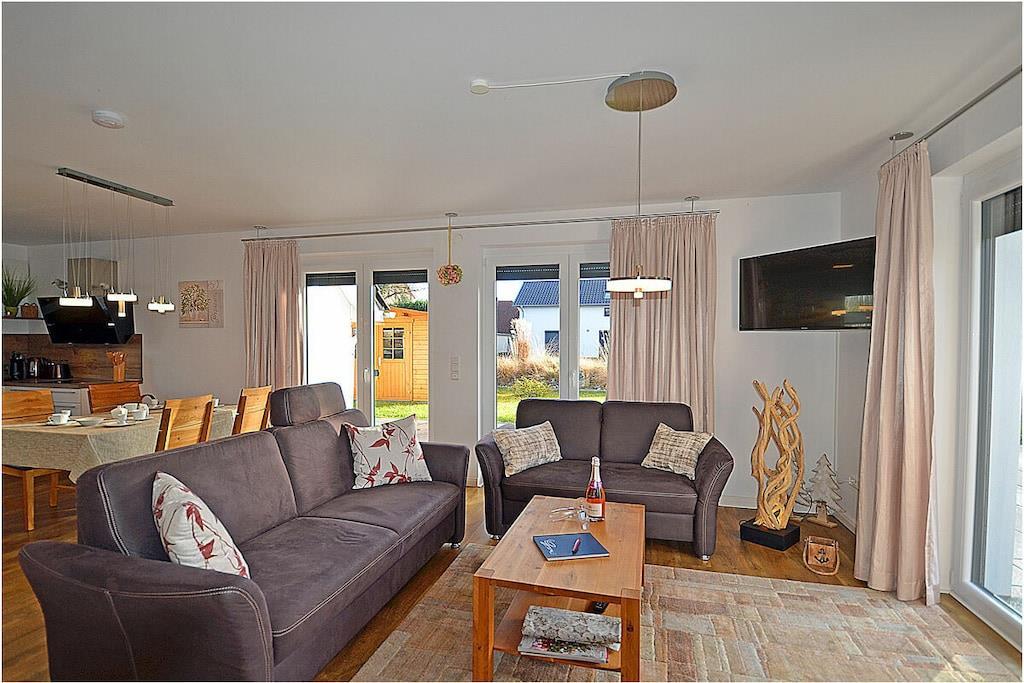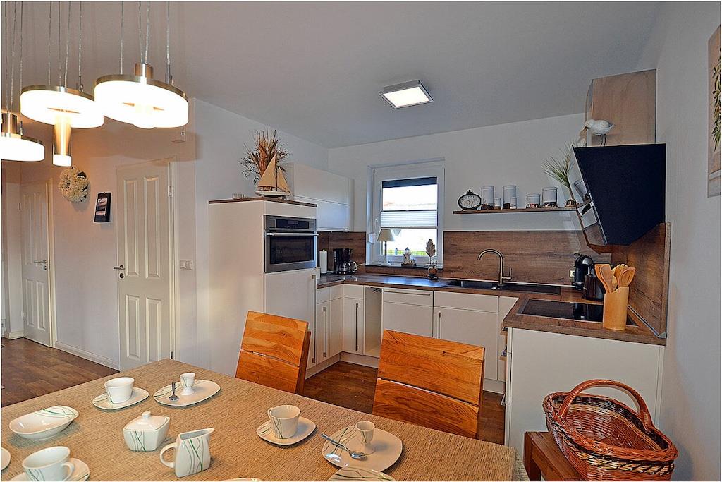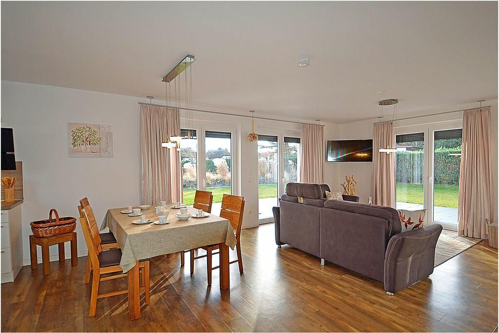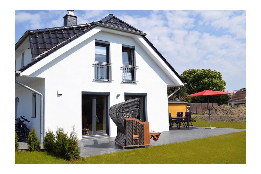 Erdgeschoss: großzügiger und lichtdurchfluteter Wohn- & Essbereich mit Kamin und gemütlicher Couchlandschaft mit Sessel, TV-Sat (Flatscreen) und Radio/CD-Player, Gesellschaftsspiele und Bücher für gemütliche Abende stehen zur Verfügung, offene komplett ausgestattete Einbauküche mit 4-Plattenherd (Induktion) und Esstisch, Backofen, Kühlschrank mit kleinem Gefrierfach, Geschirrspüler, Waschmaschine und diversen Elektrogeräten (Mikrowelle etc.), Gäste-WC Obergeschoss: 1. Schlafzimmer mit einem Doppelbett (getrennte Matratzen je 90×200) und Kleiderschrank, 2. Schlafzimmer mit 2 Einzelbetten (je 90×200), Kleiderschrank und TV/Sat (Flatscreen), großes Bad mit Dusche und WC, Föhn und Kosmetikspiegel Außenbereich: große Terrasse zum Grillen und Entspannen mit gemütlichen Gartenmöbeln für 4 Personen und großem Sonnenschirm (Grill vorhanden), ein Strandkorb lädt zum Relaxen ein, 3 Fahrräder für Erwachsene stehen zur Verfügung (Nutzung ohne Gewähr), ein Spielball, ein kleines Klettergerüst und ein Federballset runden die Freizeitbeschäftigung am Ferienhaus ab Urlaub im „Lotsenhaus“ an der Ostsee Das große umzäunte Grundstück mit ca. 500m², bestehend aus Terrasse und Rasenfläche, bietet ausreichend Platz für Spiel, Spaß oder gemeinschaftliches Grillen für die ganze Familie. Im Haus ist Internet (WLAN) vorhanden und kostenfrei nutzbar. Für Ihre Kleinen gibt es einen Kinderhochstuhl und ein Kinderreisebett. Das Ferienhaus ist ein Nichtraucherquartier und alle Räume sind mit Fußbodenheizung ausgestattet. Die Waschmaschine ist ohne Gebühr nutzbar. Bügelbrett, Bügeleisen und ein tragbarer Wäscheständer gehören zur Ausstattung. Für Ihre mitgebrachten Fahrräder befindet sich am Objekt auch eine abschließbare Fahrradabstellmöglichkeit. Für die Anreise mit Ihrem Auto steht Ihnen ein eigener PKW-Stellplatz direkt vor der Ferienwohnung kostenfrei zur Verfügung. Zahlreiche Rad- und Wanderwege schaffen für Naturgenießer viele Möglichkeiten zur Erkundung der Schaabe, der Halbinsel Wittow, Kap Arkona und dem Fischerort Vitt. Nur 500 Meter entfernt, gibt es auch einen Fahrradverleih. Ca. 2 km entfernt in Altenkirchen finden Sie einen Netto, das Kaufhaus „Stolz“, Edeka und einen Getränkemarkt. Restaurants und Radverleih sind in der Nähe. Der ca. 400 m entfernte Breeger Hafen bietet Ausflugsmöglichkeiten per Schiff zur Insel Hiddensee, Boddenfahrten, Kranichfahrten und zu den Störtebeker-Festspielen. Eine Segelschule befindet sich ebenfalls im Seebad. Haustiere aus Rücksicht auf Allergiker sind nicht gestattet.