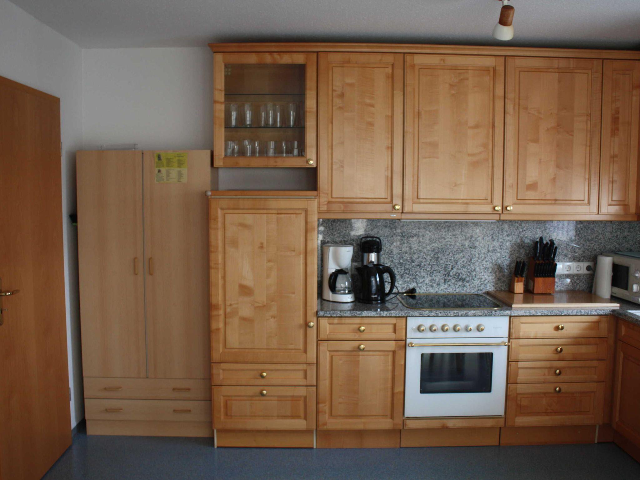 Die Einbauküche hat einen Elektroherd mit Backofen, einen Kühlschrank mit Gefrierfach, einen Geschirrspüler und eine Mikrowelle.
