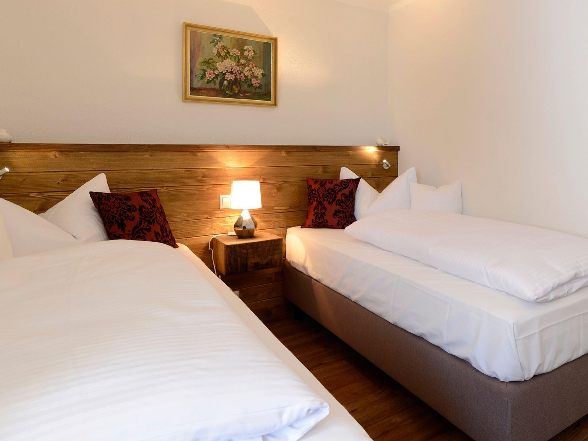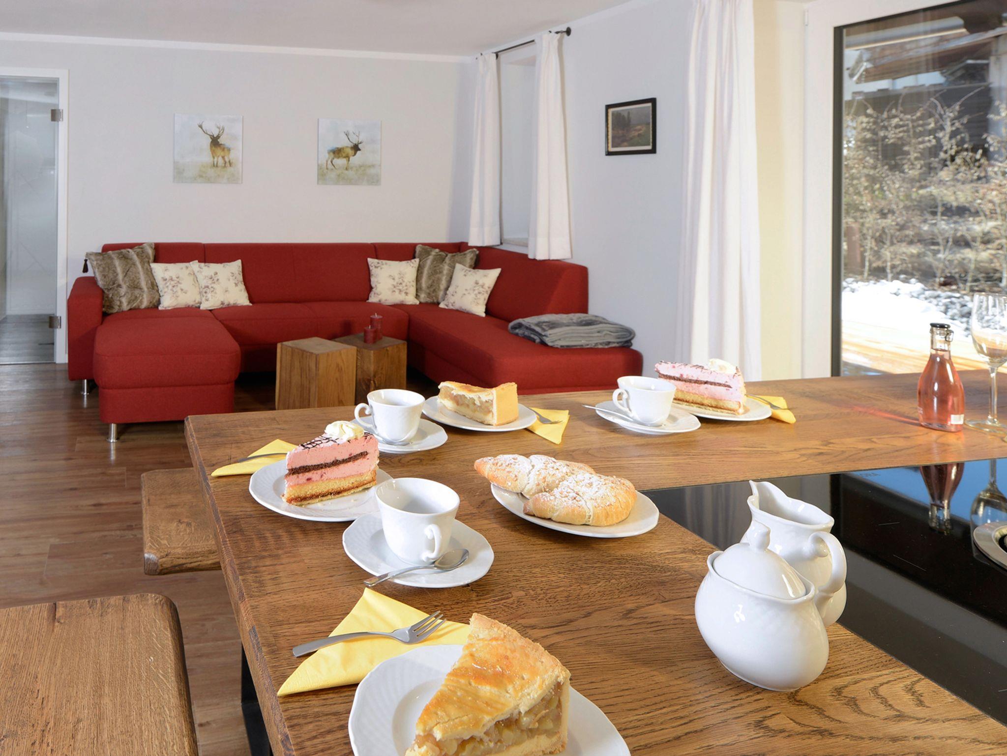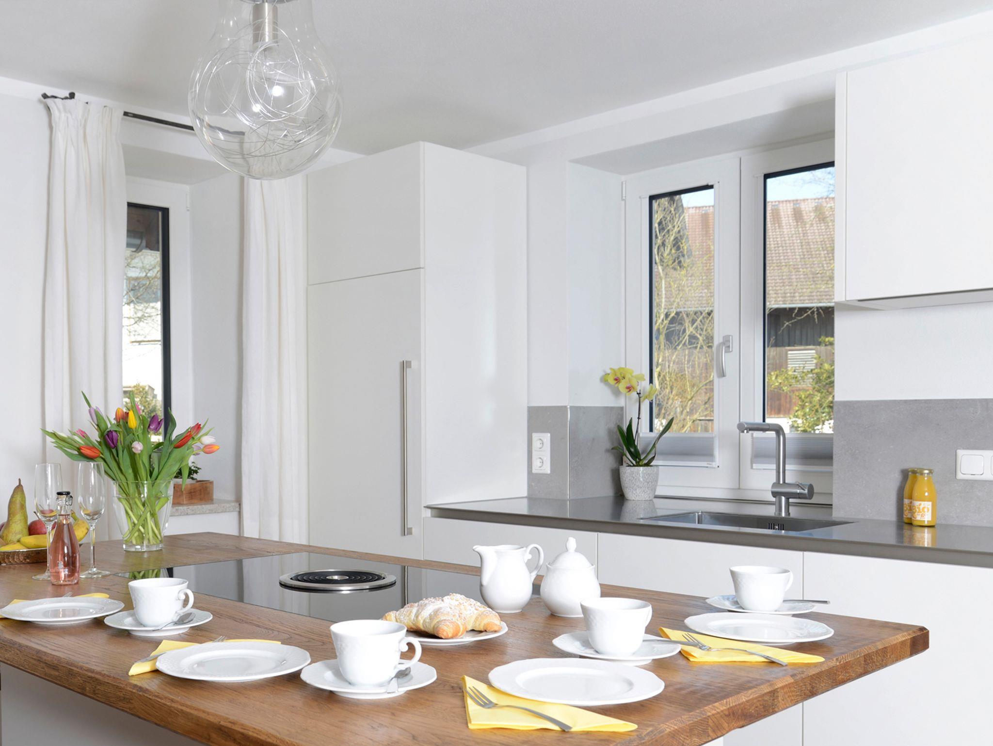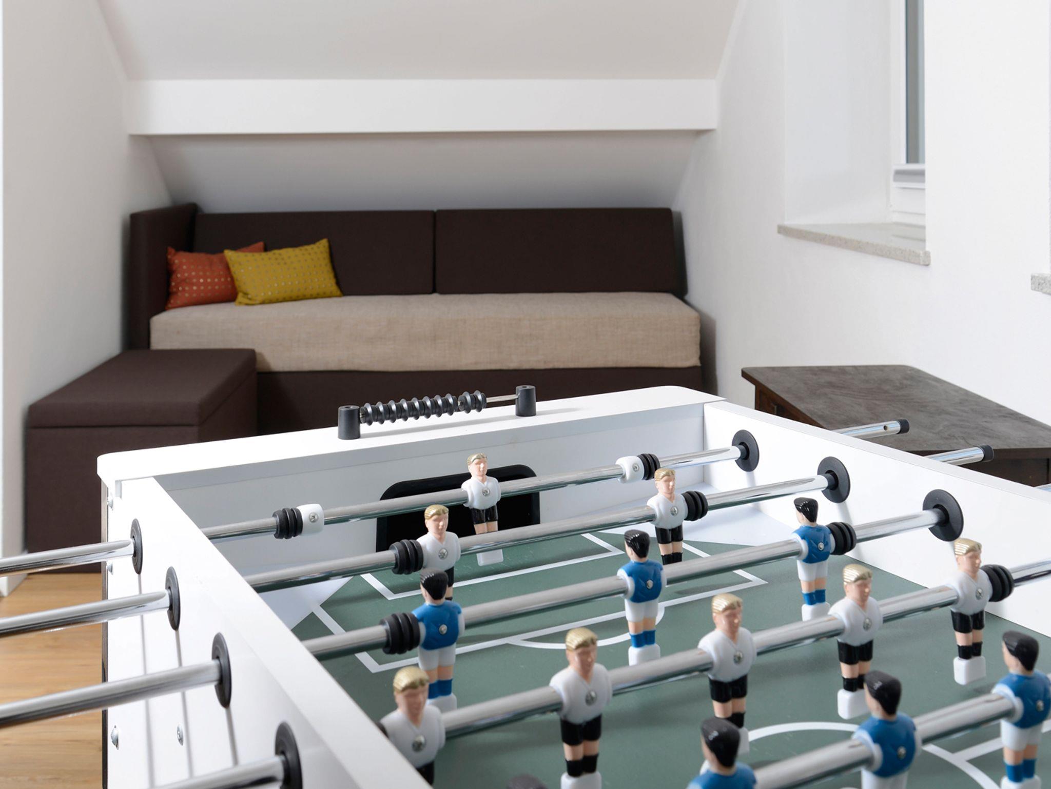 Die Ferienwohnung Geniessen erstreckt sich über zwei Etagen. Im ersten Stock erwartet Sie eine großzügige Werkhausküche mit Edelstahl Arbeitsflächen und einer Kochinsel mit BORA Induktionskochfeld und Sitzplätzen. In dieser Küche müssen Sie auf nichts verzichten. Eine Spülmaschine (Spültabs und Spülmittel incl.), Heißluftbackofen, Mikrowelle, Wasserkocher sowie ein Toaster, Raclette und natürlich ein Kaffeevollautomat stehen Ihnen hier zur Verfügung. Auch Grundgewürze wie Salz, Pfeffer, Zucker u.a. stehen für Sie bereit. Im selben Raum ist auch noch eine gemütliche Couch und das TV-Gerät. In der gleichen Etage befinden sich ein Doppelbett Schlafzimmer, sowie ein Schlafraum mit zwei Einzelbetten. Zudem ein Bad mit WC, Dusche, Waschtisch, Föhn und Handtuchtrockner. Toilettenartikel wie Handseife, Duschgel und Shampoo sowie ein Badradio sind selbstverständlich vorhanden. Für gemütliche Stunden im Freien steht Ihnen auf der schönen, sonnigen Terrasse mit Grillplatz nichts im Wege. Im Dachgeschoss ist ebenfalls ein Doppelbett-Schlafraum sowie ein Schlafraum mit zwei Einzelbetten, welcher Kinderherzen höher schlagen lässt. Ausgestattet mit einem Kicker und Xbox kann dieser Raum auch als weiterer Aufenthaltsraum genutzt werden. Ein zusätzliches Bad mit WC, Dusche und Badewanne sowie Föhn und allen Toilettenartikeln finden Sie auch im DG vor. Alle DG-Zimmer haben eine Klimaanlage. Kaffebohnen und Waschpulver stellen wir Ihnen gerne gegen Entgelt zur Verfügung. In diese Wohnung können Sie auch gerne Ihren Hund mitbringen.