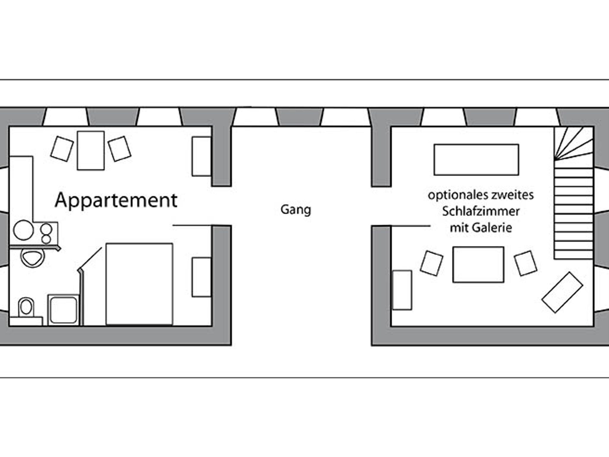 Das Appartment liegt auf der Südseite des Hauses mit Gemeinschaftsbalkon und verfügt über einen kombienierten Wohn-Schlafraum mit Küche, Dusche/WC.