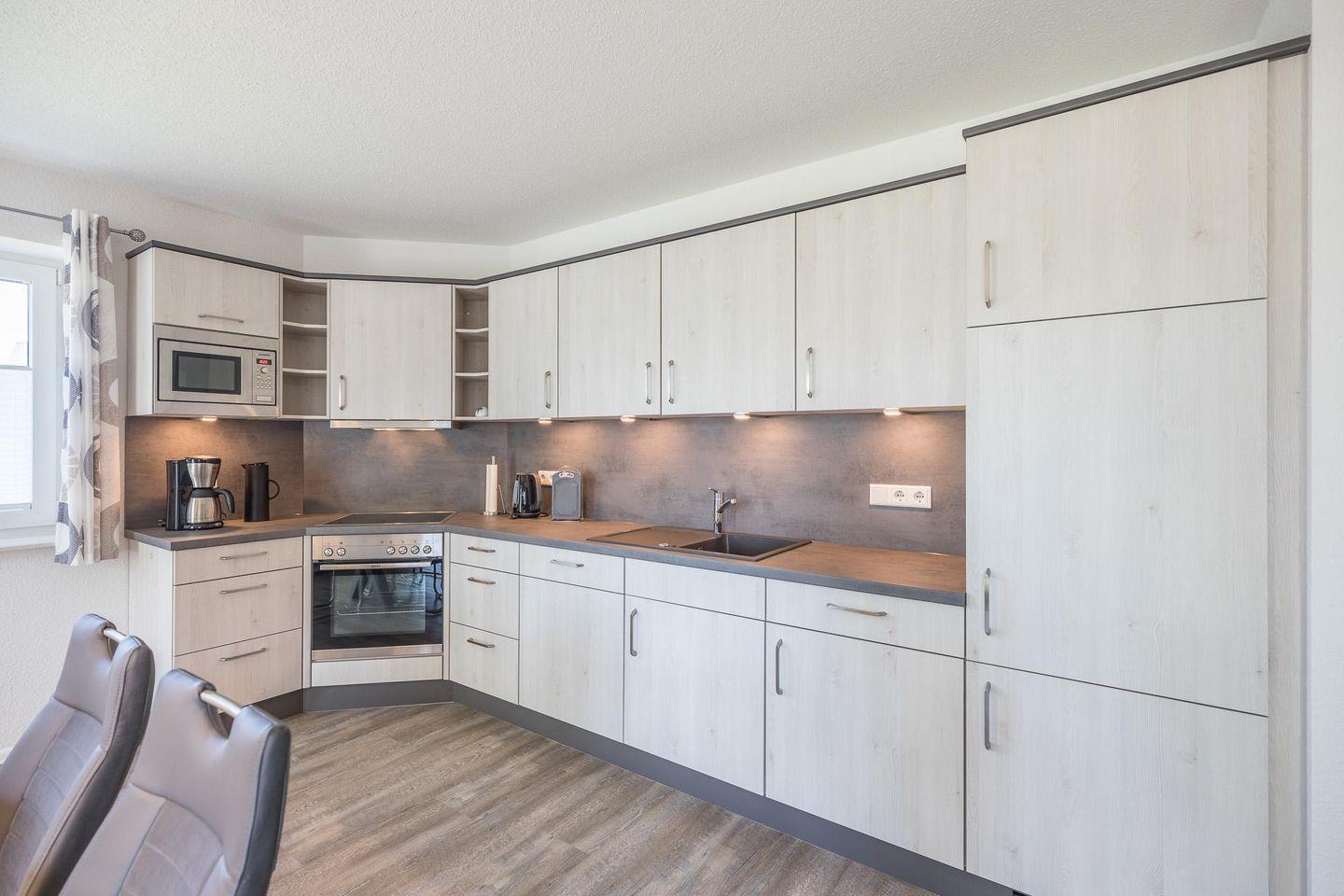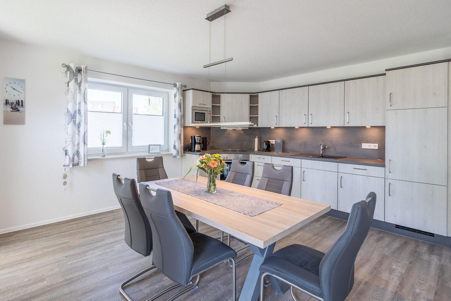 Entdecken Sie unsere charmante Ferienwohnung, das mit 100 qm großzügigen Wohnraum für Ihre Entspannung und Erholung bereitstellt. Im Mittelpunkt des stilvollen Interieurs steht das einladende Wohnzimmer, ausgestattet mit einem Flachbild-TV, ideal für gemütliche Abende. Die offene Küchenlandschaft lädt zum gemeinsamen Kochen ein: Hier finden Sie alles, was das Herz begehrt – von einem modernen Ceranherd und Backofen über eine Geschirrspülmaschine bis hin zu einem Kühlschrank. Auch kleinere Geräte wie Toaster, Wasserkocher und eine Filterkaffeemaschine fehlen nicht. Der große Esstisch bietet den perfekten Rahmen für Mahlzeiten in geselliger Runde.