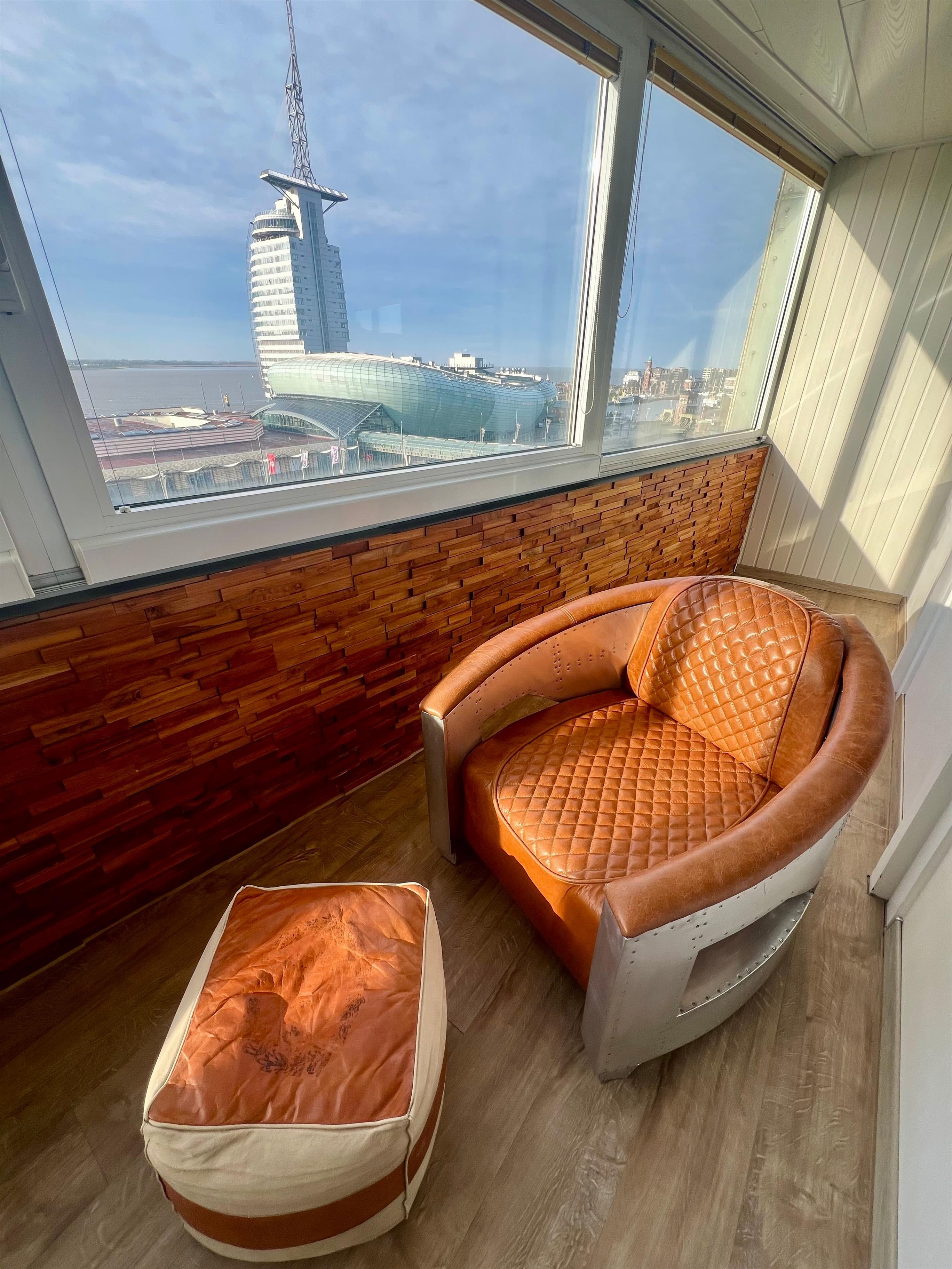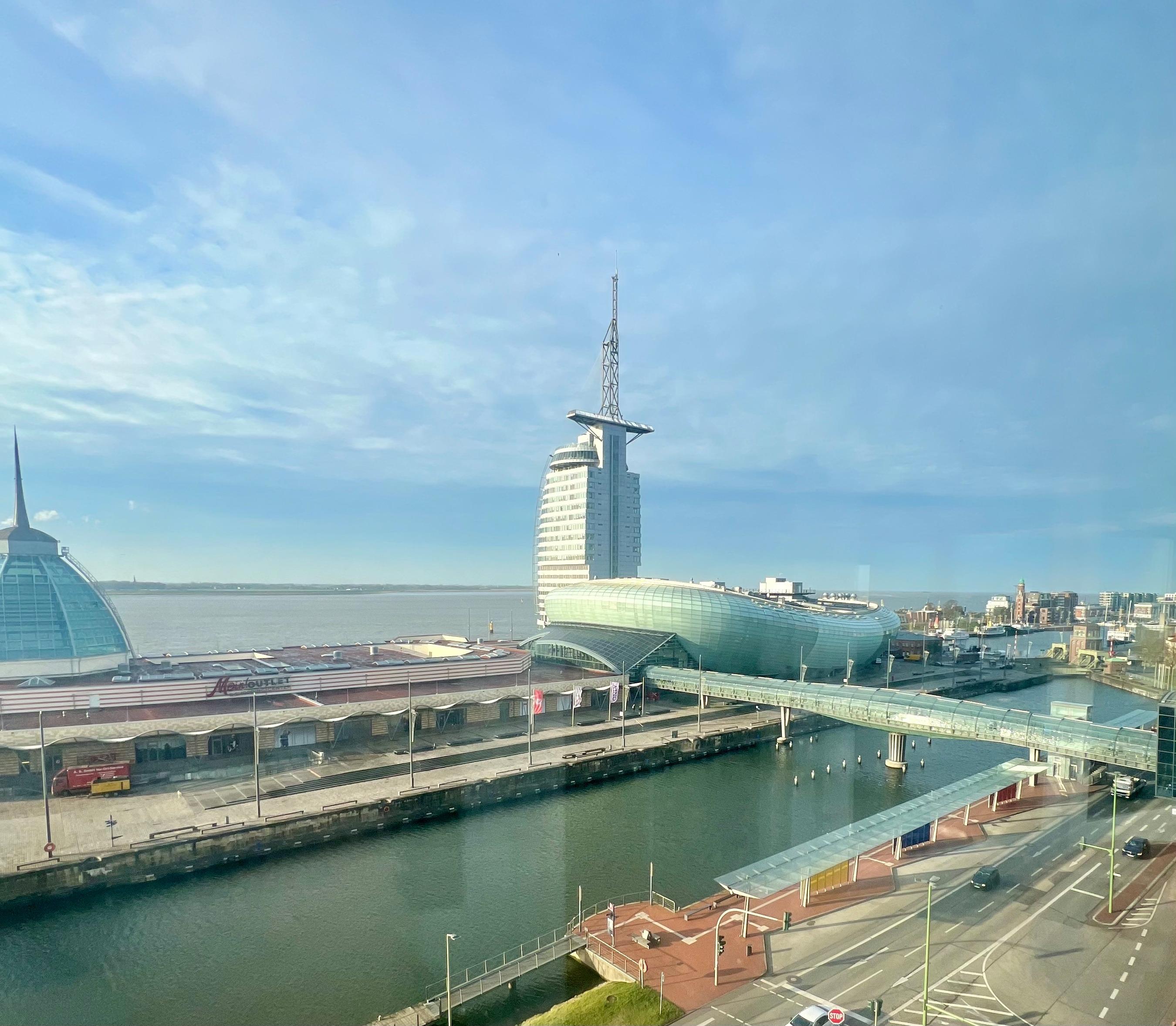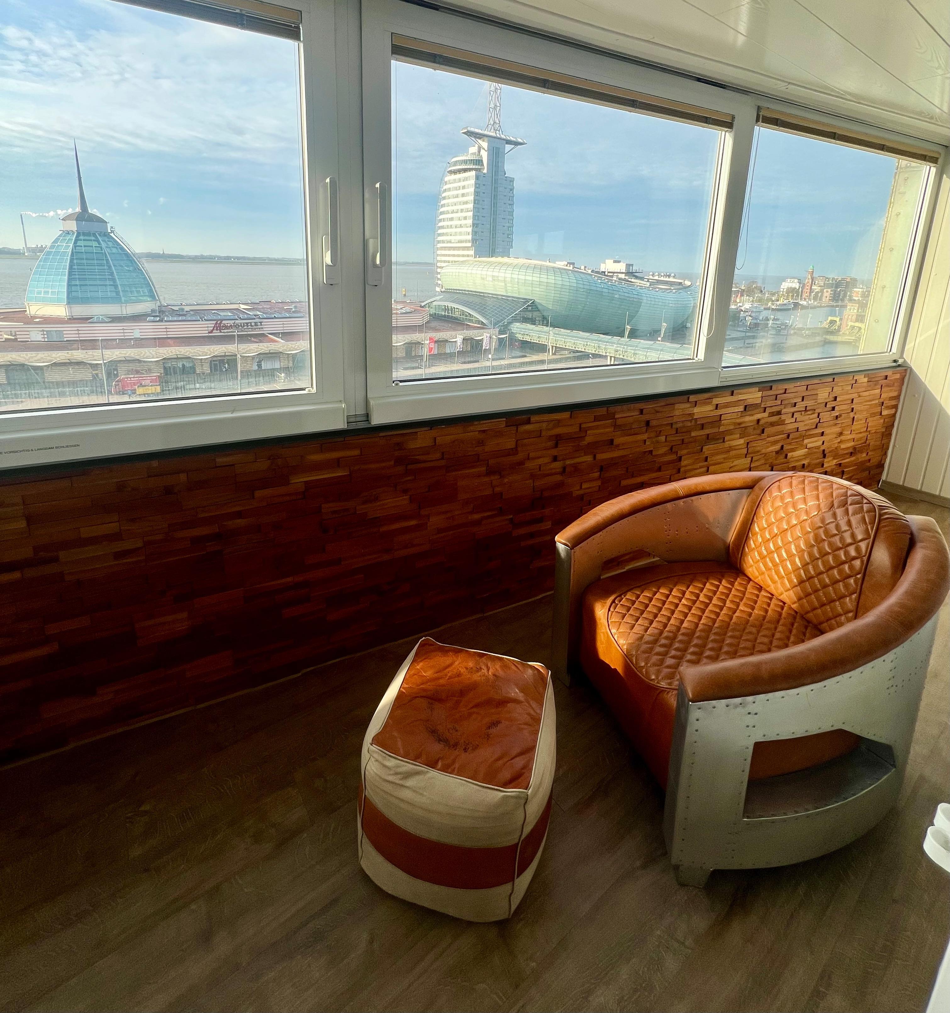 Das Ferienappartement befindet sich im 8. Stock des Columbus Centers, mitten im maritimen Geschehen der Seestadt. Genießen Sie vom großen Wohnzimmer mit Bar den uneingeschränkten Blick auf die Weser, Nordseemündung, Havenwelten und sogar die Containerbrücken mit denen die größten Containerschiffe der Welt be- und entladen werden.