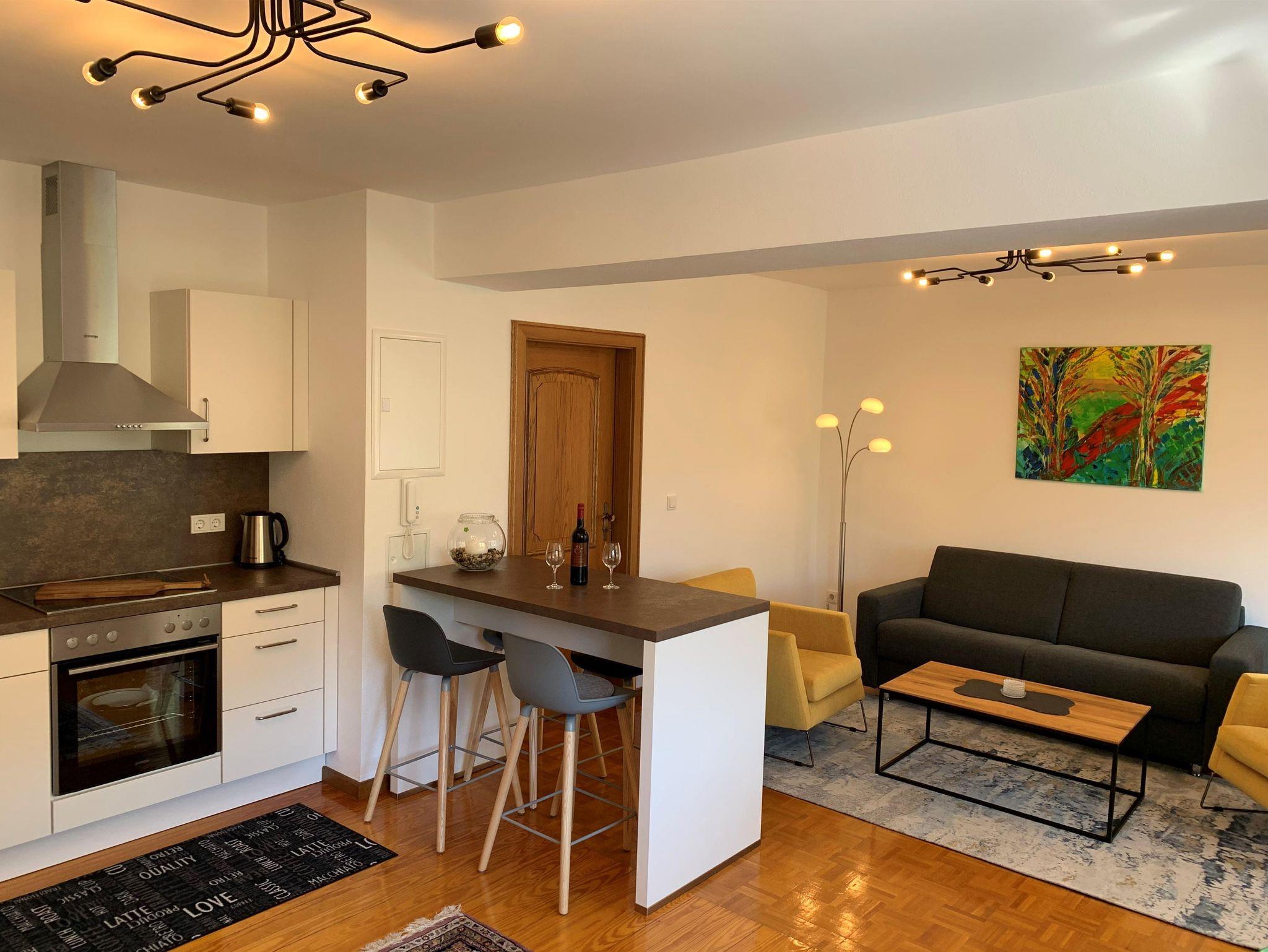 Koch- und Wohnbereich ist durch einen Hochtisch mit 4 Barhockern getrennt, der zum gemeinsamen Kochen mit einem guten Glas
