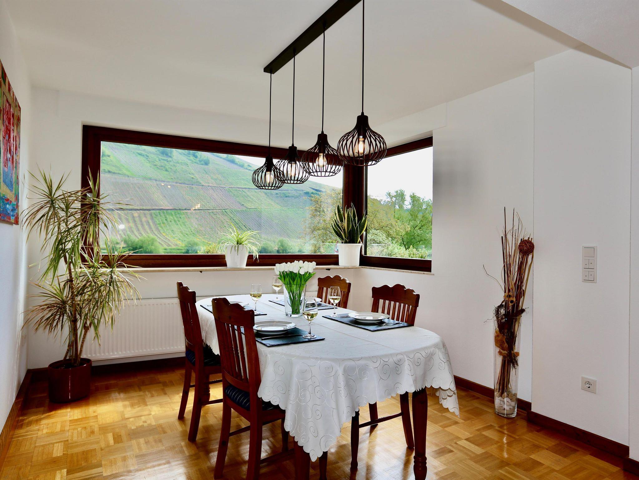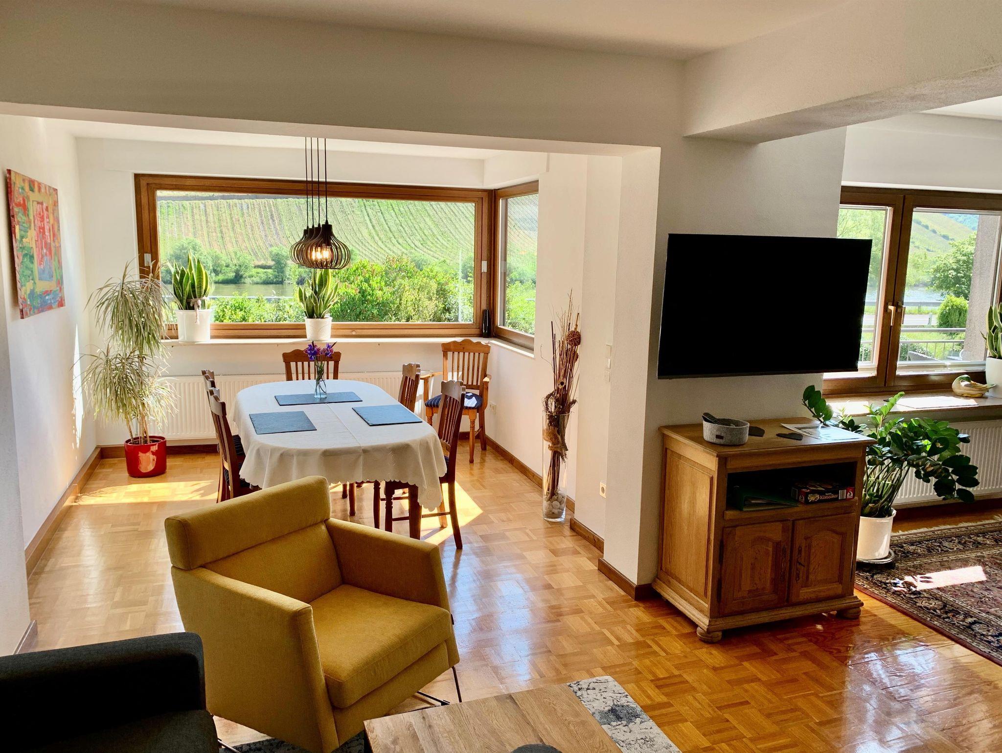 Moselwein einlädt. Von dem gemütlichen Essbereich sehen Sie durch eine große Fensterfront auf die Mosel und Weinberge. Der gemütliche Essbereich bietet Platz für 6 Personen und kann bei Buchung mehrerer Ferienwohnungen auf 12 Personen erweitert werden.