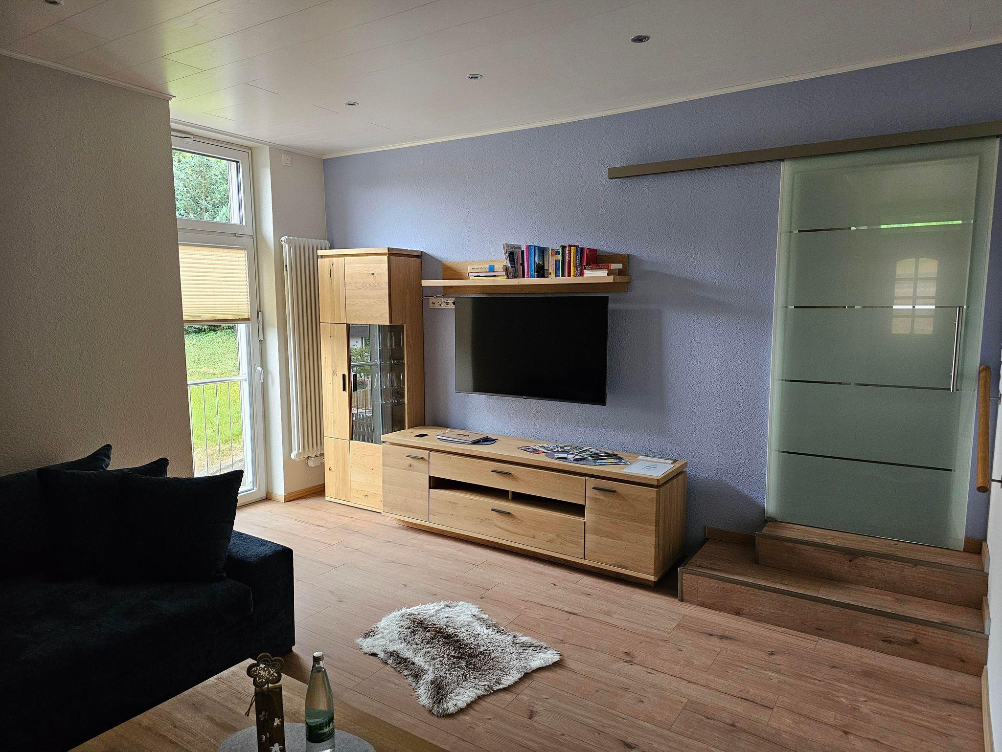 Wir bieten Ihnen ein geräumiges Wohnzimmer mit großer Eckcouch. Durch das bodentiefe Fenster haben Sie einen Ausblick zum Kippehäusje, eine kleine Kapelle im Berg welche im Ort so genannt wird.