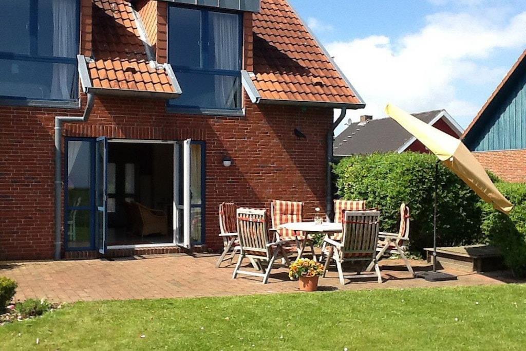 Ground floor: (Living room(single sofa bed, TV, oven), Kitchen(dining table, electric kettle, toaster, oven, microwave, dishwasher, fridge, freezer), bedroom(single bed, single bed)) On the 1st floor: (bedroom(double bed), bathroom(shower, washbasin, toilet, heating)) terrace, terrace, garden furniture, parasol
