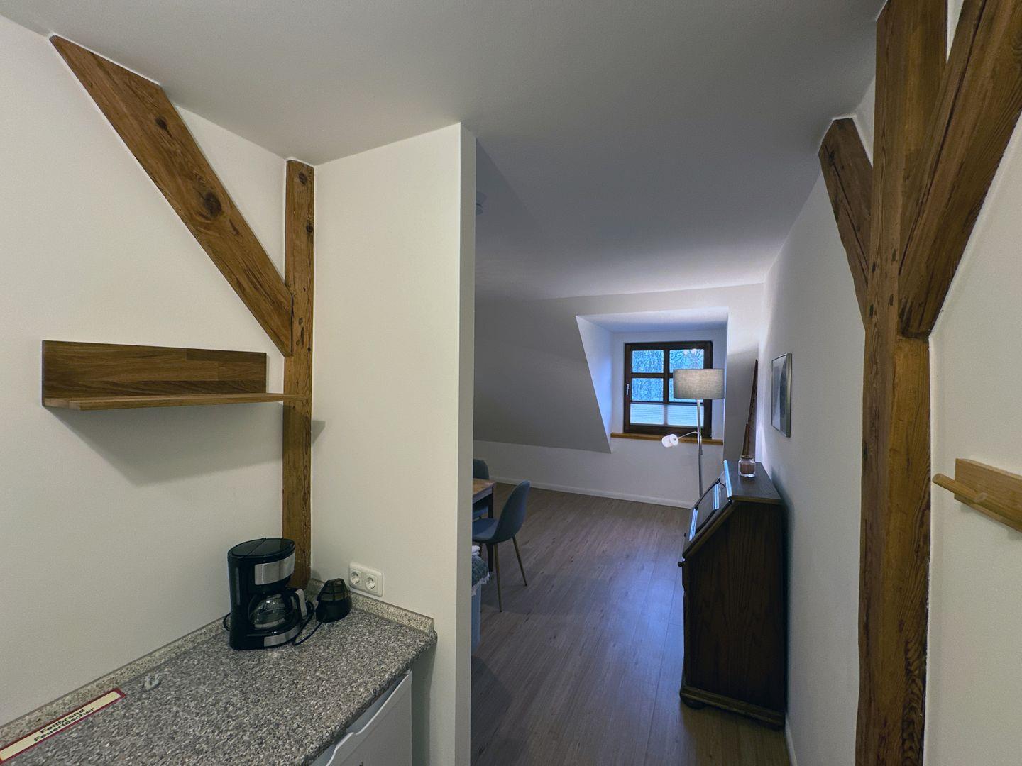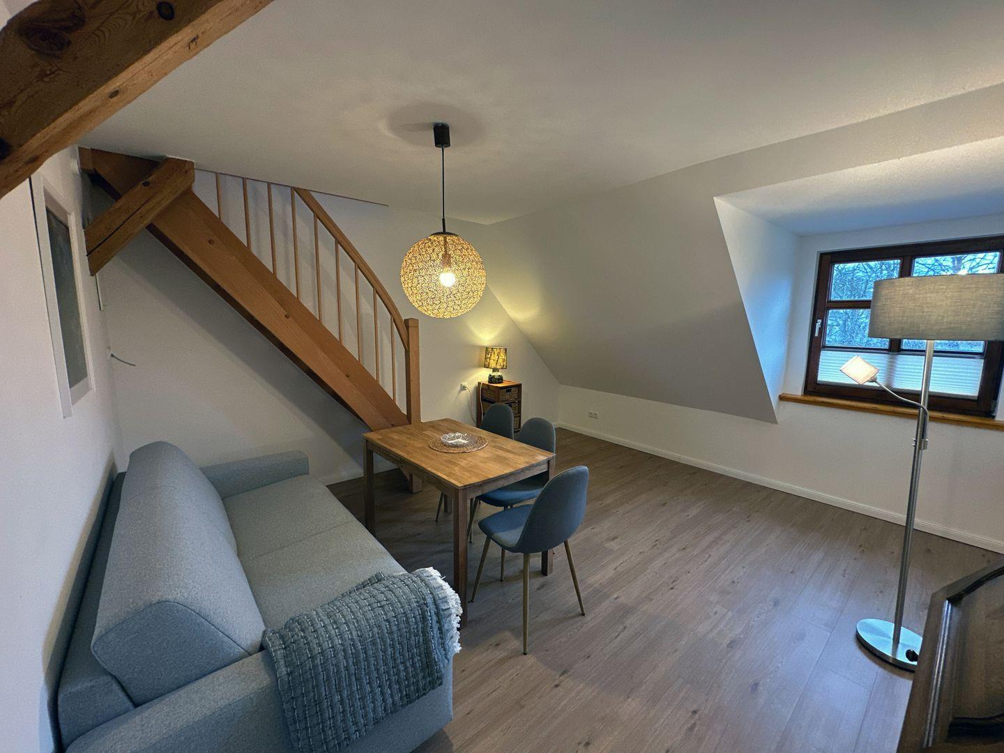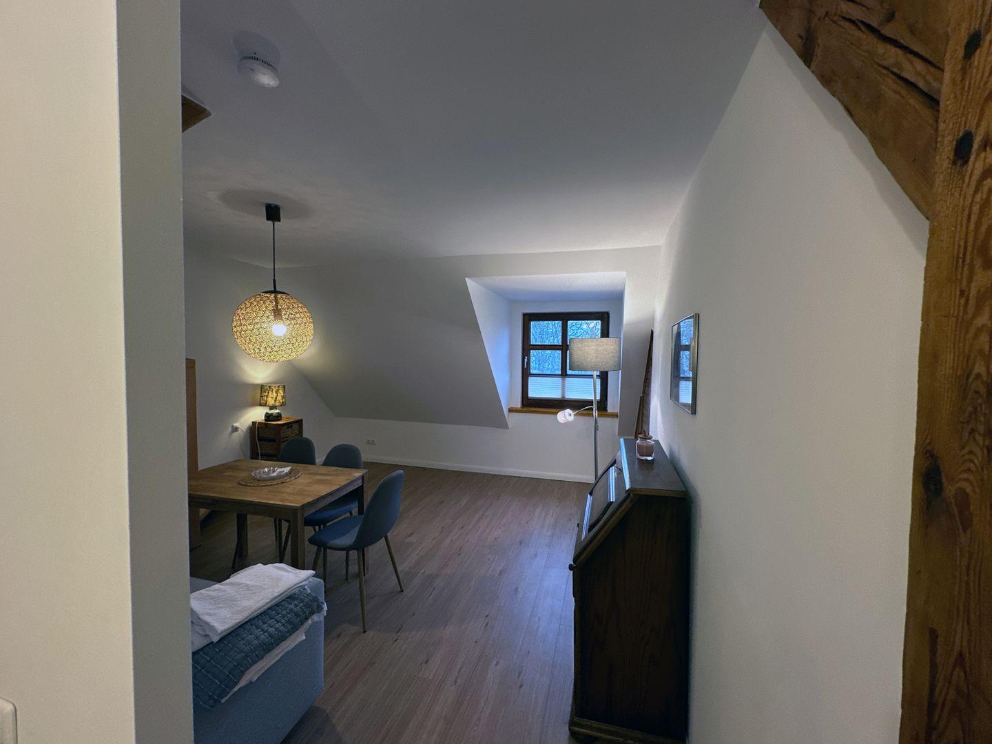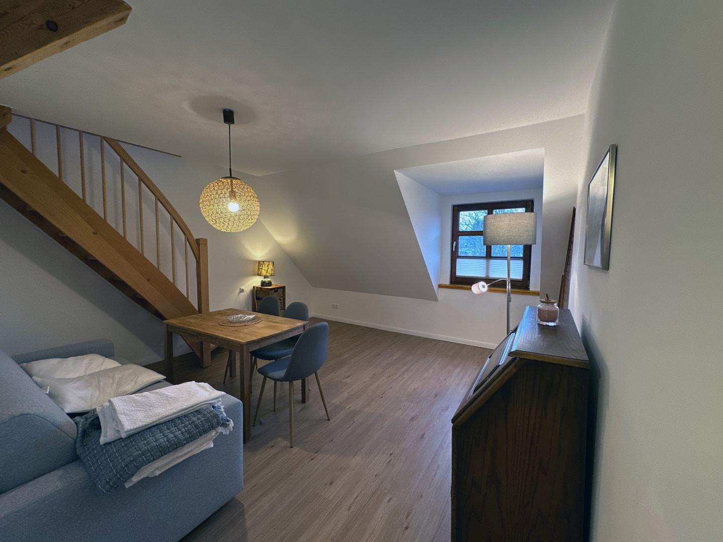 Die Wohnung verfügt über eine gemütliche Essecke und eine Schlafcouch und einen Smart TV Fernseher. Ein Kühlschrank sowie WLAN im Zimmer sind vorhanden. Die Ferienwohnung ist ein Nichtraucherzimmer.