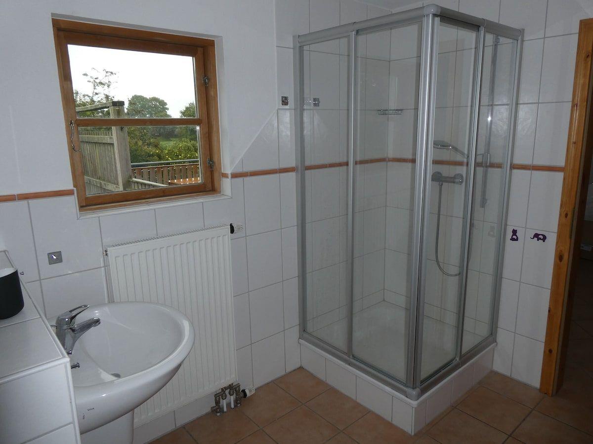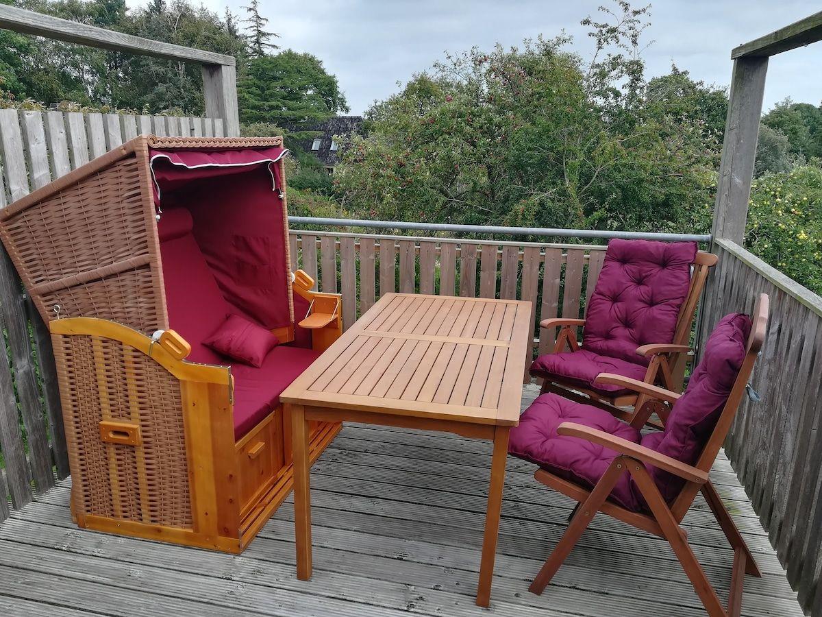 Freya ist eine 90 m² große Nichtraucher-Ferienwohnung im 1. Stock für bis zu 4 Personen mit 2 Schlafzimmern und 1 Bad. Offene Küche zum Wohnzimmer mit Ceranfeld, Backofen, Spülmaschine und Kaffeemaschine, dazu Kaminofen, WLAN und 3 SAT-TVs. Balkon sowie Garten mit Möbeln, Strandkorb und Holzkohlegrill. 1 kostenloser Privatparkplatz, eBike-Ladestation; Kinder/Babys willkommen, 1 Haustier erlaubt. Sandstrand ca. 1,5 km. Auto notwendig.