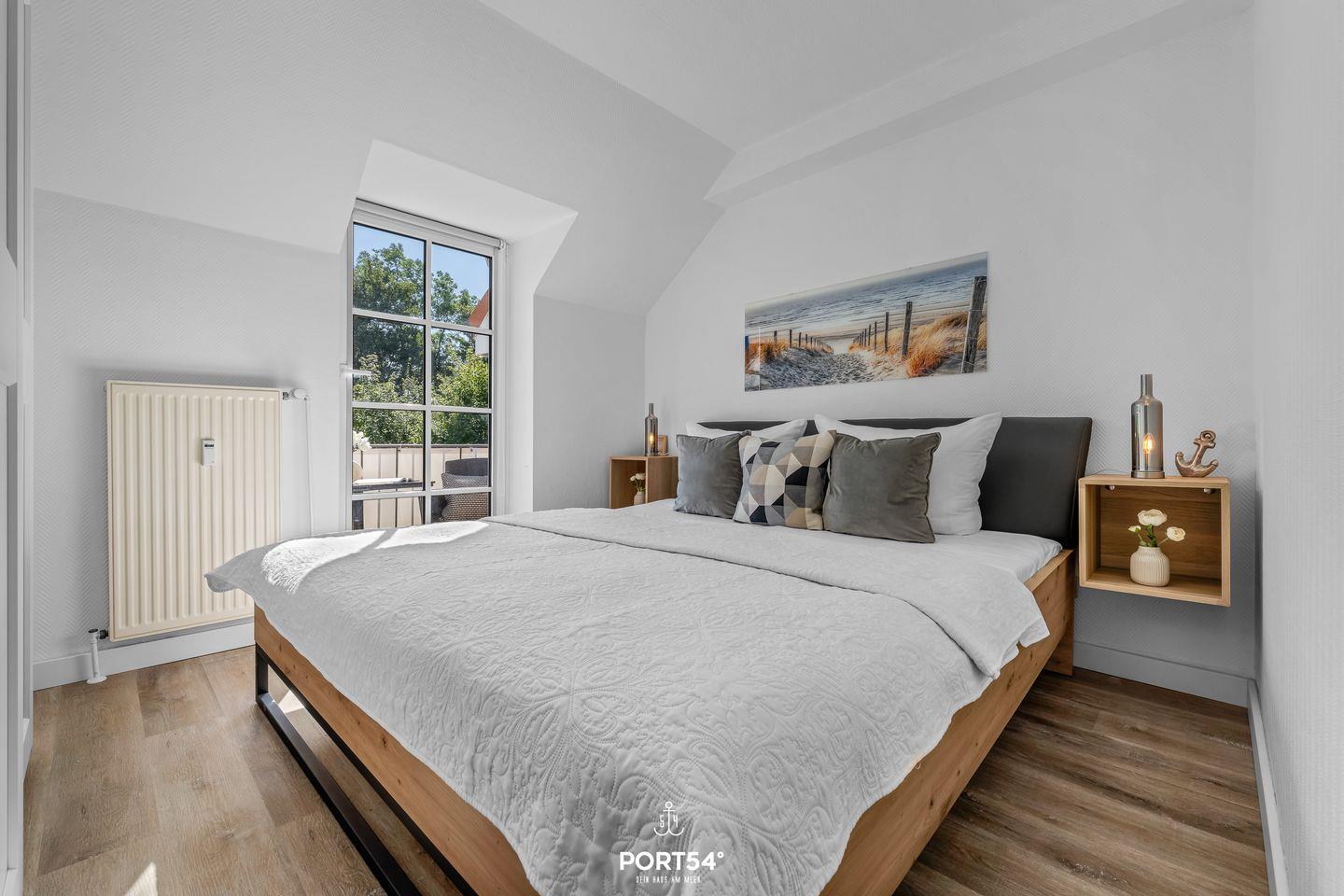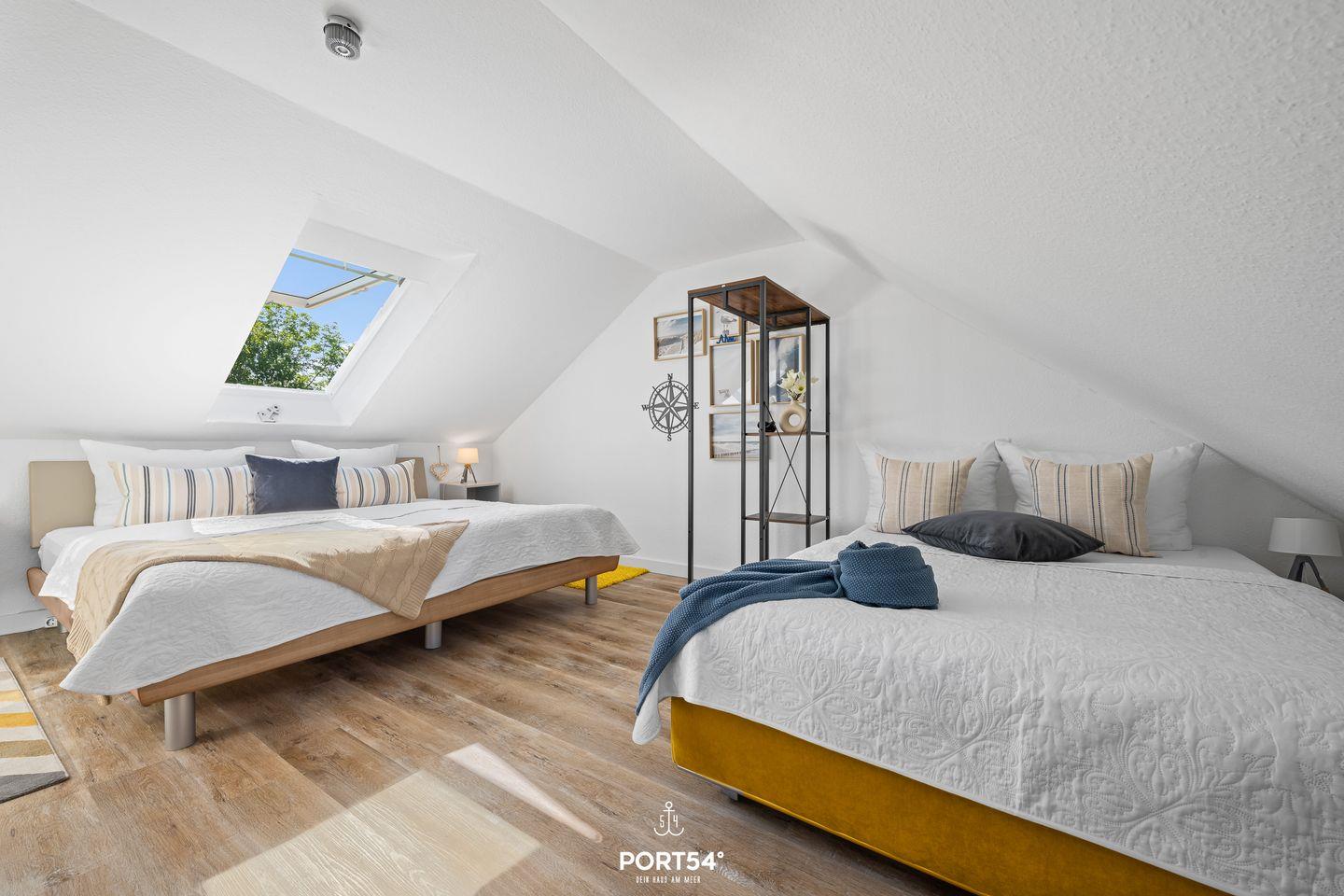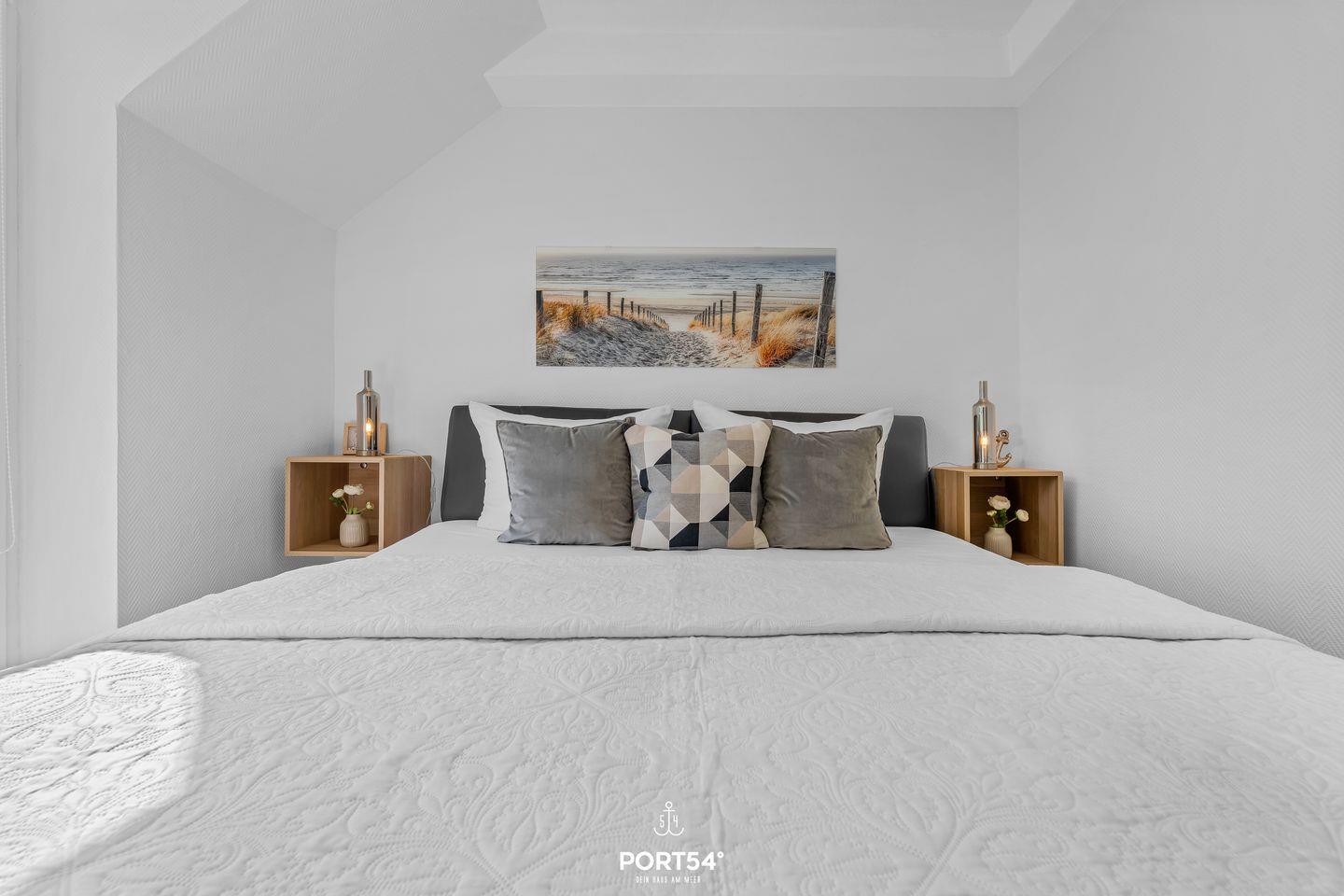 Die liebevoll eingerichtete Ferienwohnung überzeugt durch ihre moderne und gleichzeitig gemütliche Atmosphäre. Zwei separate Schlafzimmer ermöglichen Privatsphäre und erholsame Nächte. Während das eine Schlafzimmer im ersten OG mit einem Doppelbett ausgestattet ist (180x200cm), verfügt das zweite Schlafzimmer im Dachgeschoss über ein großes Doppelbett (200x200cm), sowie ein weiteres Bett für eine Person (140x200cm) und einen Fernseher.