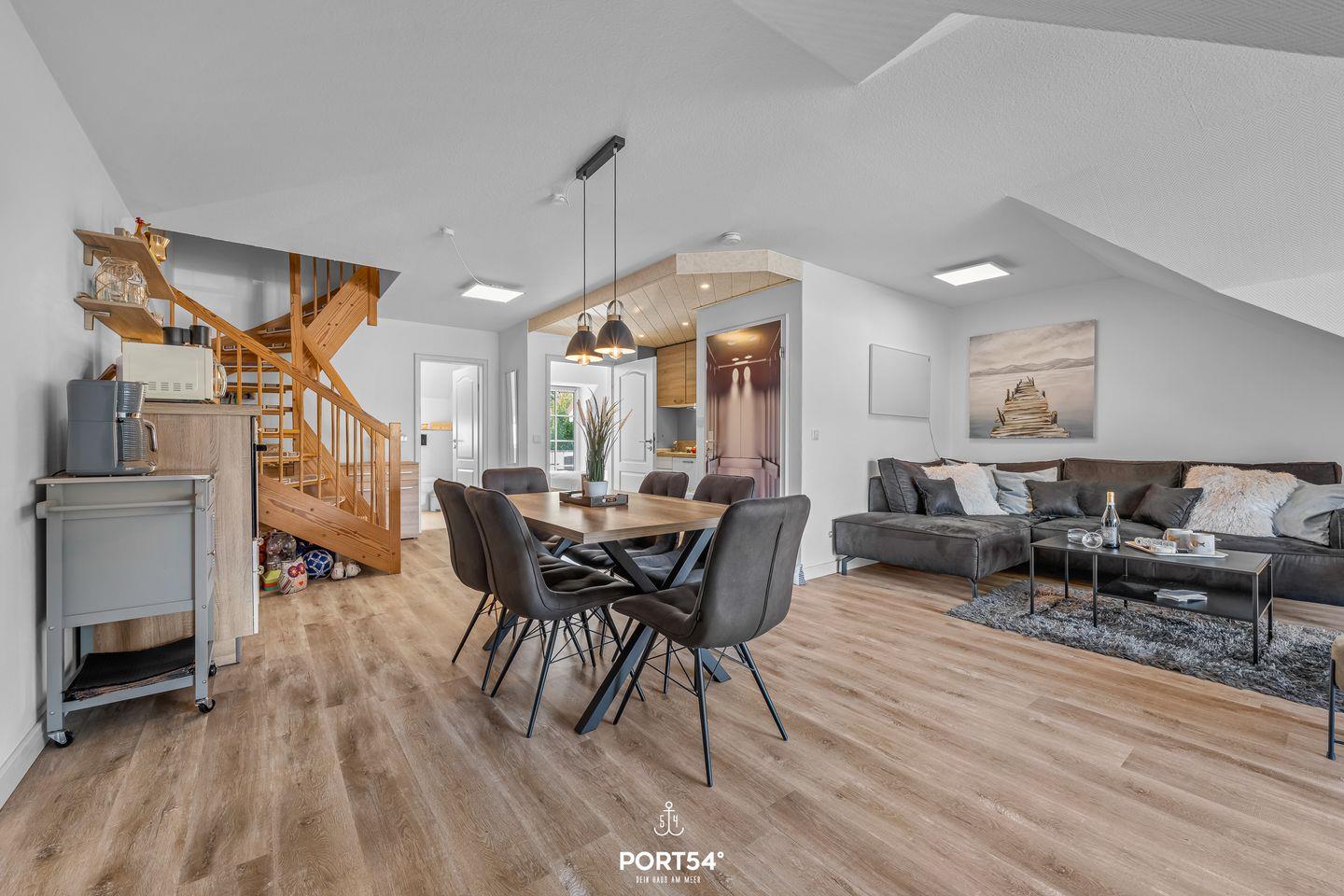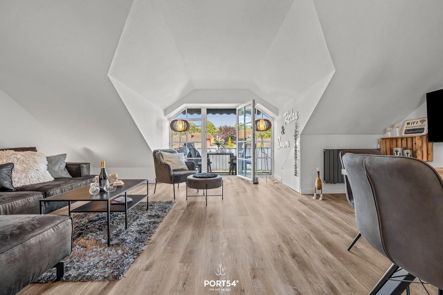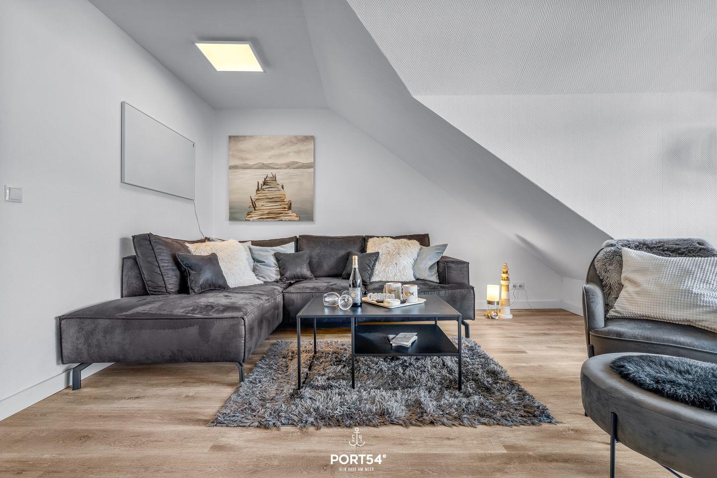 Die liebevoll eingerichtete Ferienwohnung überzeugt durch ihre moderne und gleichzeitig gemütliche Atmosphäre. Zwei separate Schlafzimmer ermöglichen Privatsphäre und erholsame Nächte. Während das eine Schlafzimmer im ersten OG mit einem Doppelbett ausgestattet ist (180x200cm), verfügt das zweite Schlafzimmer im Dachgeschoss über ein großes Doppelbett (200x200cm), sowie ein weiteres Bett für eine Person (140x200cm) und einen Fernseher.