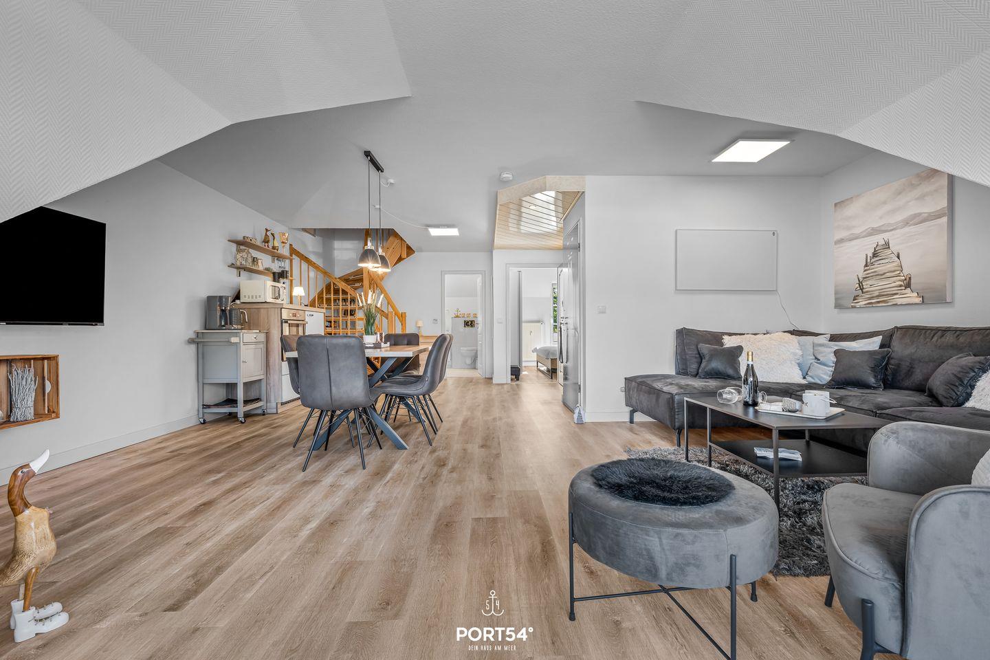 Der großzügige Wohnbereich mit Sofaecke, Sessel und Essbereich schafft ein behagliches Ambiente für entspannte Stunden. Die offen in das Wohnzimmer integrierte Küche ist zeitgemäß ausgestattet und erfüllt sämtliche Wünsche: Neben einer Spülmaschine, einem Backofen, einer Mikrowelle und einem Herd stehen Dir auch ein Kühlschrank mit Gefrierfach, Kaffeemaschine, Wasserkocher und Toaster zur Verfügung. Ein einladender Esstisch bietet Platz für gemeinsame Mahlzeiten.