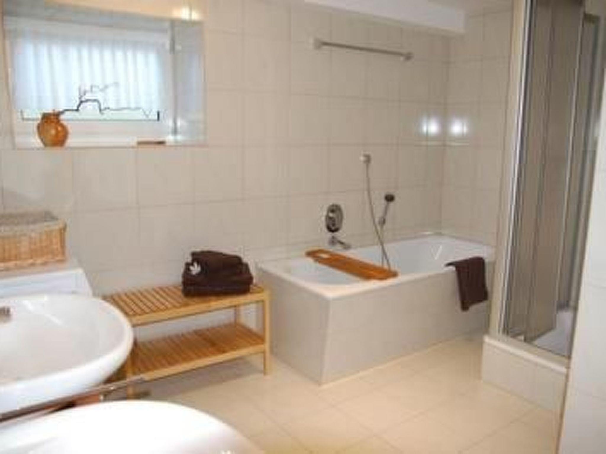 * bathroom with bathtub, shower, WC, 2 washbasins, washing machine