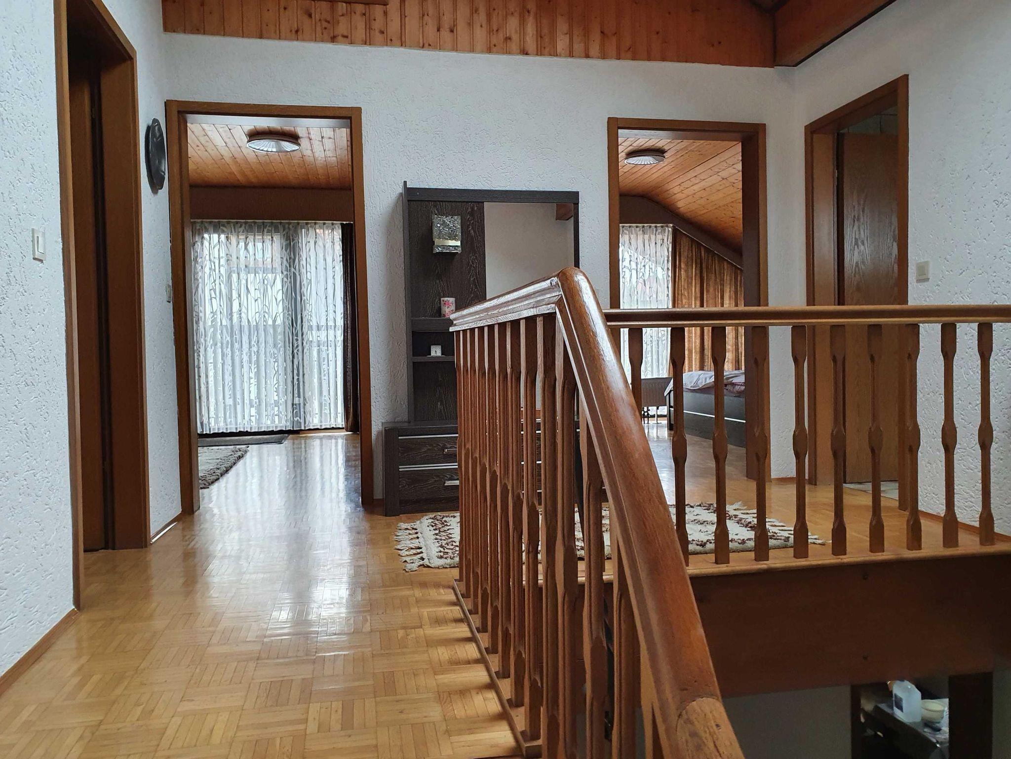 Das Ferienhaus im Landhausstil bietet drei separate Schlafzimmer, zwei haben Zugang zu einem großen Balkon. Großes Bad mit zwei Waschbecken, Dusche, Badewanne, Bidet und WC. Separate Dusche mit WC im Untergeschoß.
