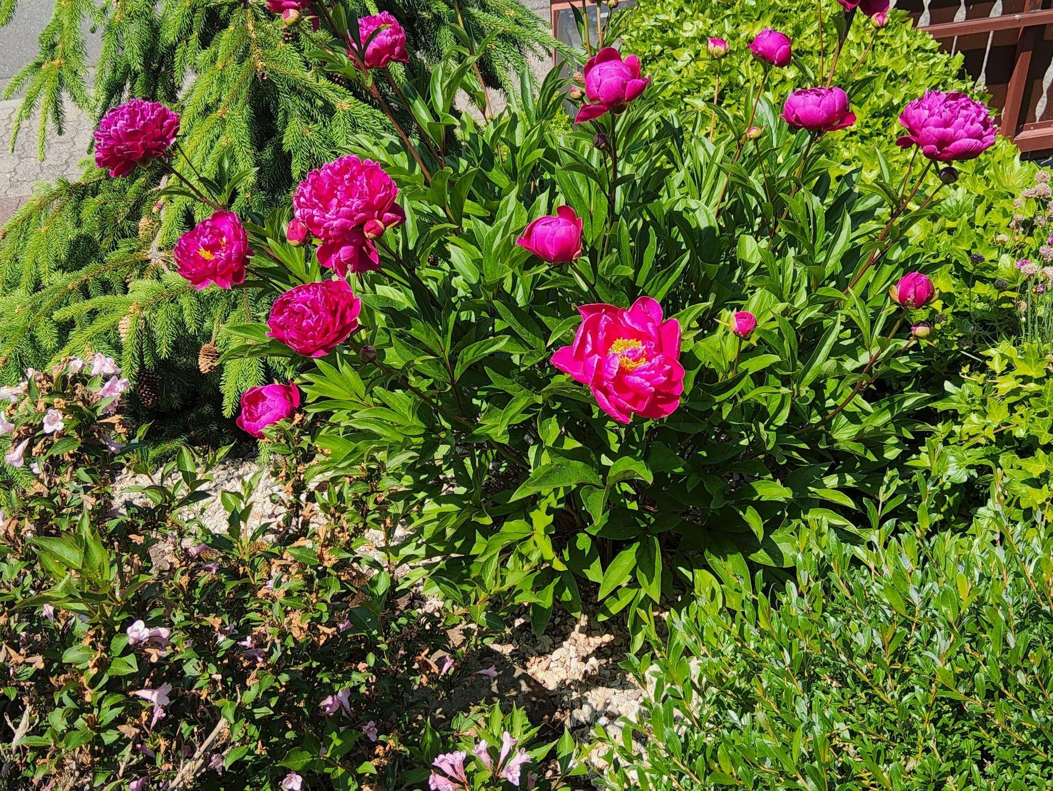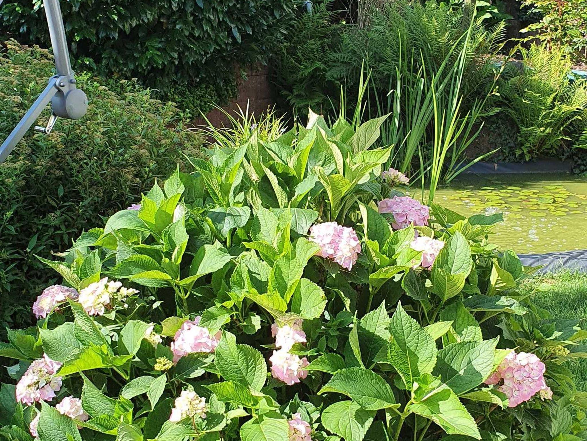 Großes Anwesen mit Terrasse. Im Garten gibt es eine Liegewiese mit Sonnenliegen, einen Teich mit Pflanzen und einen Gasgrill mit Grillmöglichkeit.