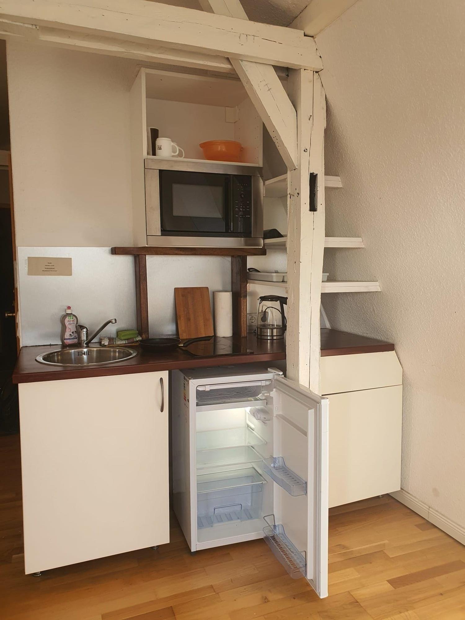 In der Küche befindet sich, ein Ceranherd, Kühlschrank, Kaffeemaschine, Mikrowelle, Wasserkocher und ausreichend Geschirr.
